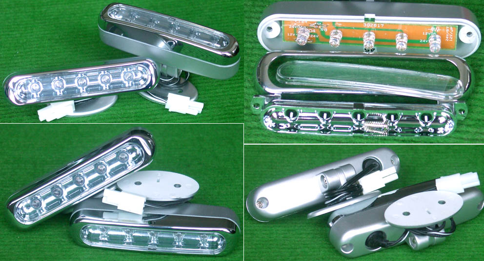 全新库存 | 内装5只高亮度LED管,电压范围DC10V-14.5V,12V电压时功率消耗约0.36W,做工精致,由于镀铬制品很难拍照,实际物品更漂亮,可旋转180度的底架,重量只有46克,安装可以锣丝或双面胶带随便贴在任何地方。 外形尺寸(单位毫米):长103x宽23x深30(连支架58) |