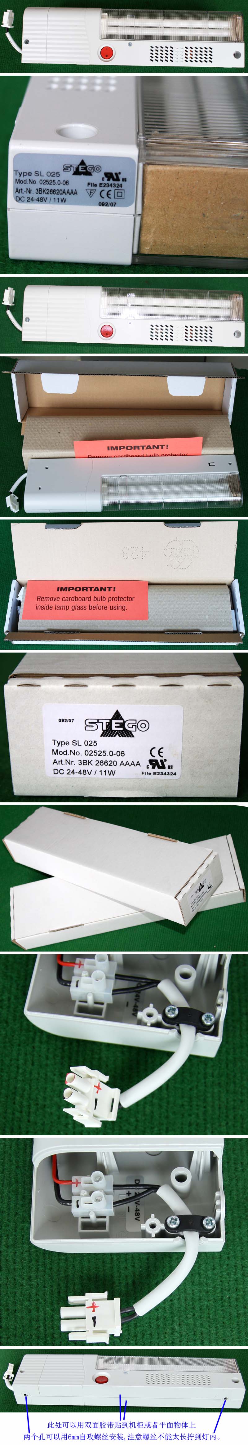 欧洲产STEGO DC24V-48V 11W白光荧光灯。 包装盒外型尺寸:390毫米x100毫米x58毫米,重量约520克。 |
