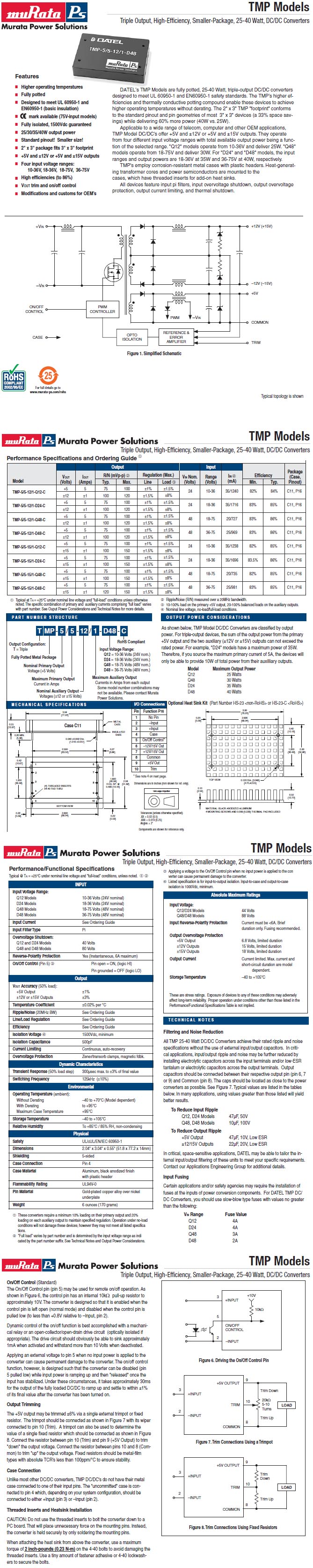 | DATEL TMP-5/5-15/1-Q48-C 48V转5V 5A正负15V 1A电源模块AV067 | 拆机 | 外形尺寸;长78x宽52x厚13毫米,重量约133克。 |
