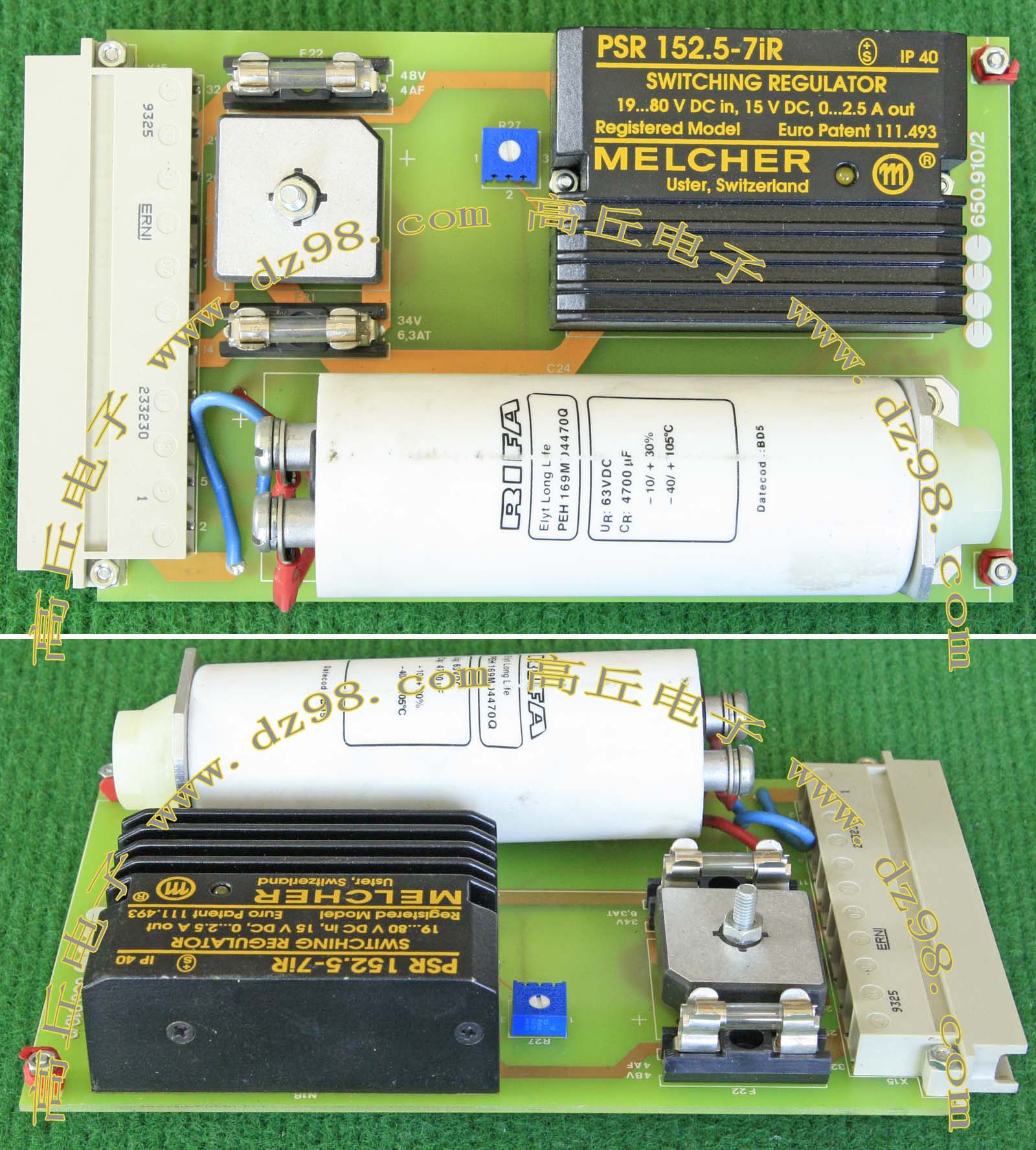 实物看图,板上12V模块、桥堆、电容各1只,整板重量约340克。 PSR152.5-7R输入电压范围19V-80V,输出电压15V,电流2.5A。 |