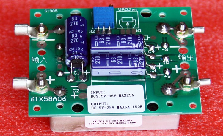 已组装为成品的模块电源,包含必须的输入和输出电容(元件根据不同批次变更)。装有多圈微调电位器,对应输出电压从5V-25V可调。简单接线:输入2线接直流电源(正负极性不可接反),输出2线接负载。 |