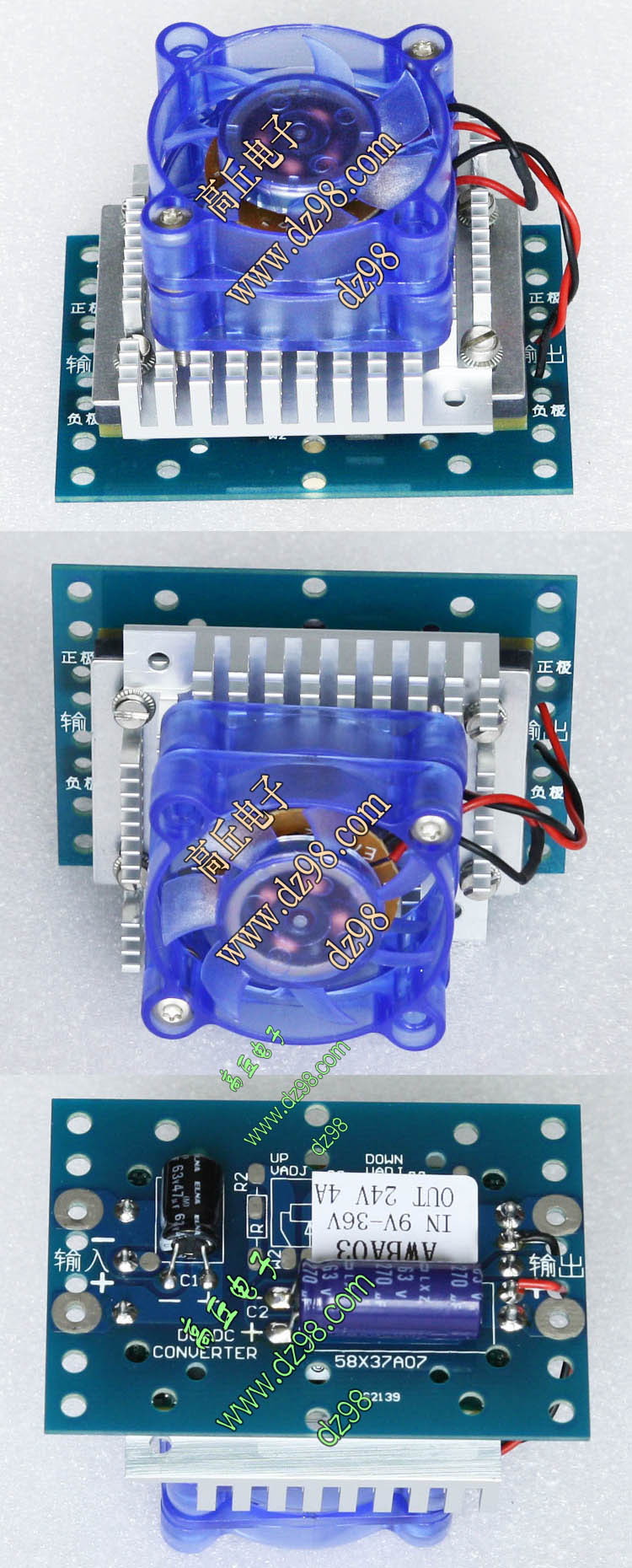 已组装为成品的模块电源,包含必须的输入和输出电容(元件根据不同批次变更),装配调压电位器,对应输出电压从0V-28V可调。输入电压高于19V启动,高于20V满载输出,简单接线:输入2线接直流电源(正负极性不可接反),输出2线接负载。