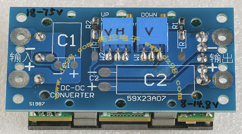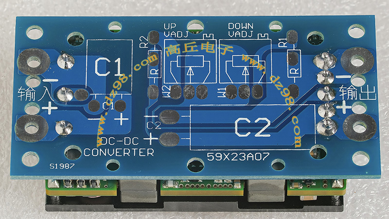 已组装为成品的模块电源,包含必须的输入和输出电容(元件根据不同批次变更),装有微调电位器,对应输出电压从0V-14V可调。