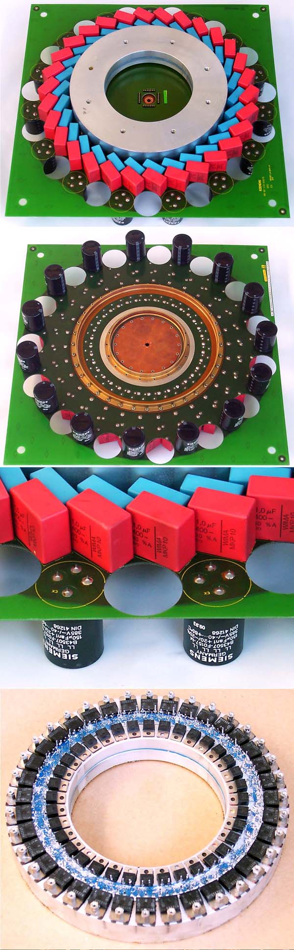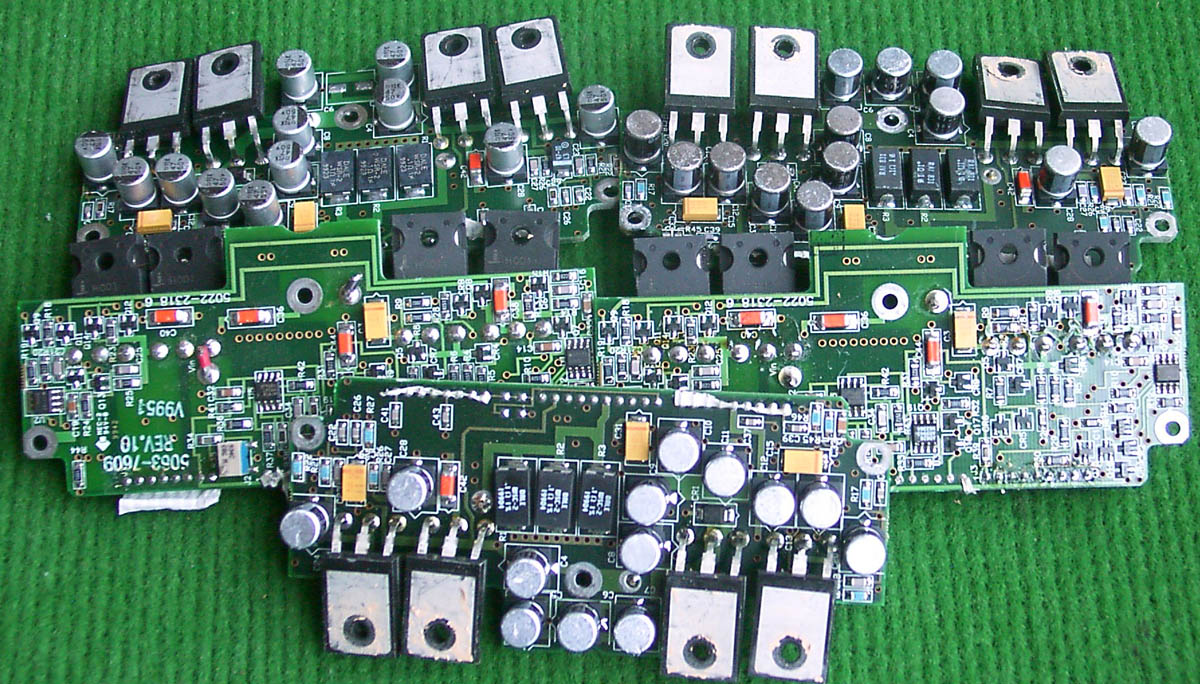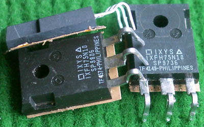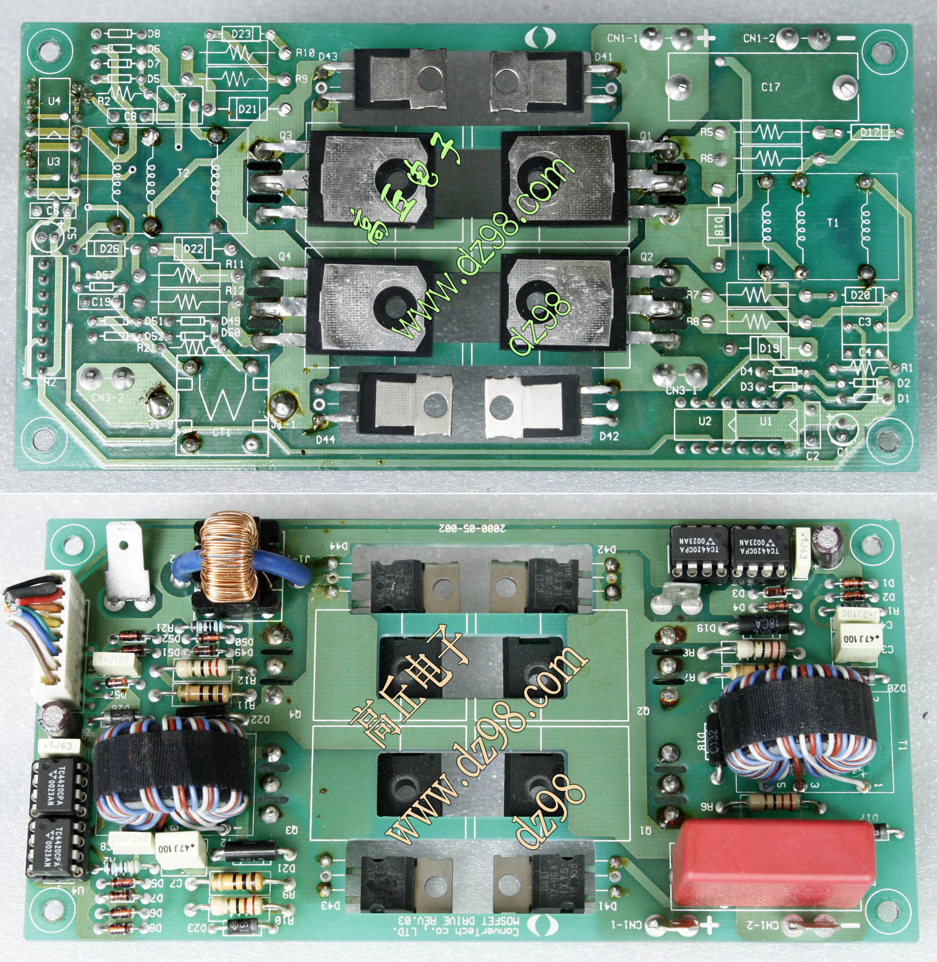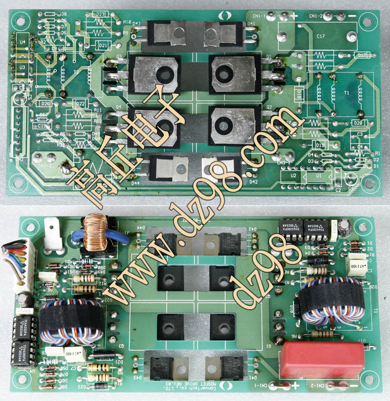 拆机品,连线路板,板上装4只IXFH32N50功率管、4只DSEI12-06A快恢复二级管、4只TC4420驱动器。 |