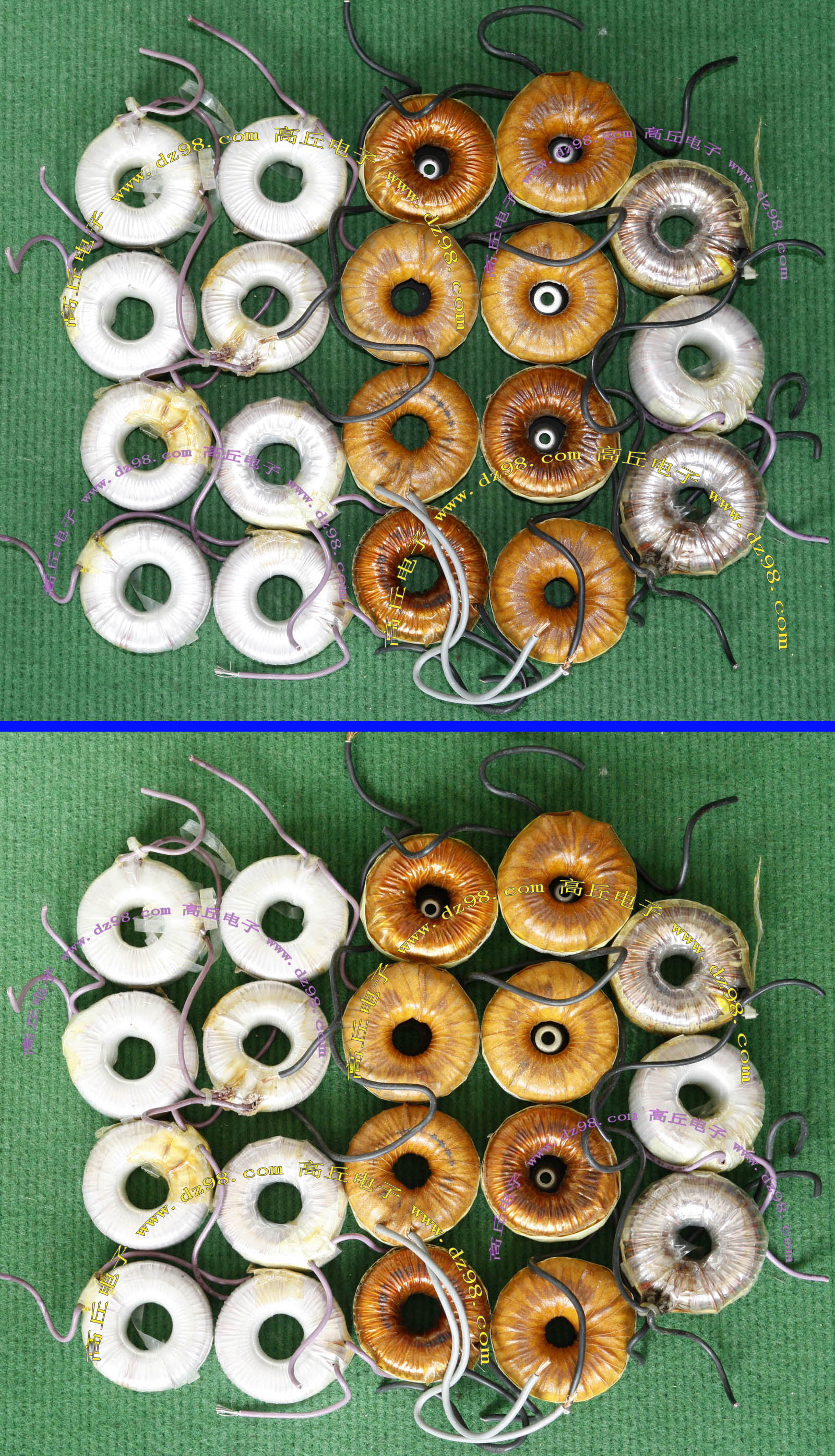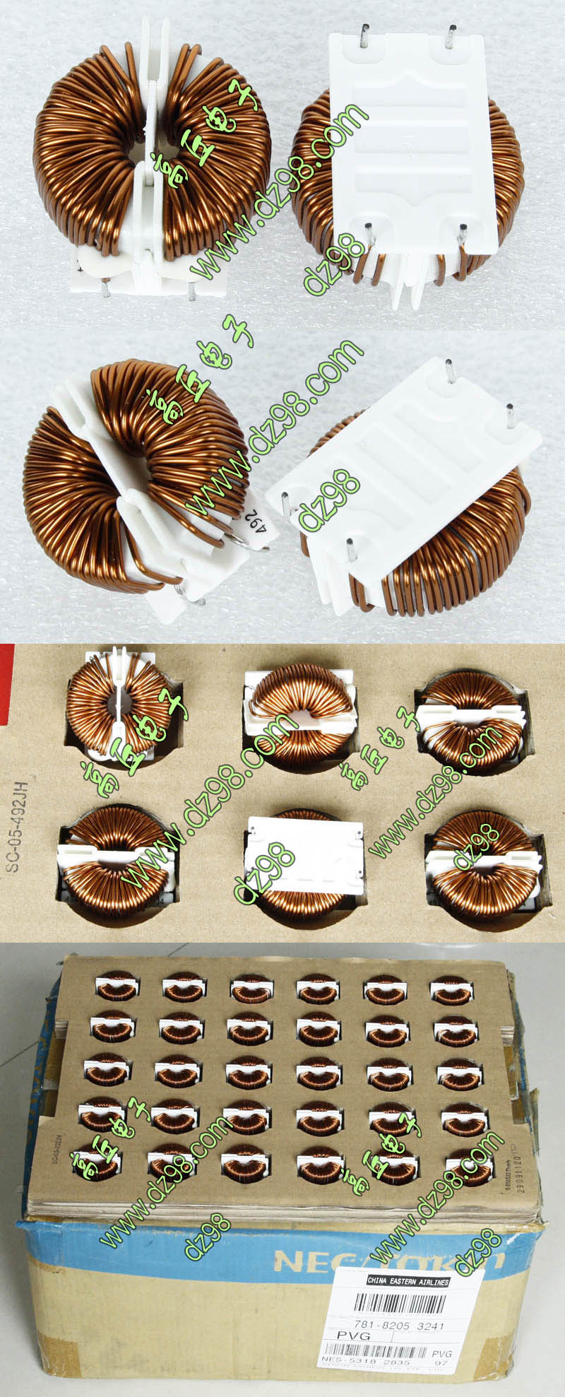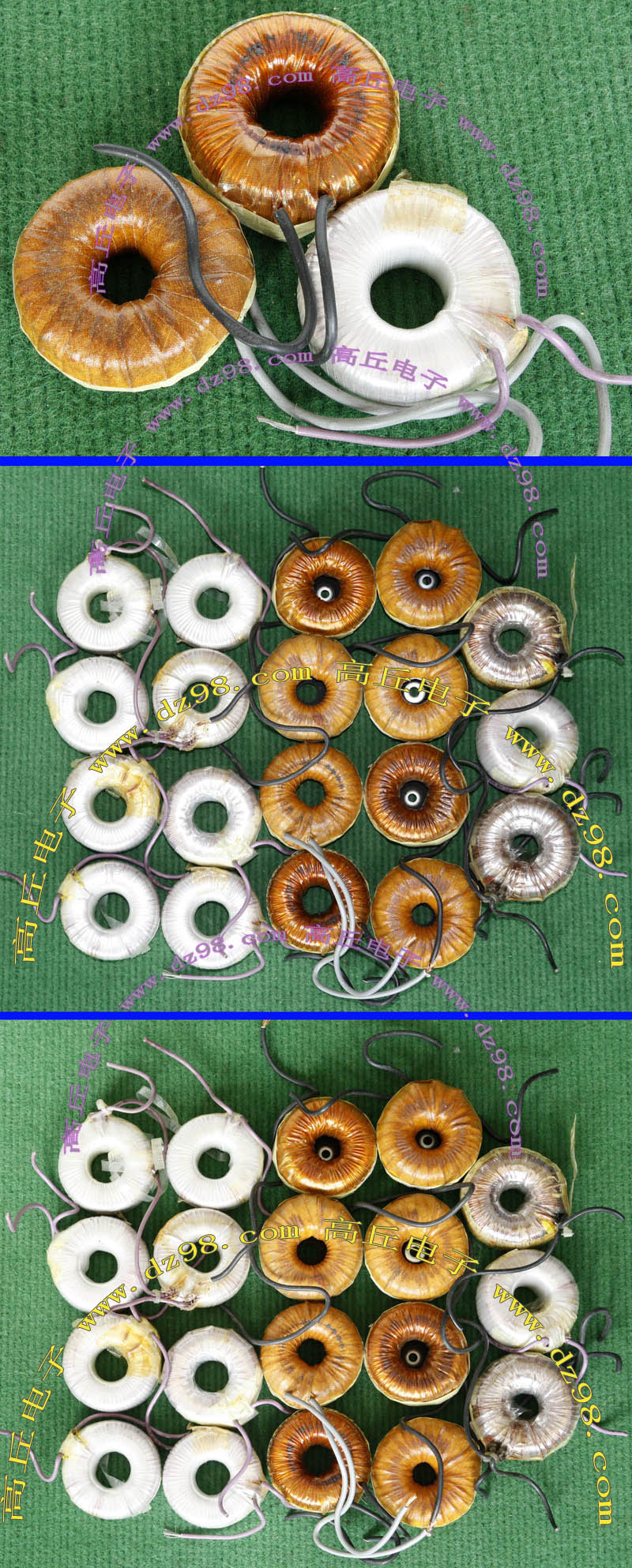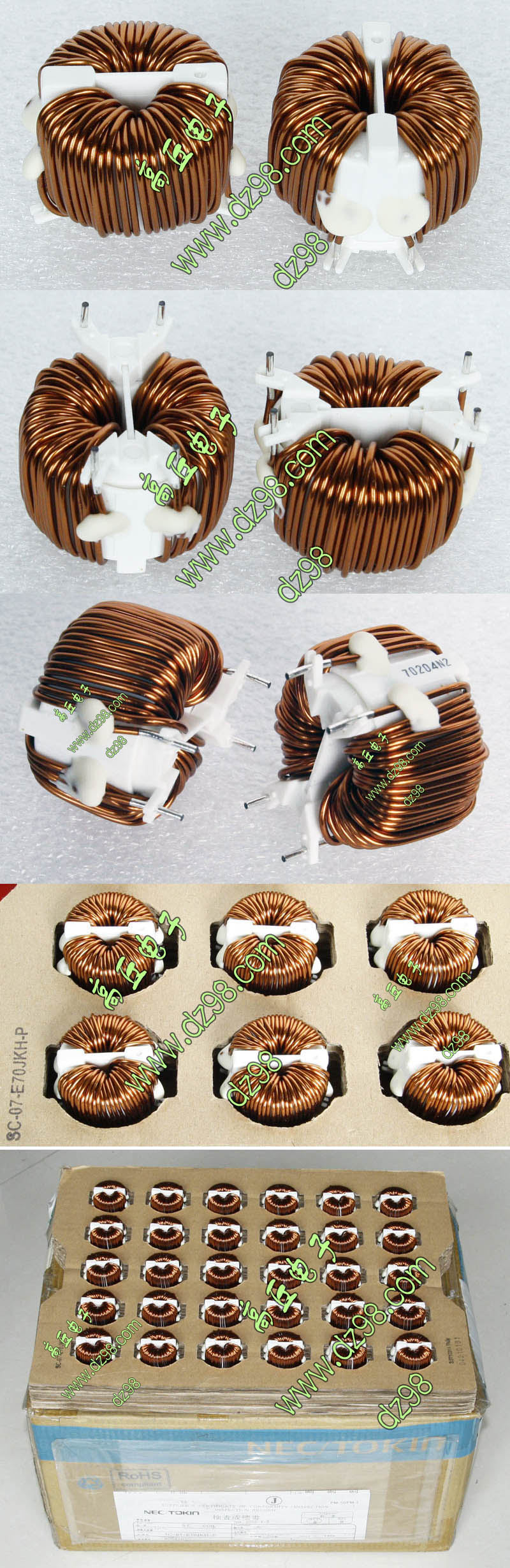全新 | 采用直径18.5mm绿漆磁环绕制,漆包线直径1.33mm,重量约12.5克。外形大概尺寸:22x22mm,高度13mm,同绕组脚距12.5mm、异绕组脚距10mm和5mm。 |
