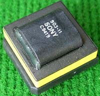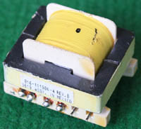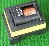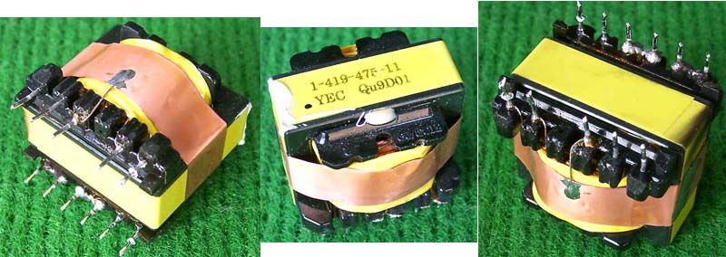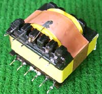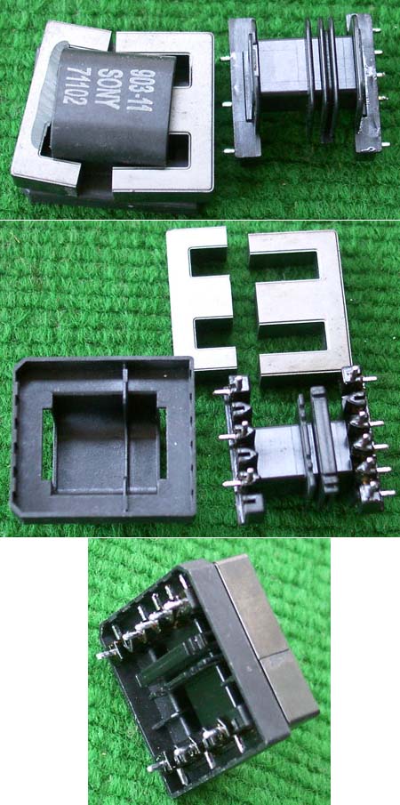 拆机件 | 220V开关电源拆下,本变压器如果数据不符合要求,可以拆开重绕线圈,包括线圈骨架都完好无损。外形尺寸33mm x 30mm,高度20mm,EE型铁痒体磁芯的中间舌尺寸是7mm x 9mm。总重量约32.5克。初级线圈数140(由20股细漆包线拧合并绕,估计承受电流约0.4A),磁芯并合中间舌约有0.5毫米空气间隙。拆去铜线的放大图片。 |