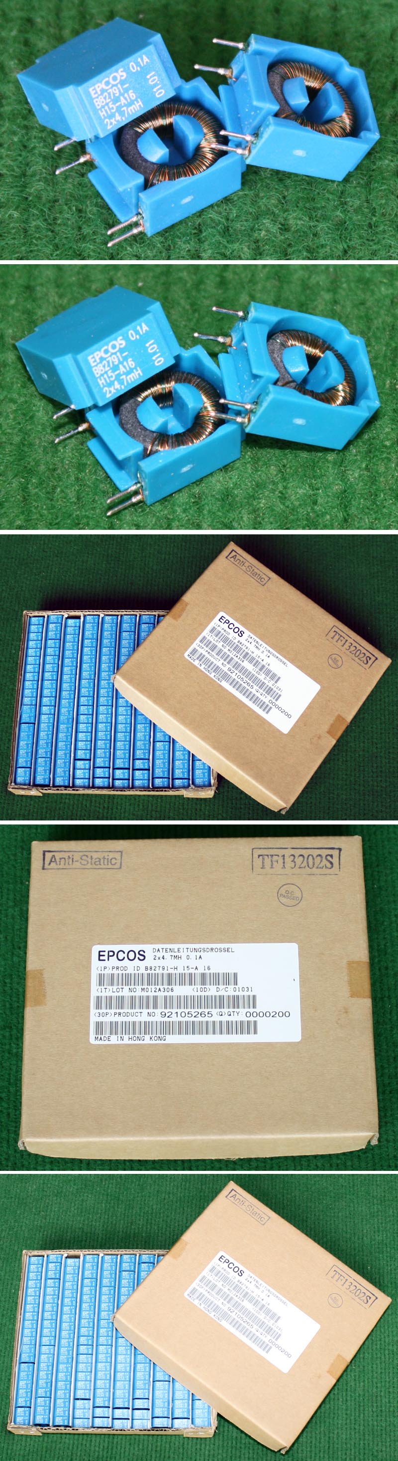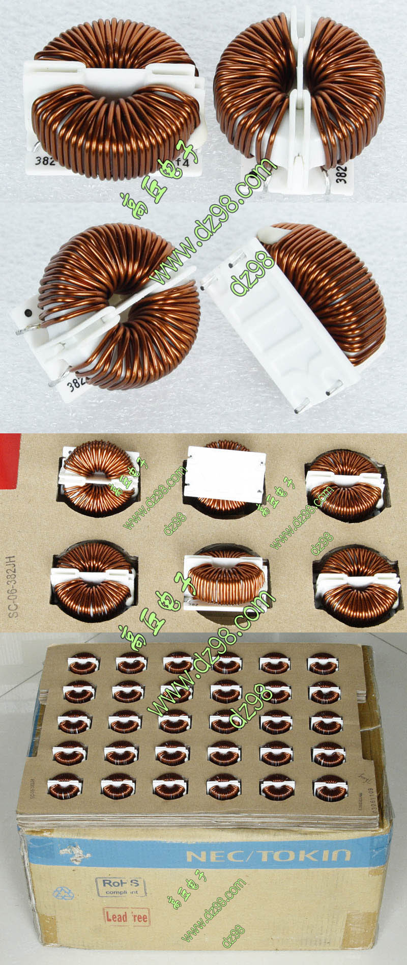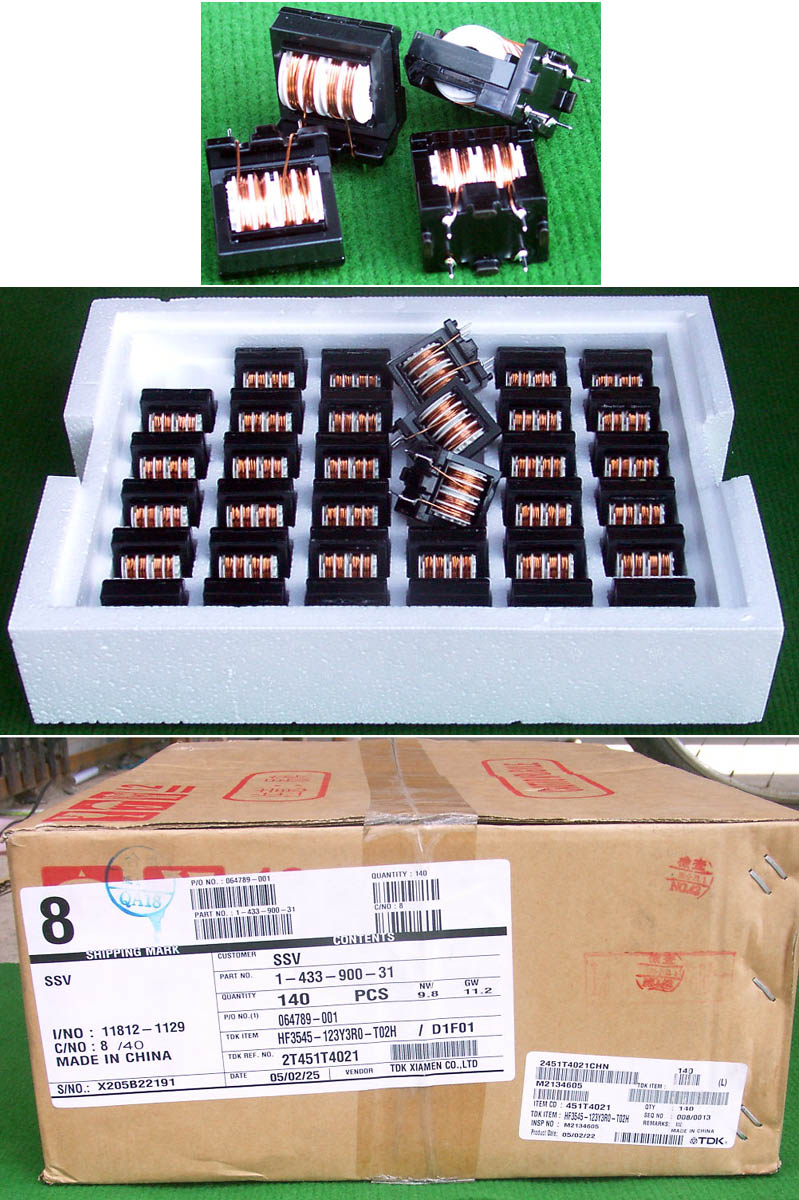 全新库存 | 开关电源输入同相波滤电感,双组线圈,电感量约18mH,漆包线径0.86mm,生产厂日本TDK,产地中国,原包装,每箱140只。 外形体积:36.3毫米x25毫米x高43毫米,重量约68克。异绕组脚距20.32mm,同绕组脚距15.24mm, |