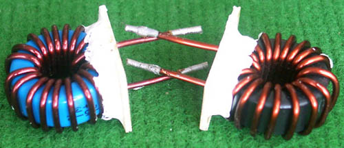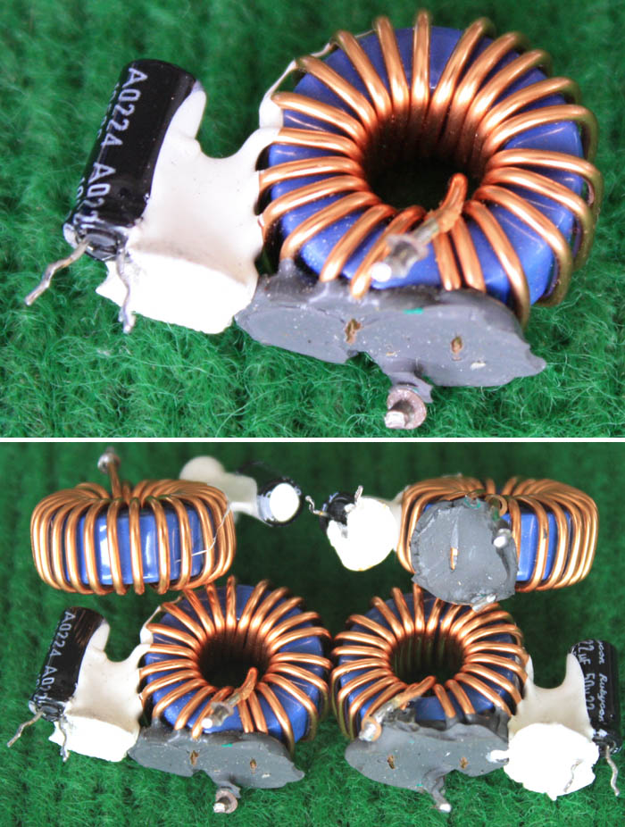 拆机件 | 采用直径23.5mm非晶磁环绕制,此类电感不是标准电感,其电感量每只误差很大的,漆包线直径1.05mm,重量约18克。外形大概尺寸:直径28mm,高度17mm,同绕组脚距22.86mm、异绕组脚距8.89和6.35mm。 |