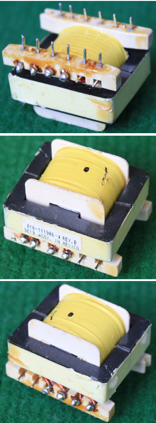 拆机件,实物如图,漆包线直径1.38毫米。外形尺寸;32x29x高14毫米,重量约14.5克。 同绕组脚距12.5mm、异绕组脚距20和5mm。 |