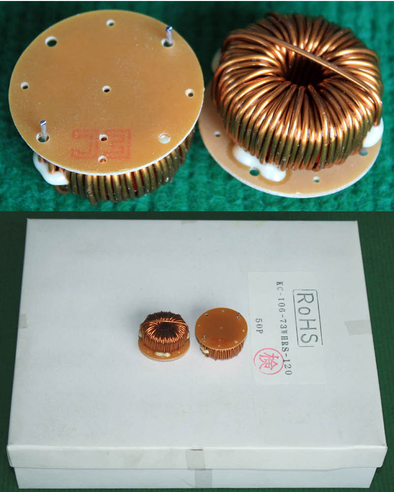 KC-106-73WHRS-120电感器 全新原装品,产地:日本,每盒包装数量50只,电感量约72uH,漆包线直径1.2mm,磁环直径27.5mm,重量约53克。外形大概体积:直径36mm x 高20mm。 |