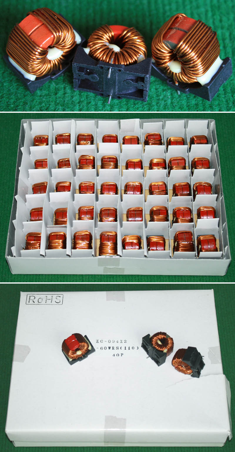 KC-094X2-60WRS(110)电感器 全新原装品,产地:日本,每盒包装数量40只,电感量约57uH,漆包线直径1.1mm,三红一黑磁环,磁环直径24mm,重量约51克。外形大概体积:34.5mm x 23mm x 高30.5mm。 |