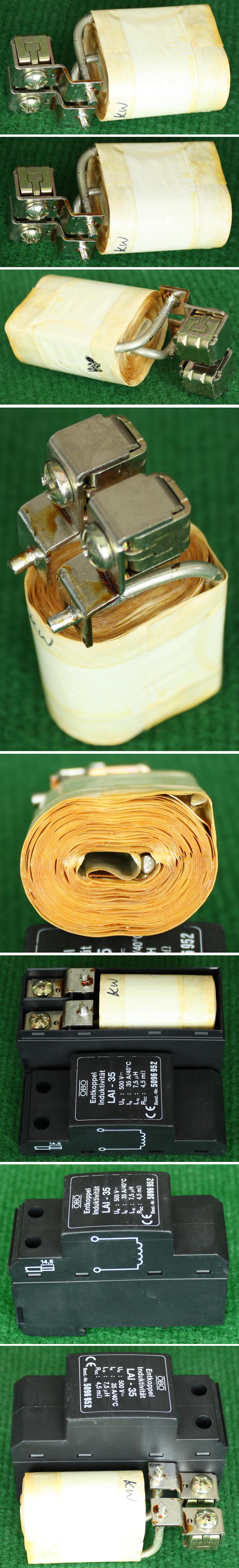 | 5uH 空心电感 防雷退藕滤波电感器BIA347 | 拆机件 | 从防雷箱内拆下,采用1.9x2.6毫米矩形铜条漆包线绕制,电流通过量30A,纯铜空心电感。整体尺寸:直径35毫米,高度27毫米,重量约55克。 | 单价7元。 |