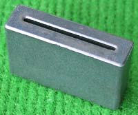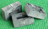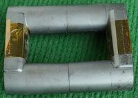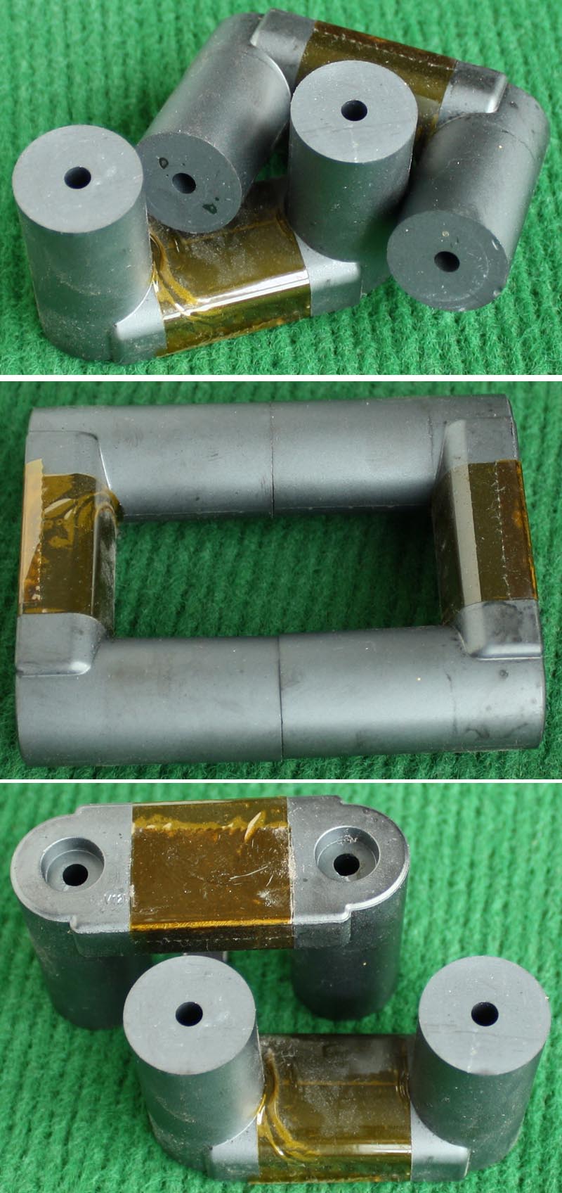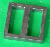 拆机件 | 外形尺寸;59mm x 38mm x 14.9mm、每个内框孔尺寸21.3mm x 6.5mm。 E型和I型并合使用,原先用在开关电源输出滤波,铜条从2个中间孔穿过。重量每约103克。 |