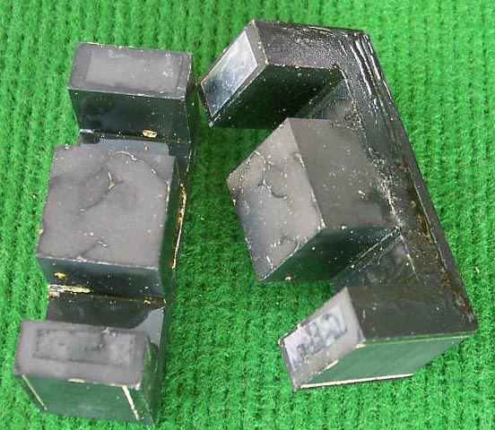 拆机件 | 外形尺寸;38.3mm x 25.2mm x 13mm、内框孔尺寸22.7mm x 8.2mm。 两只粘在一起成为整体(拆不开),原先用在开关电源输出滤波,铜条从中间穿过。重量每约45克。 |