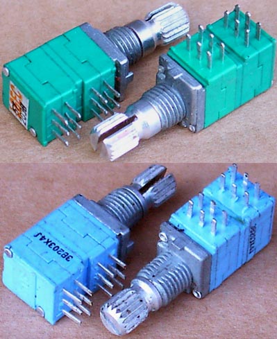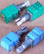全新品,国外电子企业用后余货,厂牌ALPS,旋扭柄按下时一测2只引脚通,放开断;旋转阻尼手感结构,转动时使一侧3只引脚与两边引脚实现通断功能(连续旋转=连续的一通一断),内部结构请看下图右边这个。 |