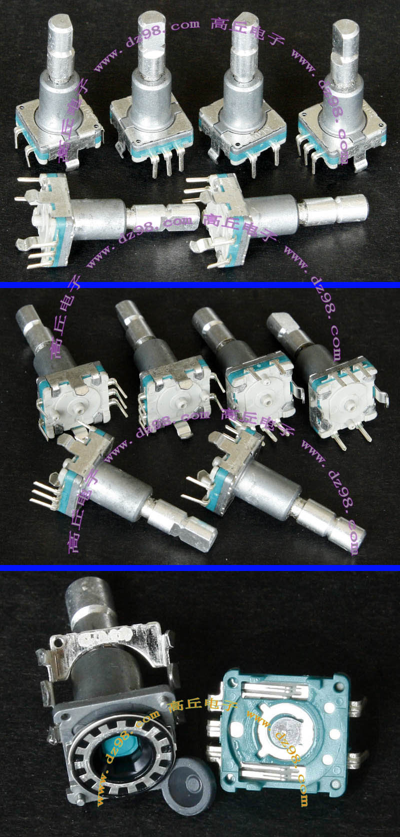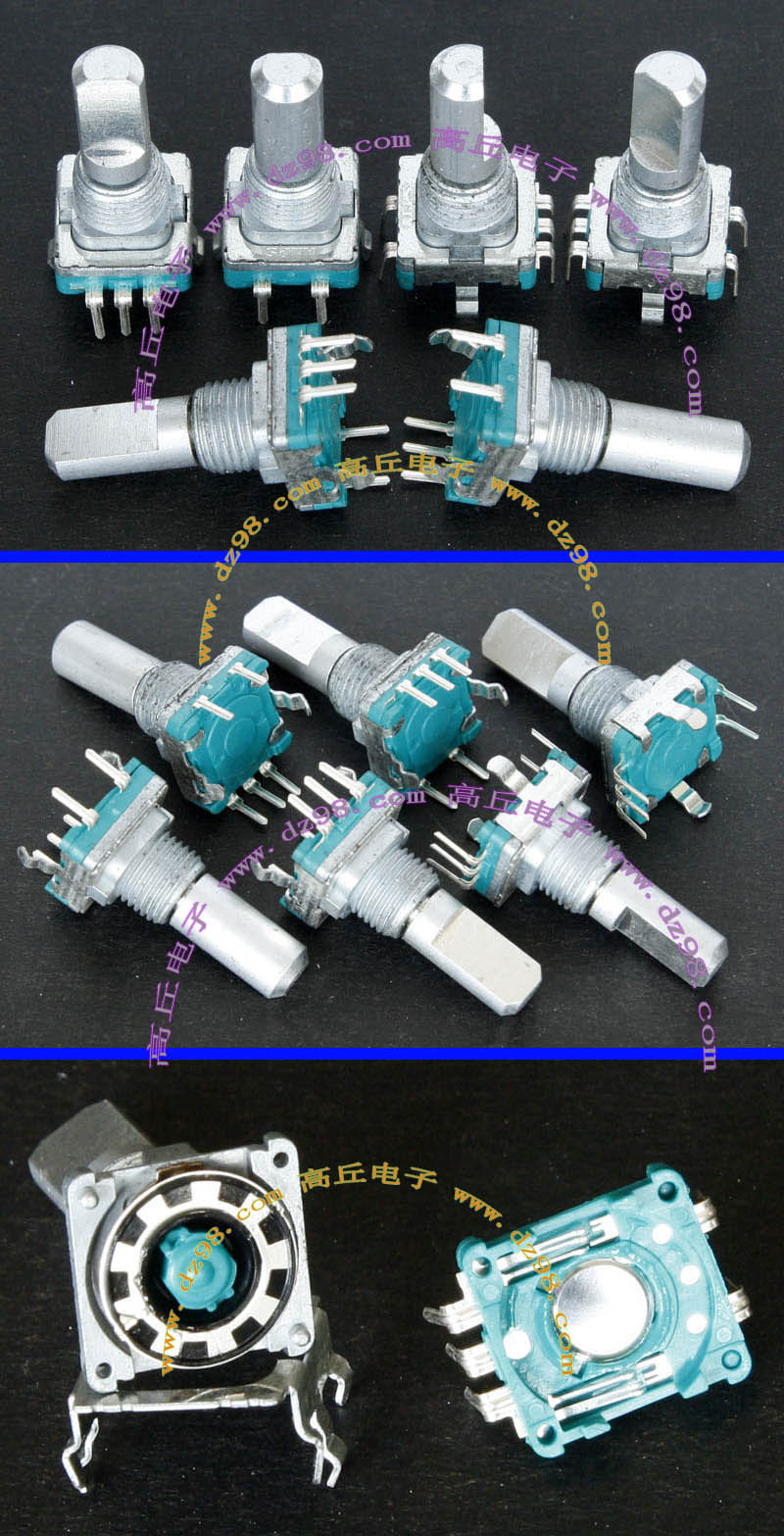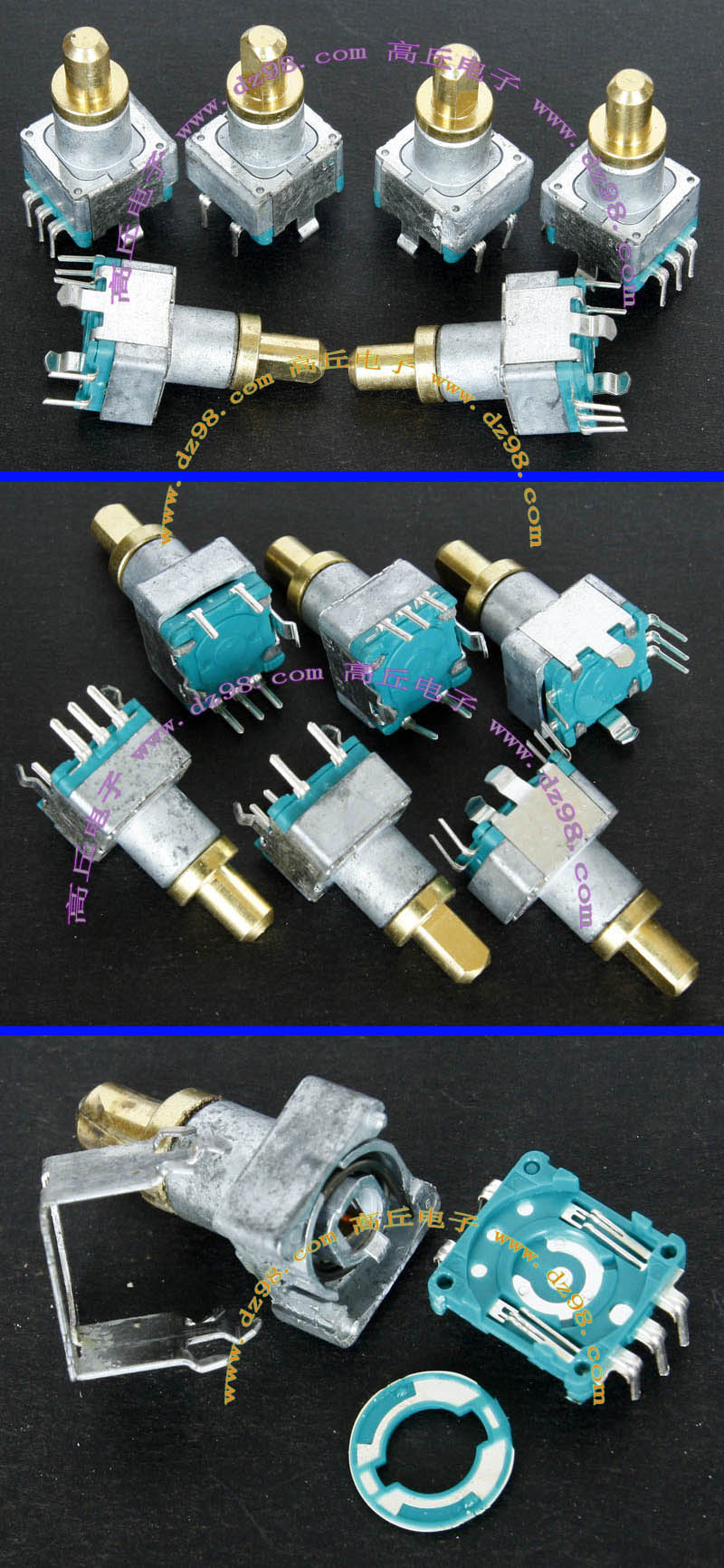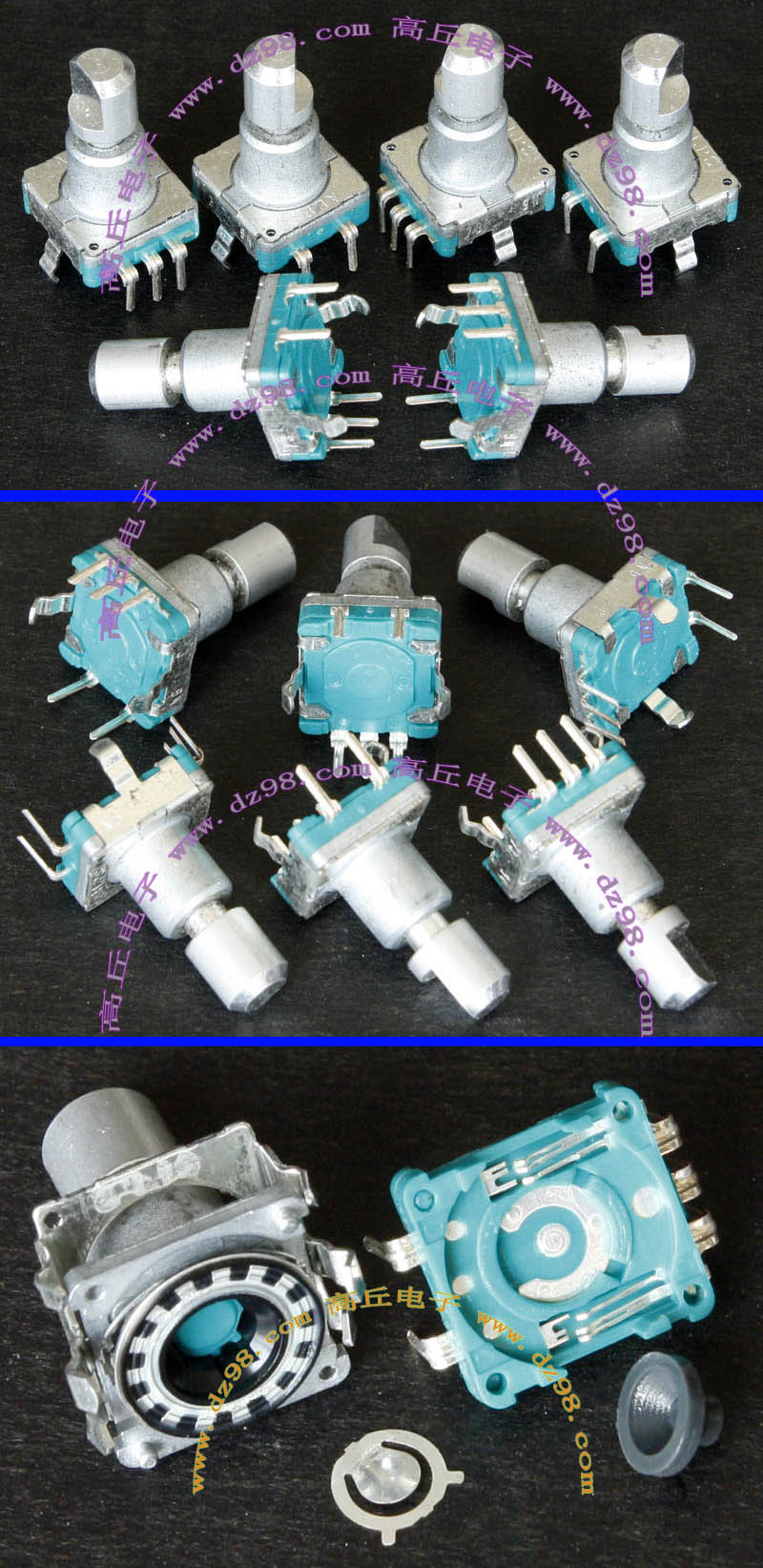 全新品,国外电子企业用后余货,厂牌ALPS,旋扭柄按下时一测2只引脚通,放开断;旋转步进手感结构,转动时使一侧3只引脚与两边引脚实现通断功能(连续旋转=连续的一通一断),内部结构请看下图中间这个。 |