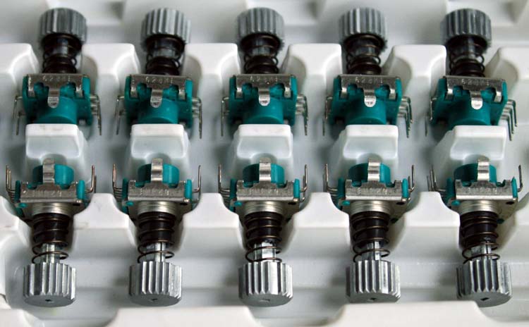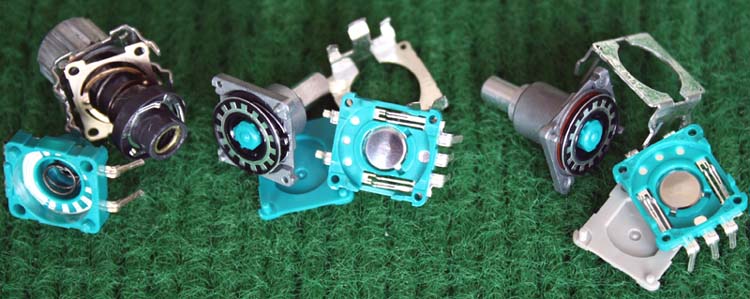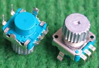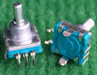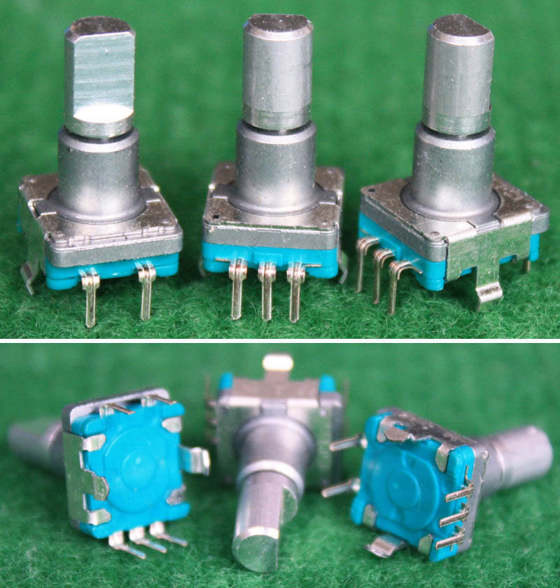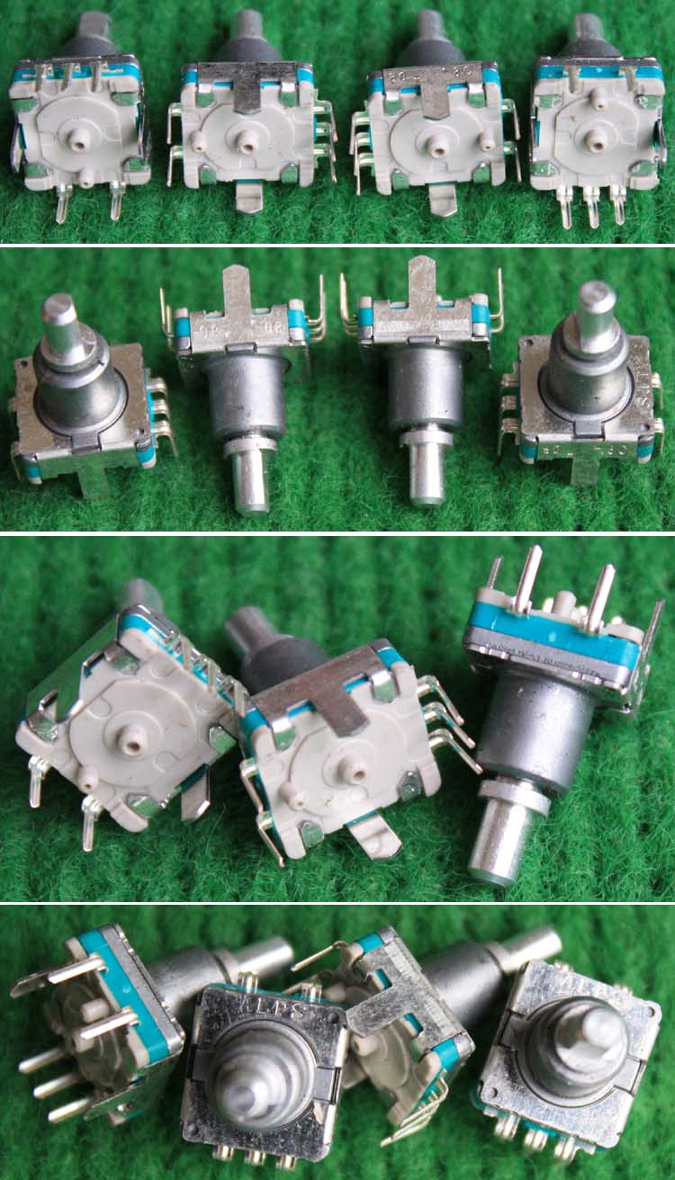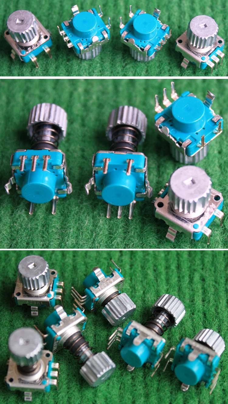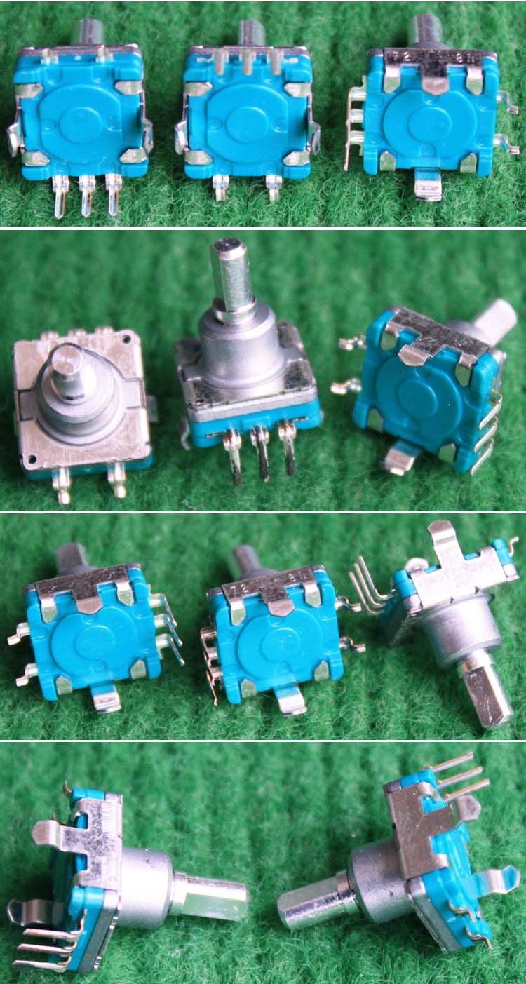 全新品,国外电子企业用后余货,厂牌ALPS,旋扭柄按下时一测2只引脚通,放开断;旋转步进手感结构,转动时使一侧3只引脚与两边引脚实现通断功能(连续旋转=连续的一通一断),内部结构请看下图中间这个。 |