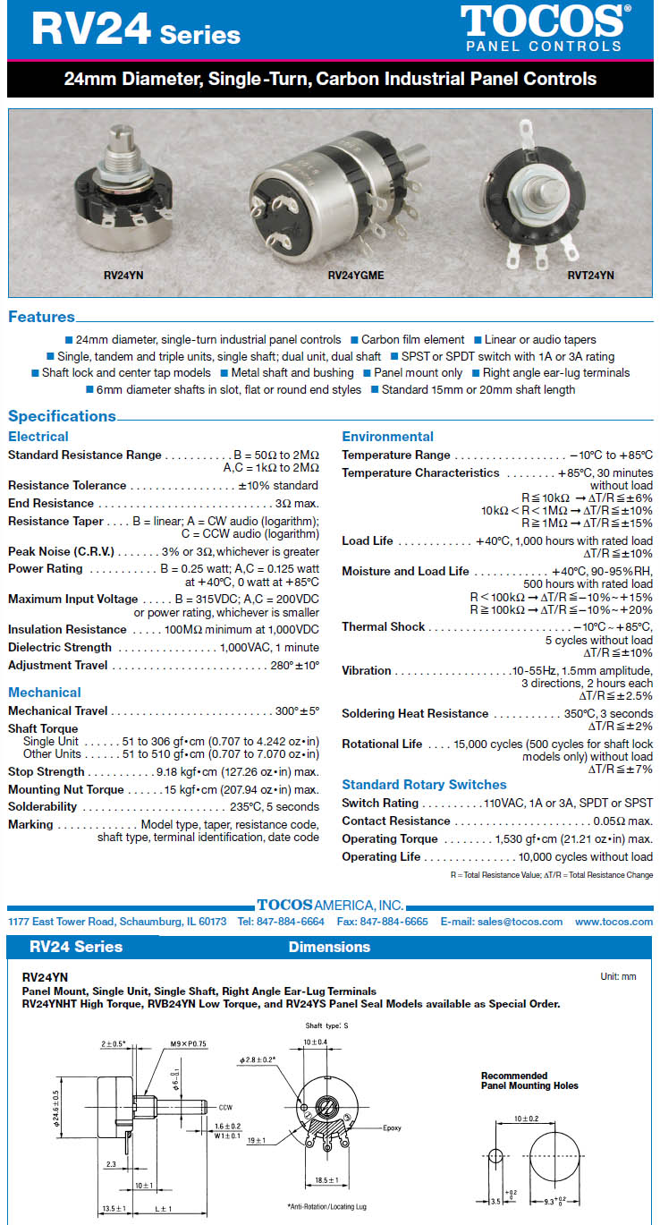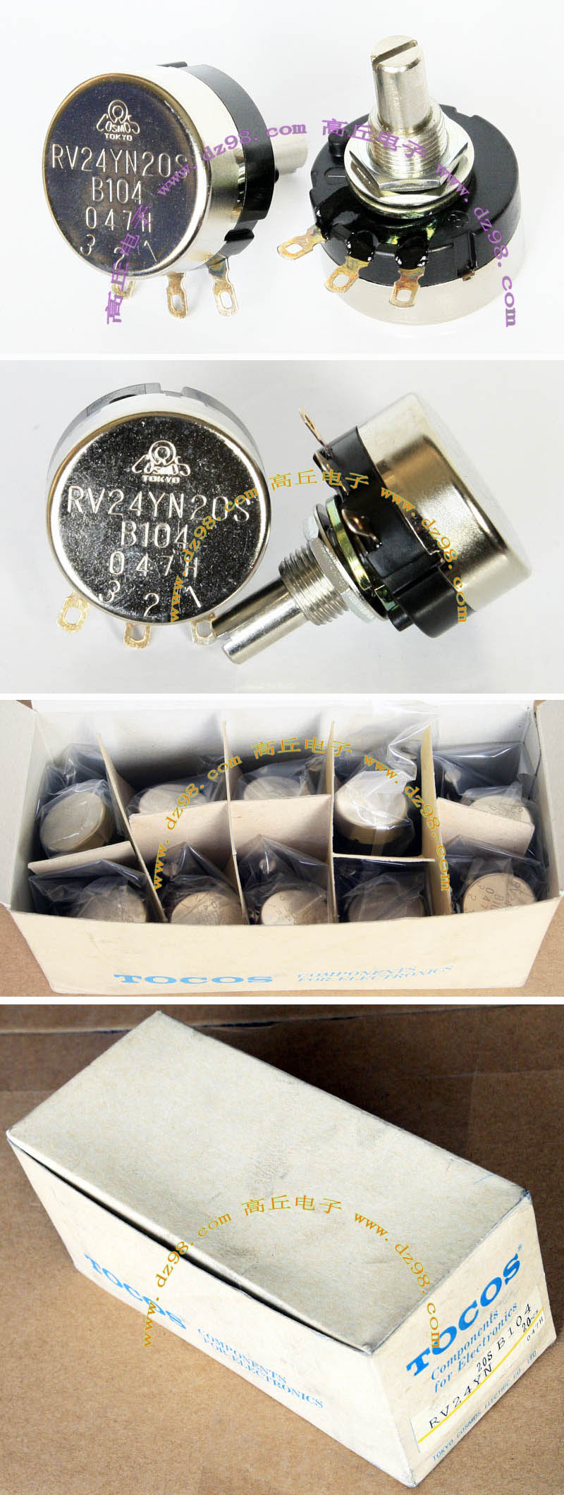 | 全新TOKYO TOCOS RV24YN20S B104 100K欧姆电位器BKA169 | 进口原装,100K欧姆。重量约19.2克。轴柄直径6毫米,电位器直径24.5毫米。 | 单价8元。 |