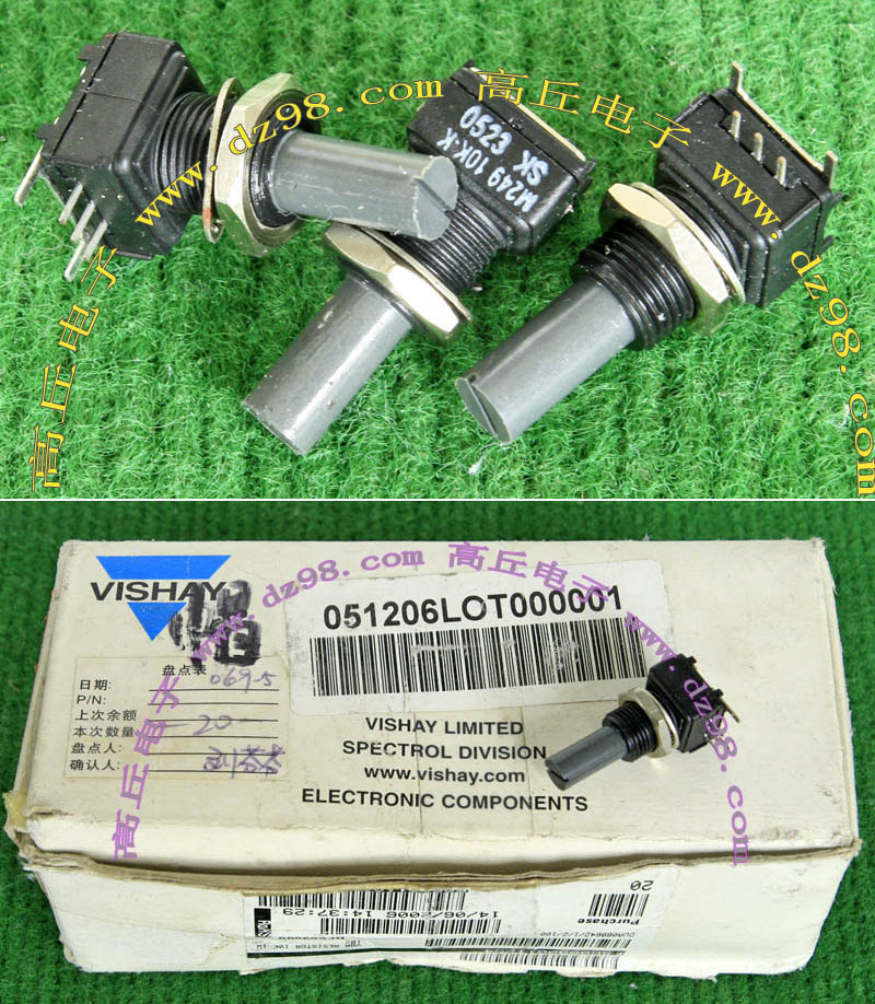 厂牌:VISHAY,型号:249 10K-K,电阻10K欧姆,手感阻尼量十足,手柄直径约6.2mm,安装钻孔直径9mm,也可以直接焊到线路板装配(后部带有2只加固焊脚),本商品没有螺毛配套,新的本来就没配。 |