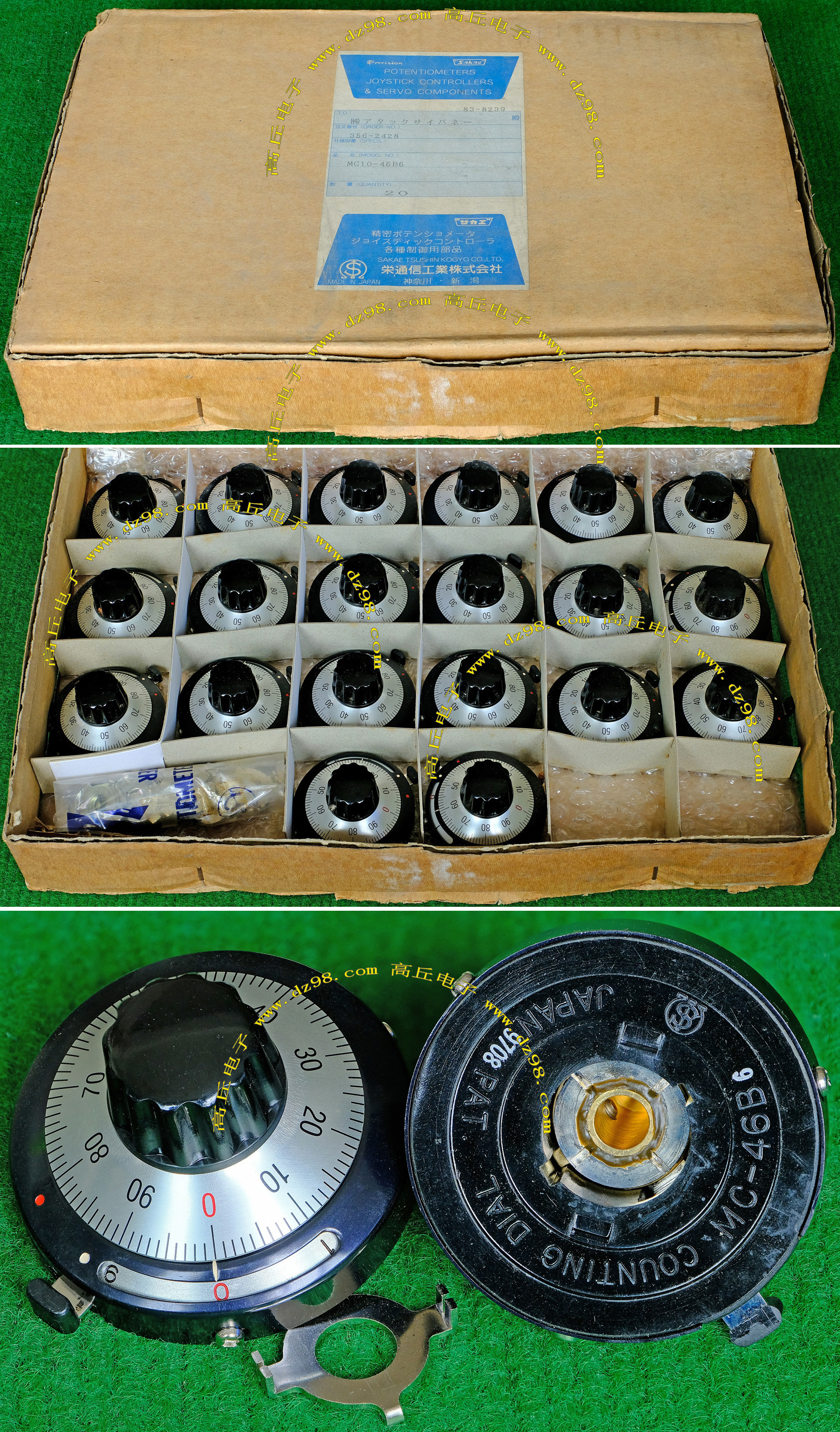 全新原装,每盒包装数量20只,每只重量约41克,外形尺寸;外直径46毫米,旋钮头部18毫米,内轴孔直径6毫米。每圈刻度100格,共10圈进度。 |