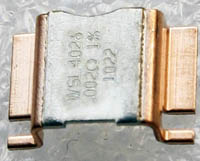 | 0.6毫欧姆 50A 贴片半开式电流检测电阻BKB314 | 实物如图,重量约1.45克,尺寸:10.8x0.2毫米,厚度3毫米,装扣在铁氧体磁片上,具备消除超高频滤波,电阻0.6毫欧姆=0.0006欧姆。引脚宽的是电流通过端,引脚窄的是电流信号检出端。单只测量困难,用10只串联焊接测量电阻为6毫欧姆,等于每只0.6毫欧姆。 | 单价2.3元。 |