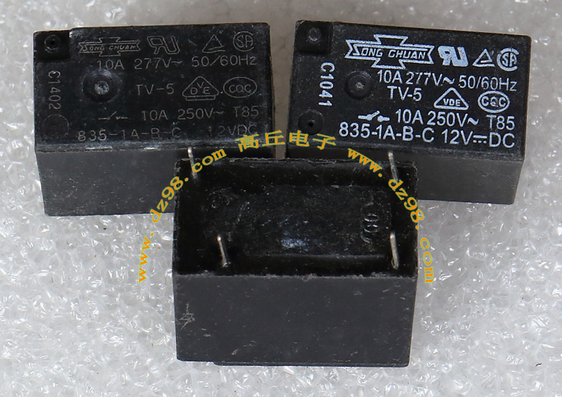 | SONG CHUAN 835-1A-B-C 12VDC 277V 10A继电器BLA210 | 拆机件 | 实物参照图片,外形尺寸;长18.5x宽10.4x高15.3毫米,重量约6克。 | 单价0.9元。 |