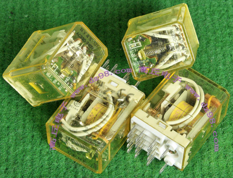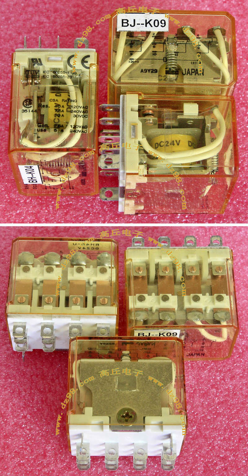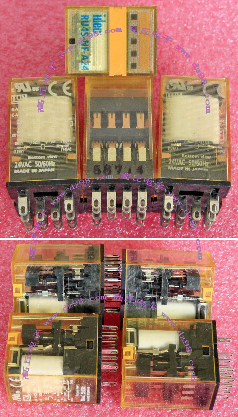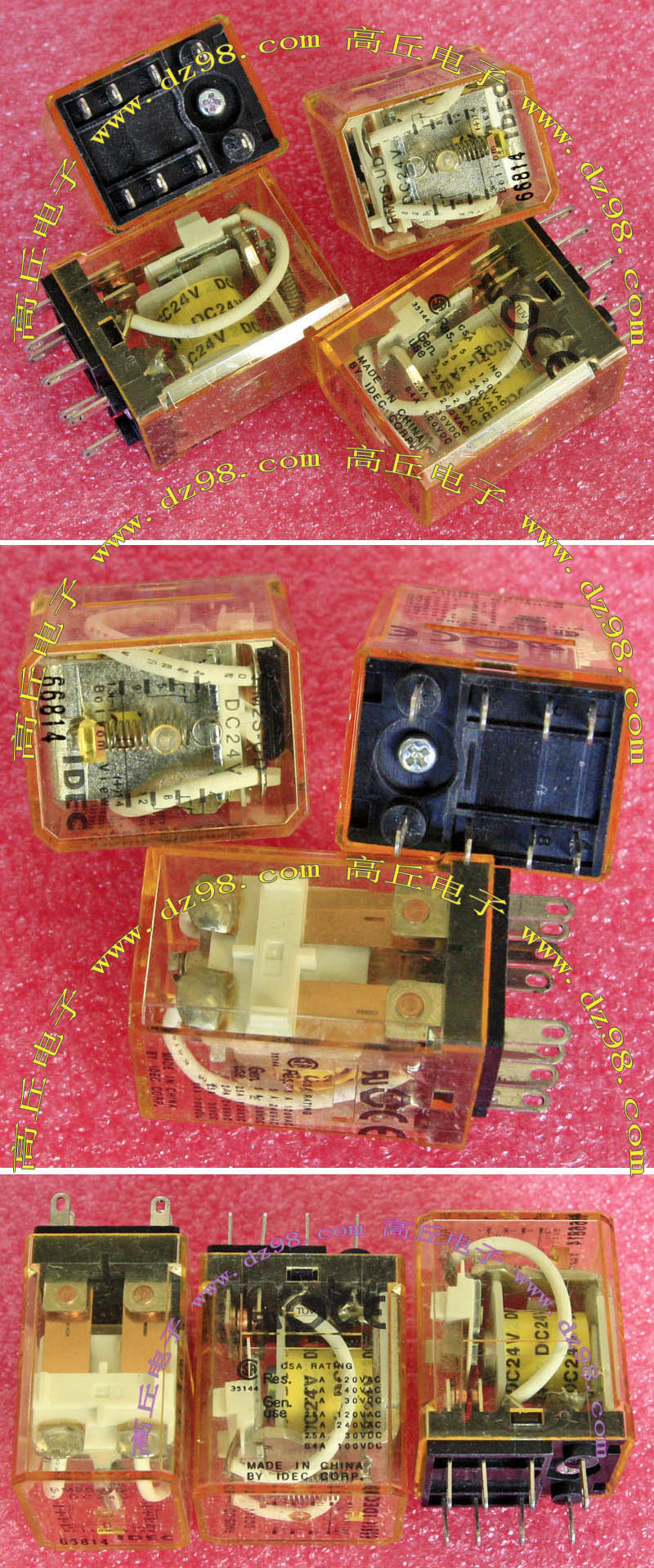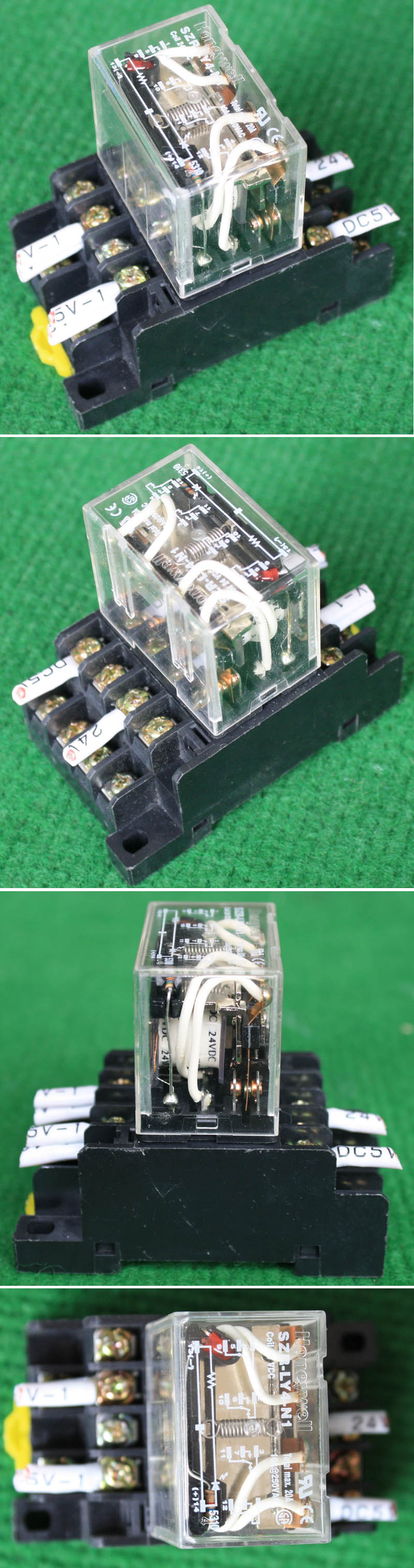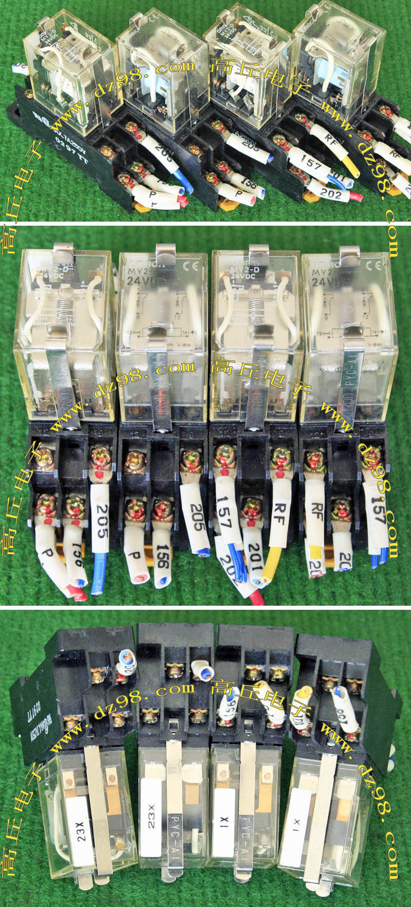 拆机品 | 拆机件,外观约9.5成新,厂牌:OMRON,实物看图,继电器是4组常开常闭触点,线圈电压DC24V。重量14只总重量约1320克。 |