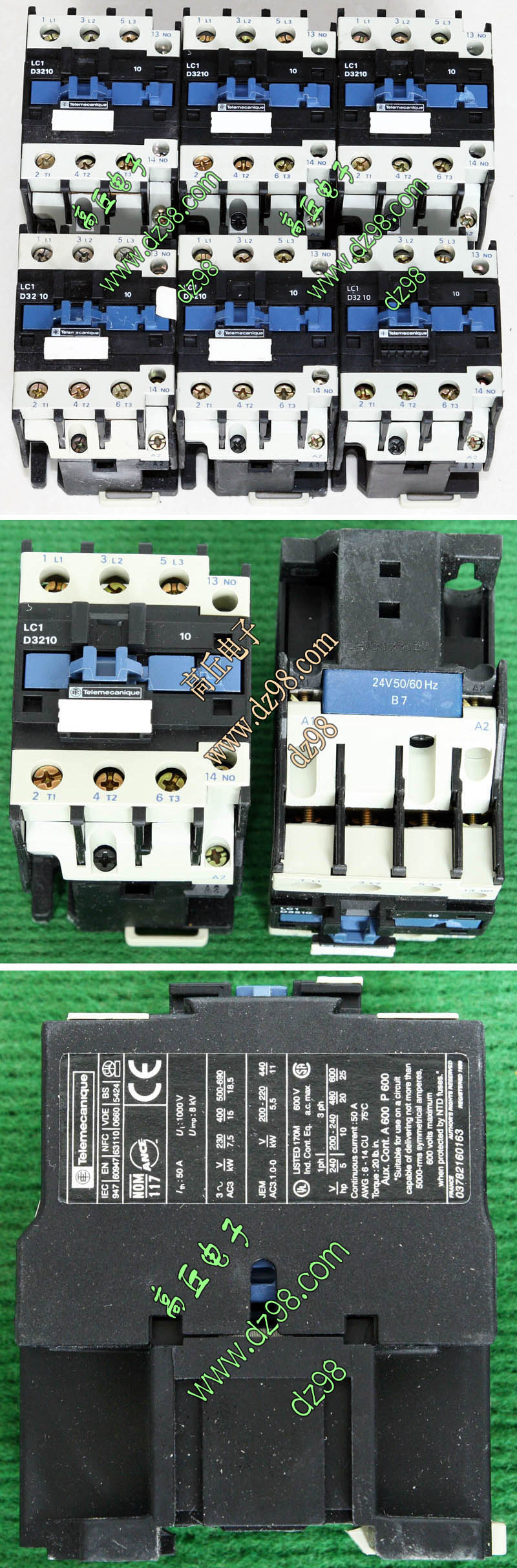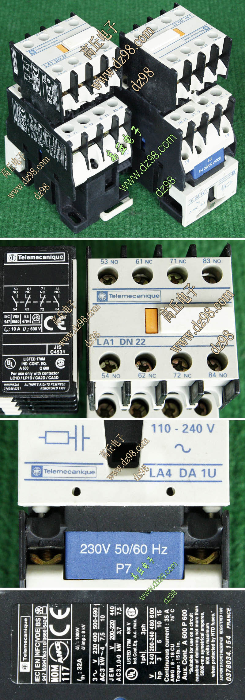 拆机品 | 拆机件,外观约8.5成新,厂牌:SCHNEIDER施耐德,详细数据看实物图片标记,线圈电压AC230V,外形尺寸:78毫米x45毫米,高度118毫米。重量约400克。 |