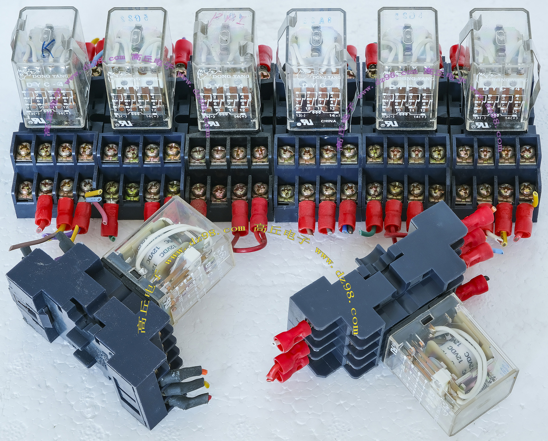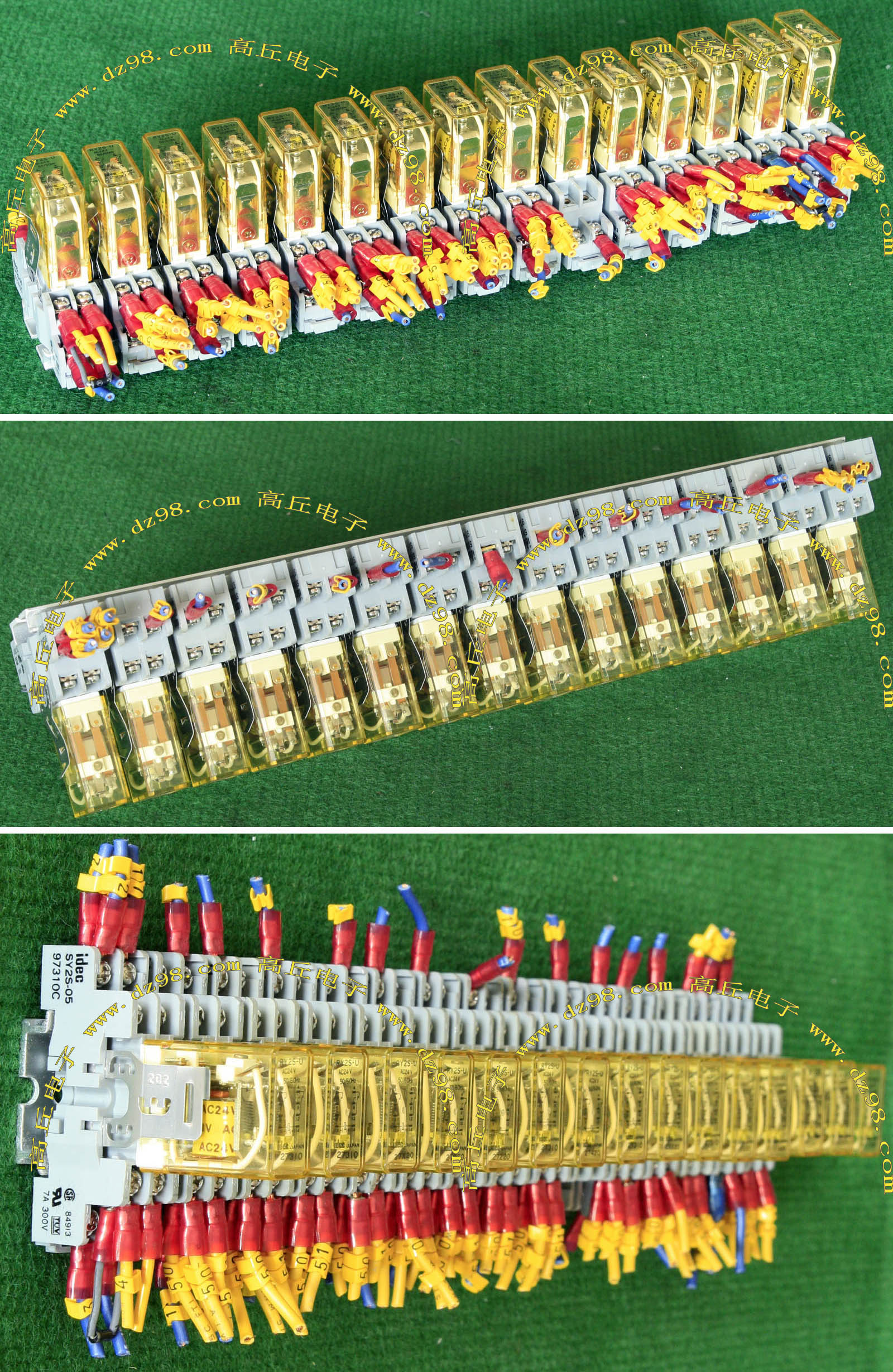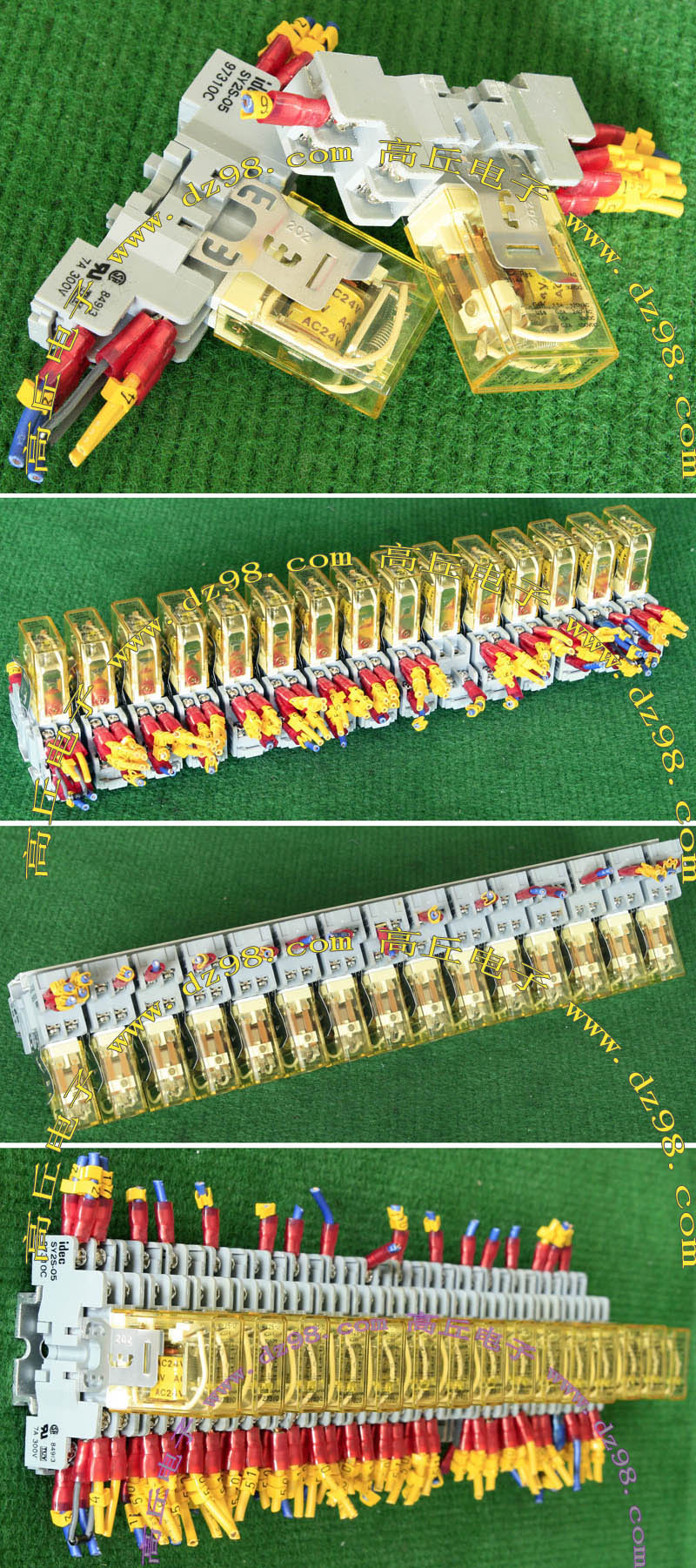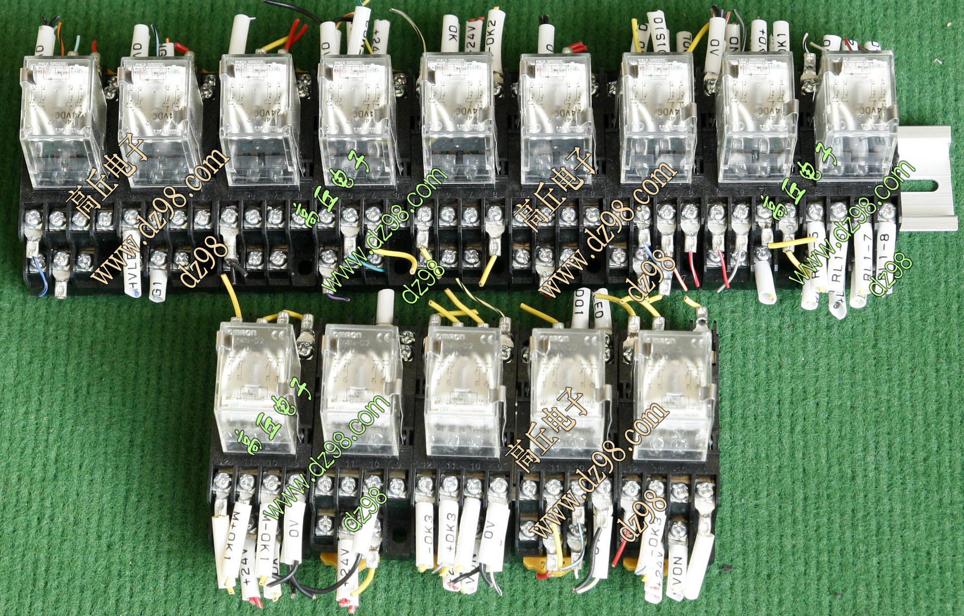 拆机件 | 拆机件,实物参照图片,6只带插座继电器,线圈DC24V,一组常开常闭触点,触点电压250V 12A。20档接线端子,一只保险丝座。 |