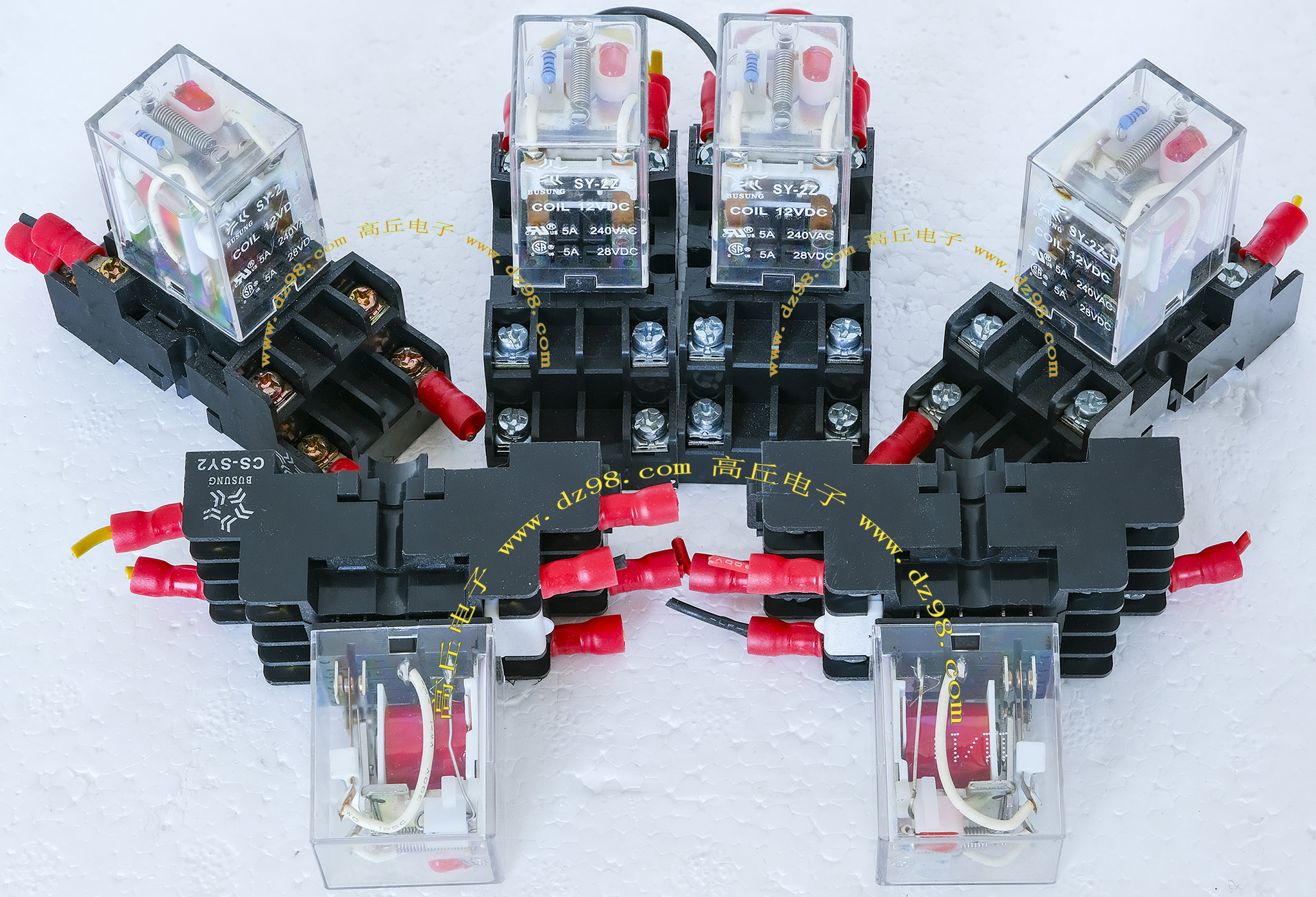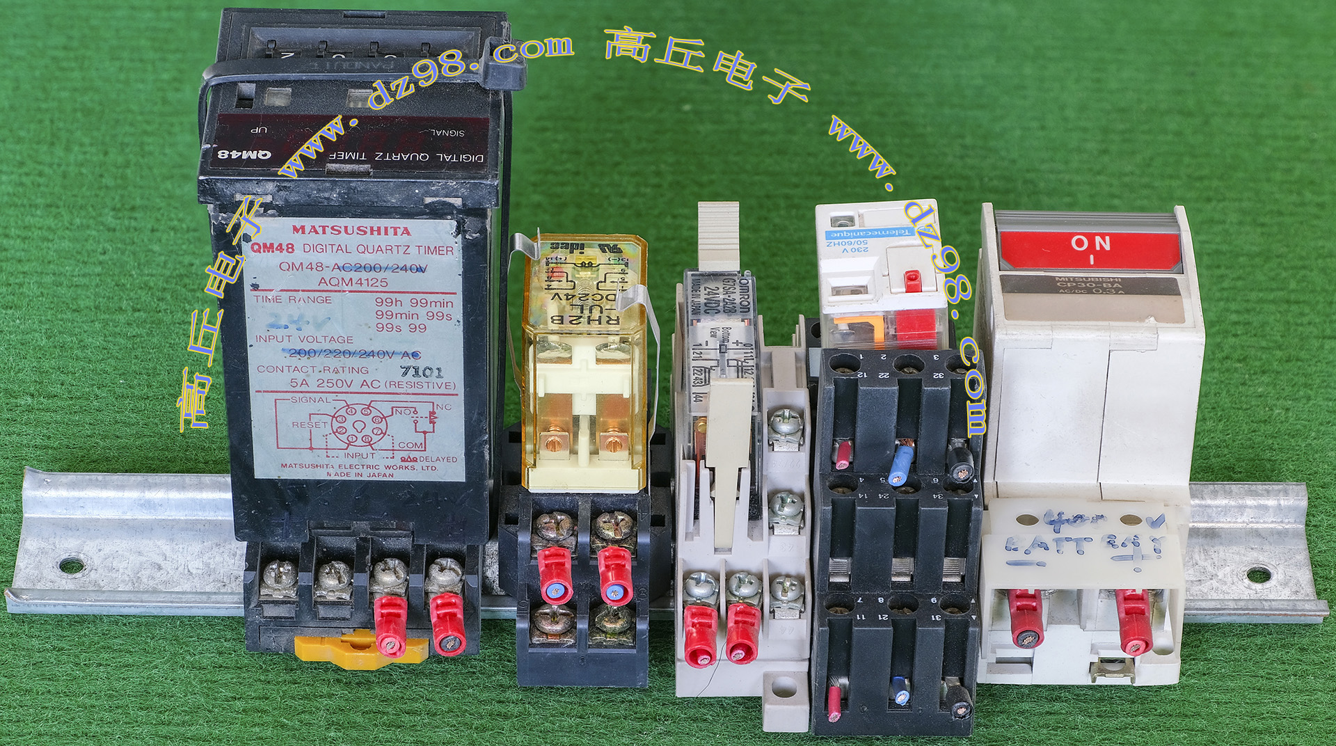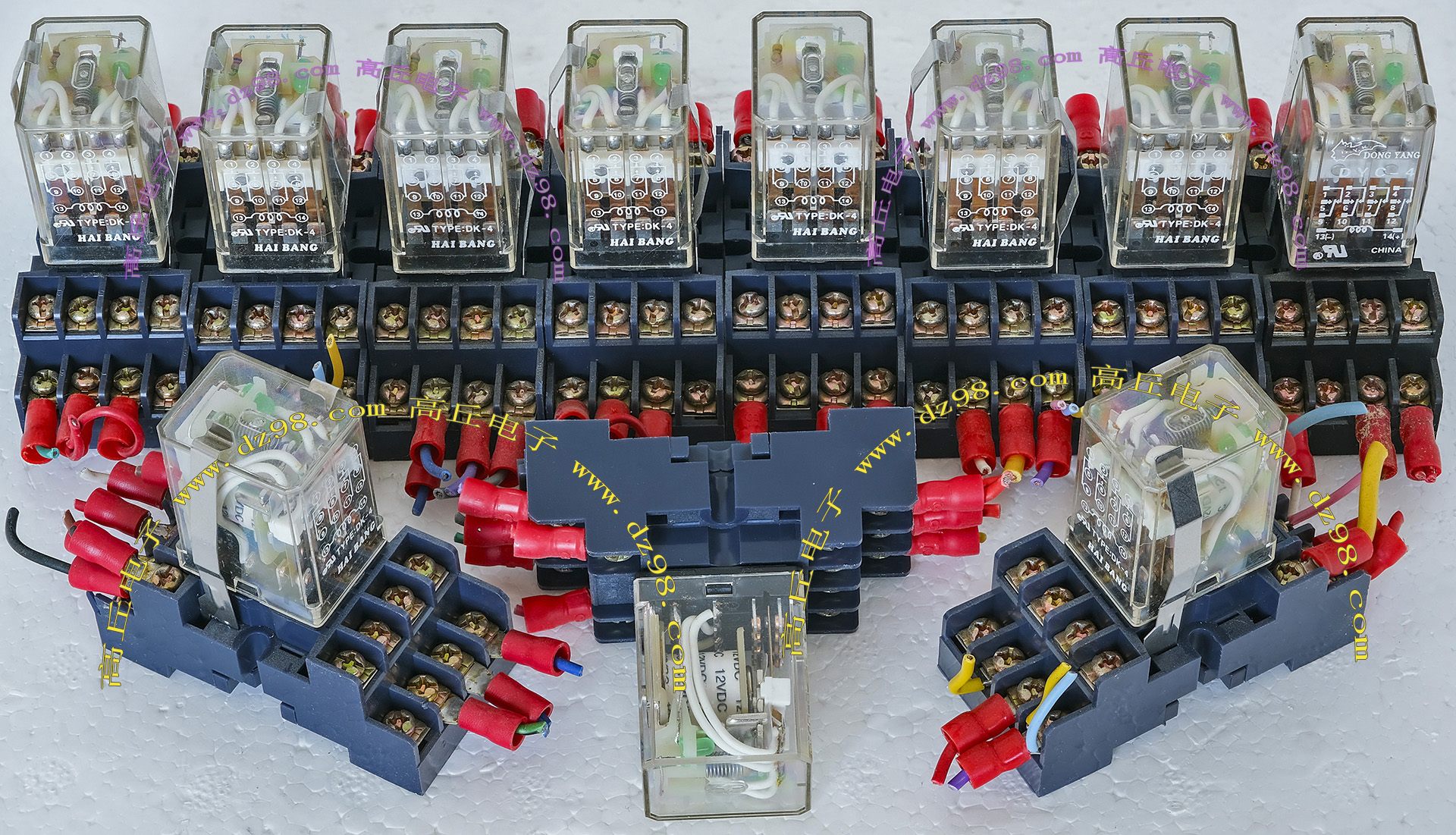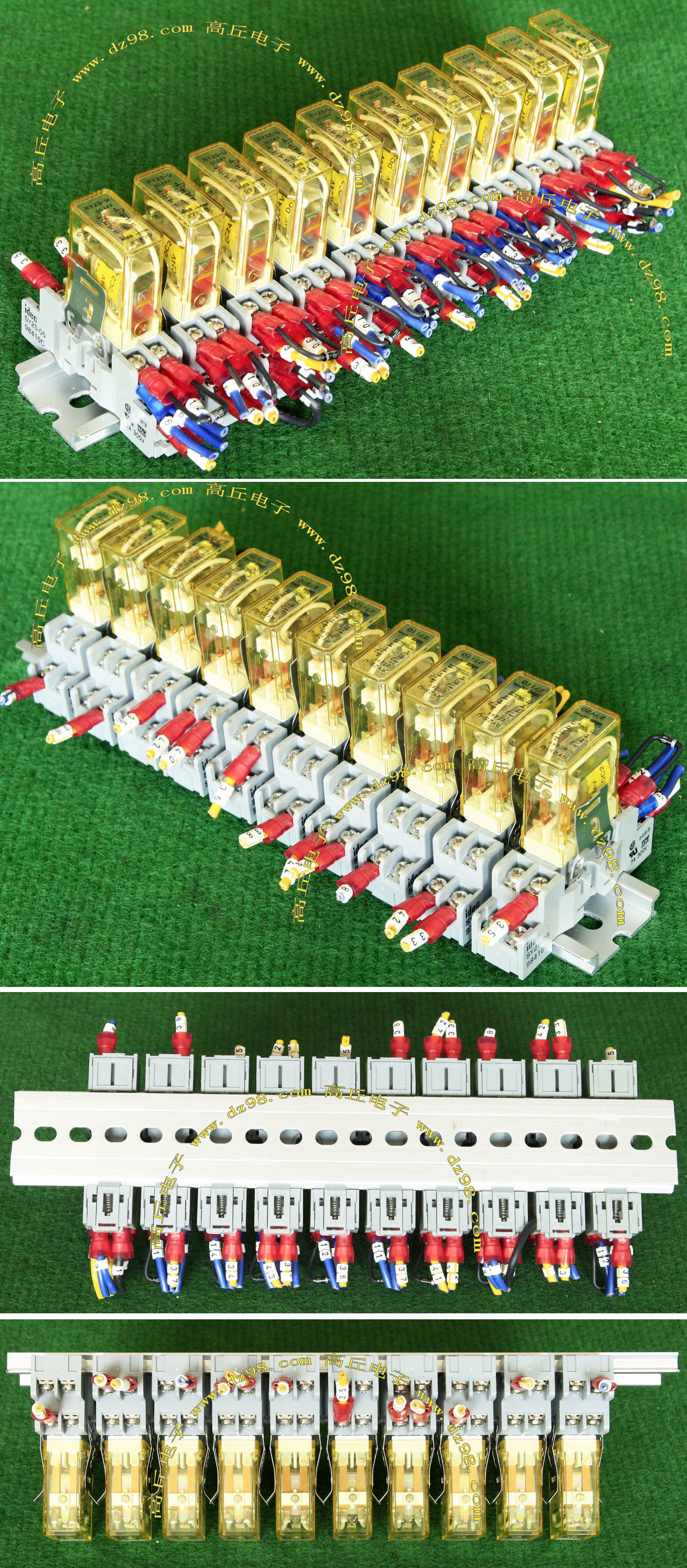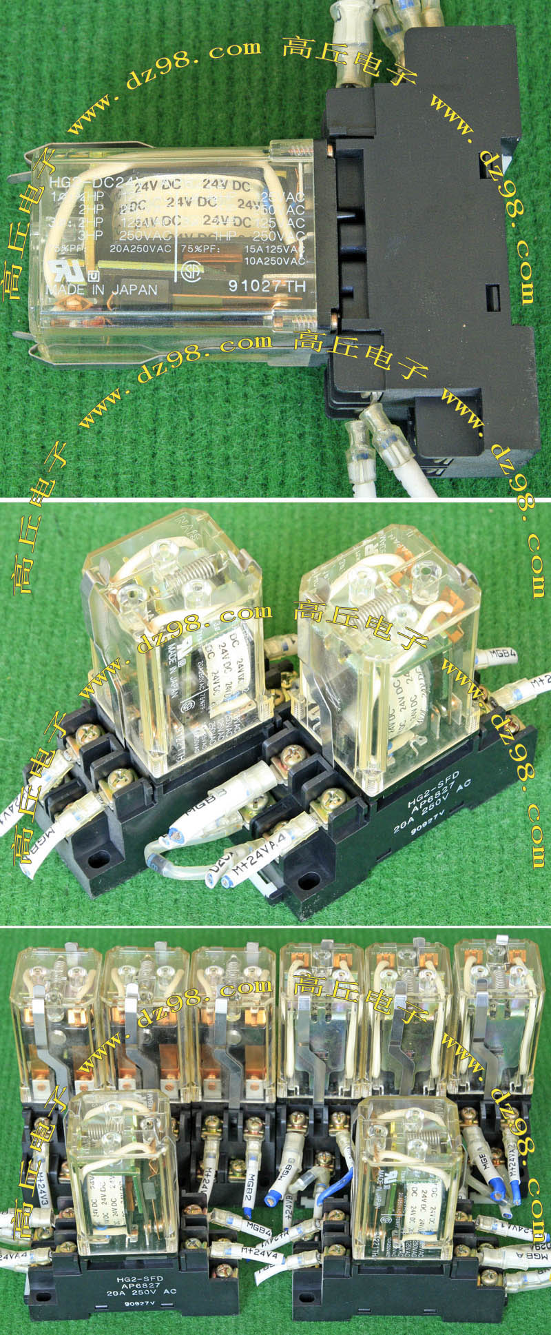 拆机件 | 拆机件,实物参照图片,6只带插座继电器,线圈DC24V,一组常开常闭触点,触点电压250V 12A。20档接线端子,一只保险丝座。 |