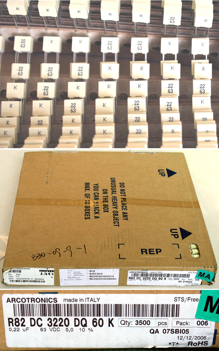 全新品,属于上海贝尔电子用后余货,每盒包装数量3500只,厂牌:ARCOTRONICS,型号名称:R82DC3220DQ60K,产地:ITALY,脚距5mm。 |