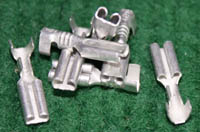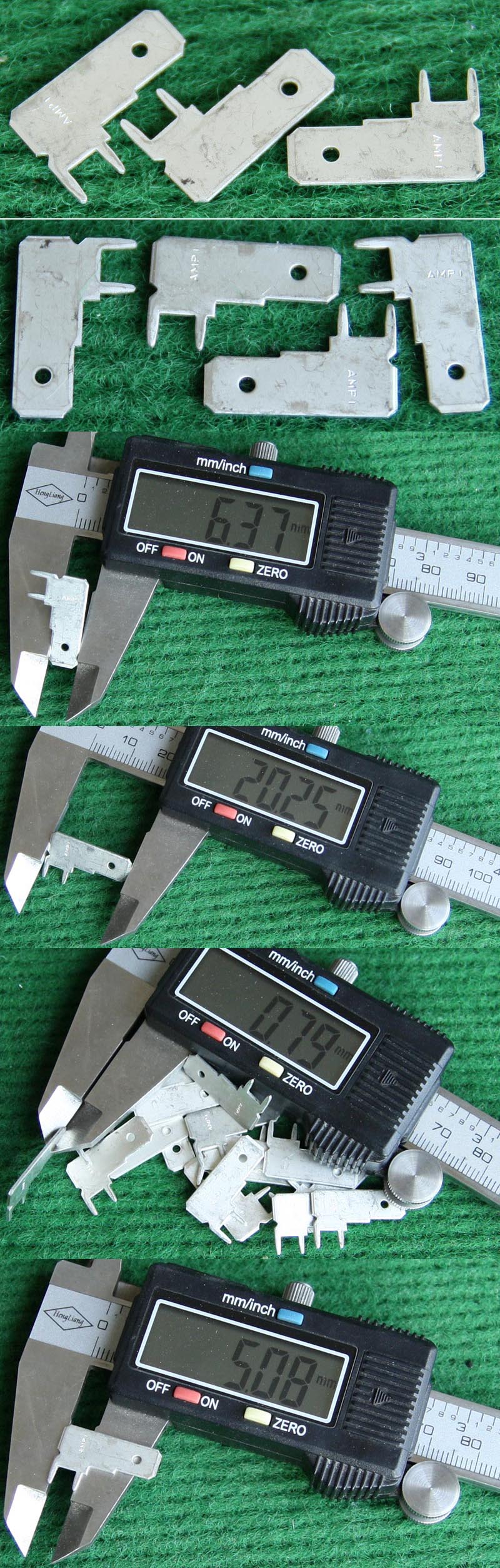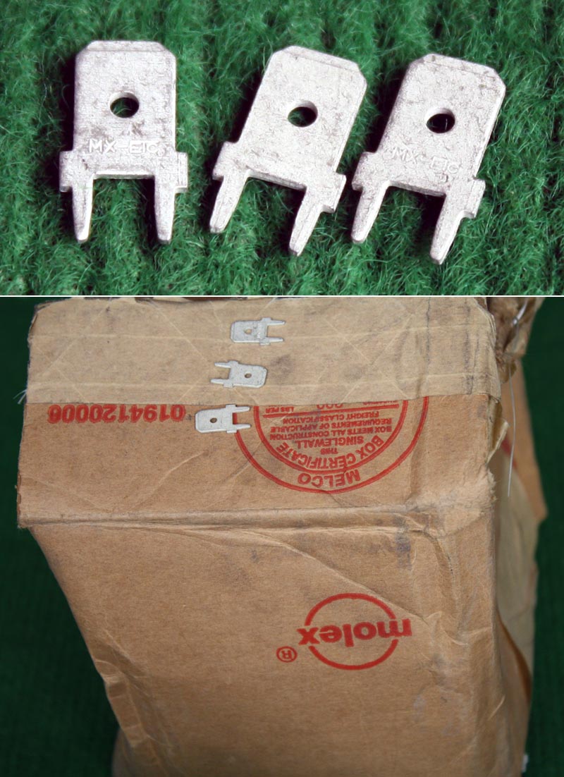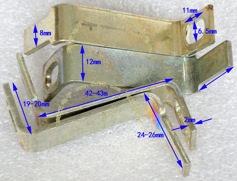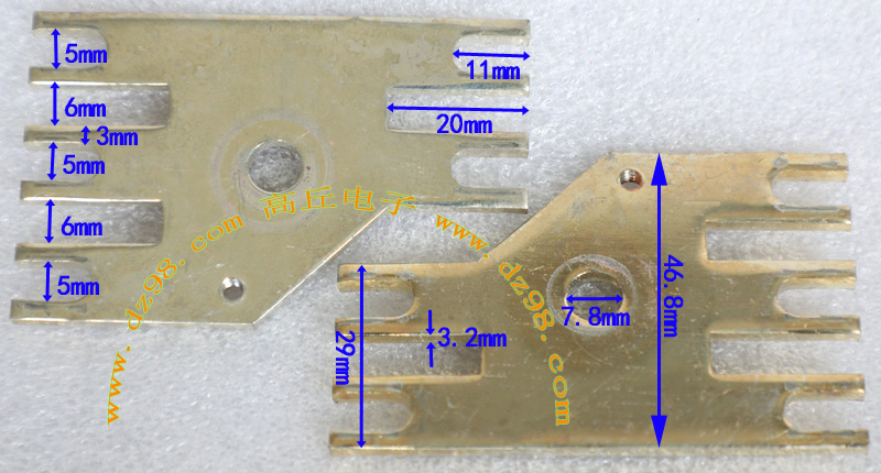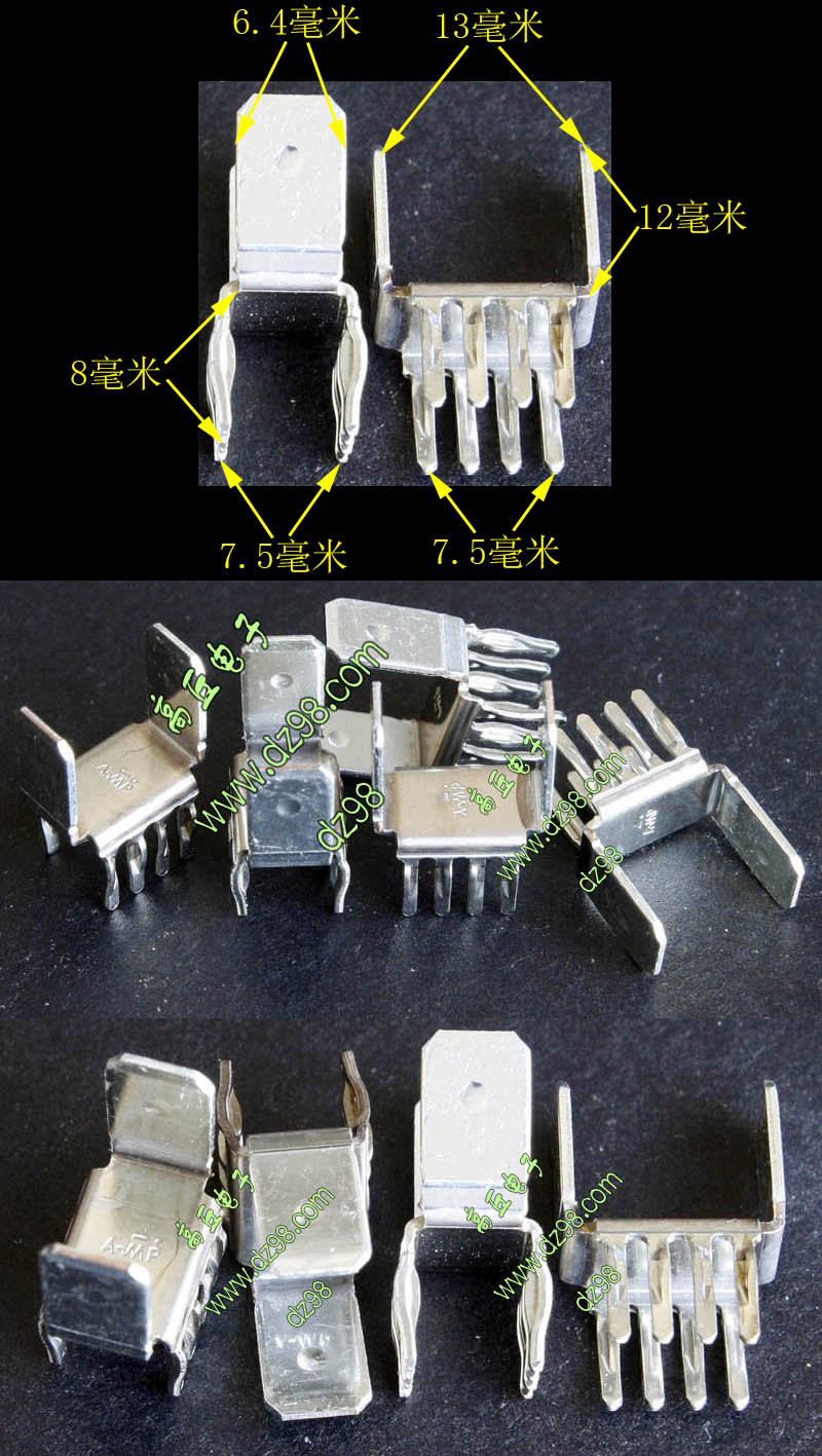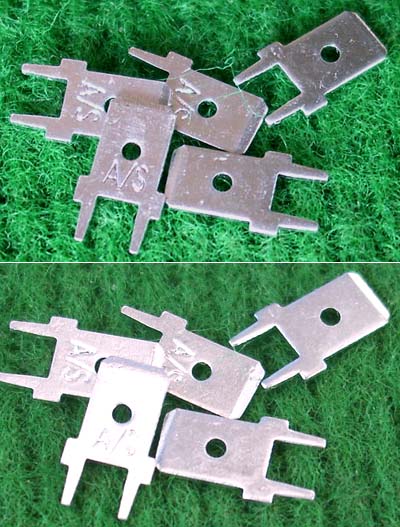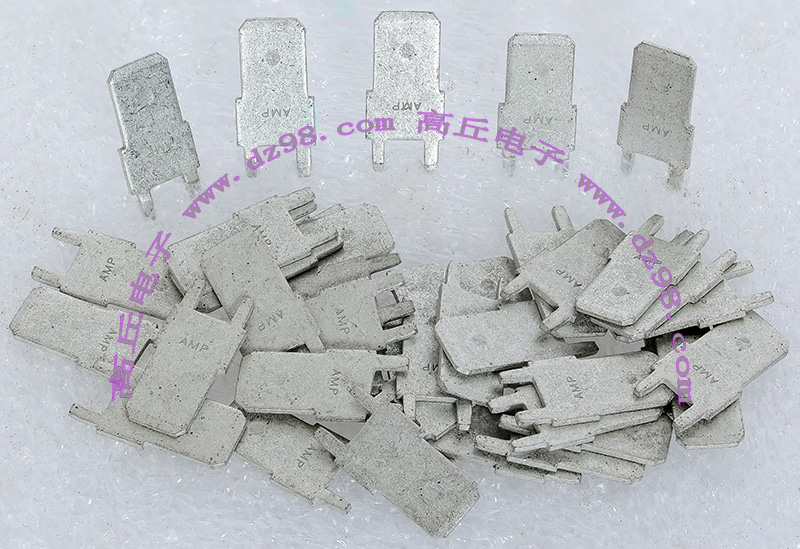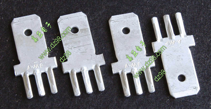 全新20A焊板插片式接线端子,尺寸:高11mm(不含焊针脚),总高14.2mm(含焊针脚),接插宽度6.3mm,阻肩处宽8mm,厚度0.8mm。 |