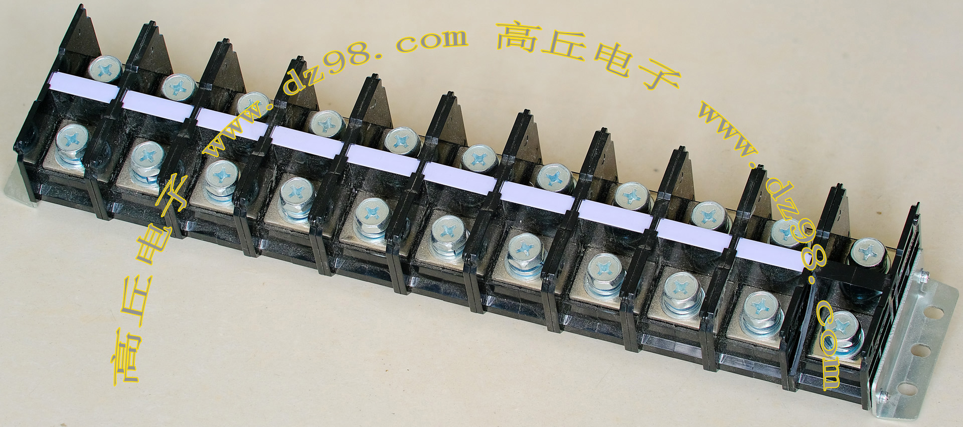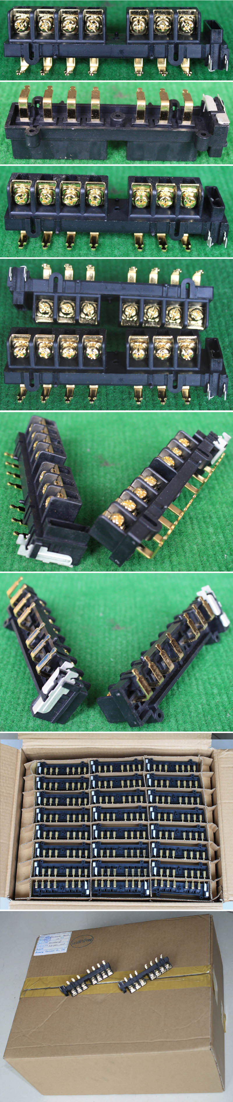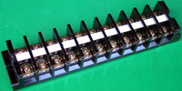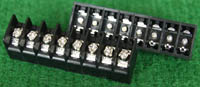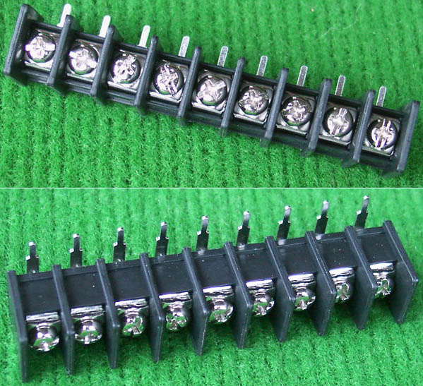 全新9档卧型焊板式接线端子,长度87.8mm,宽度19mm,高度16.4mm,脚距9.5mm,通过电流25A。 |