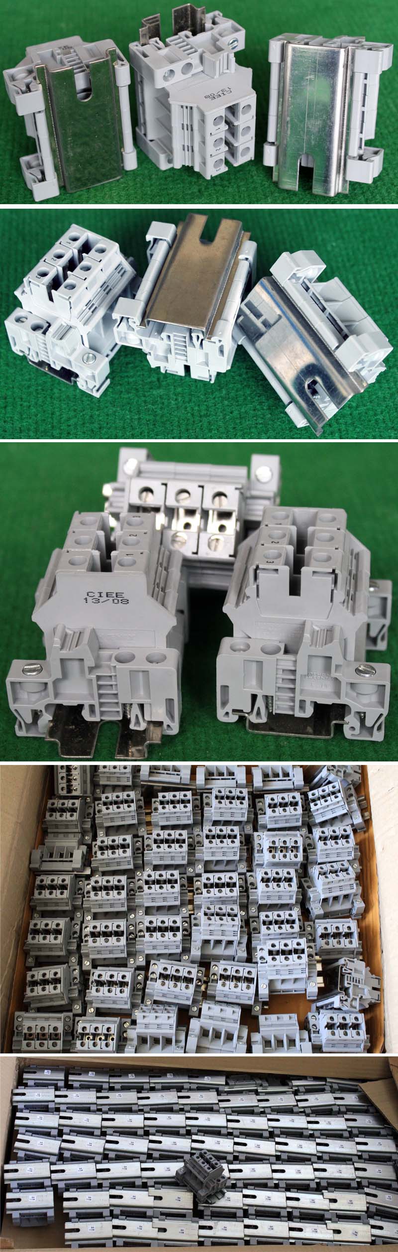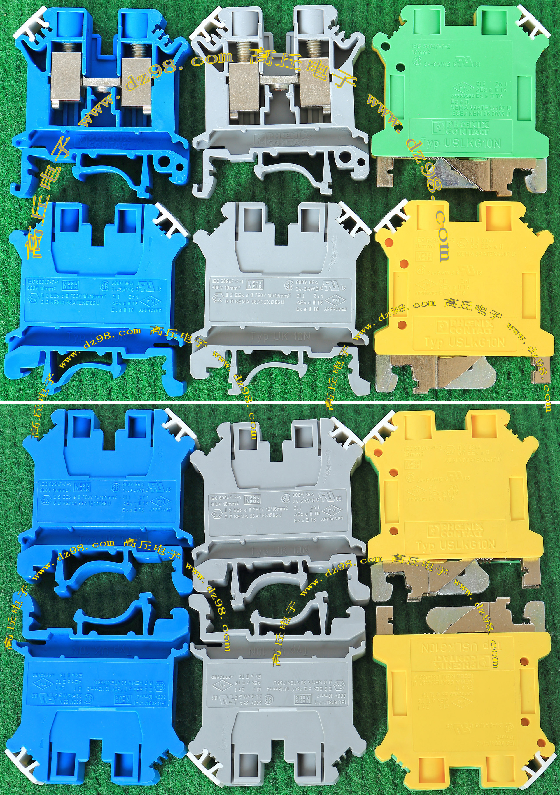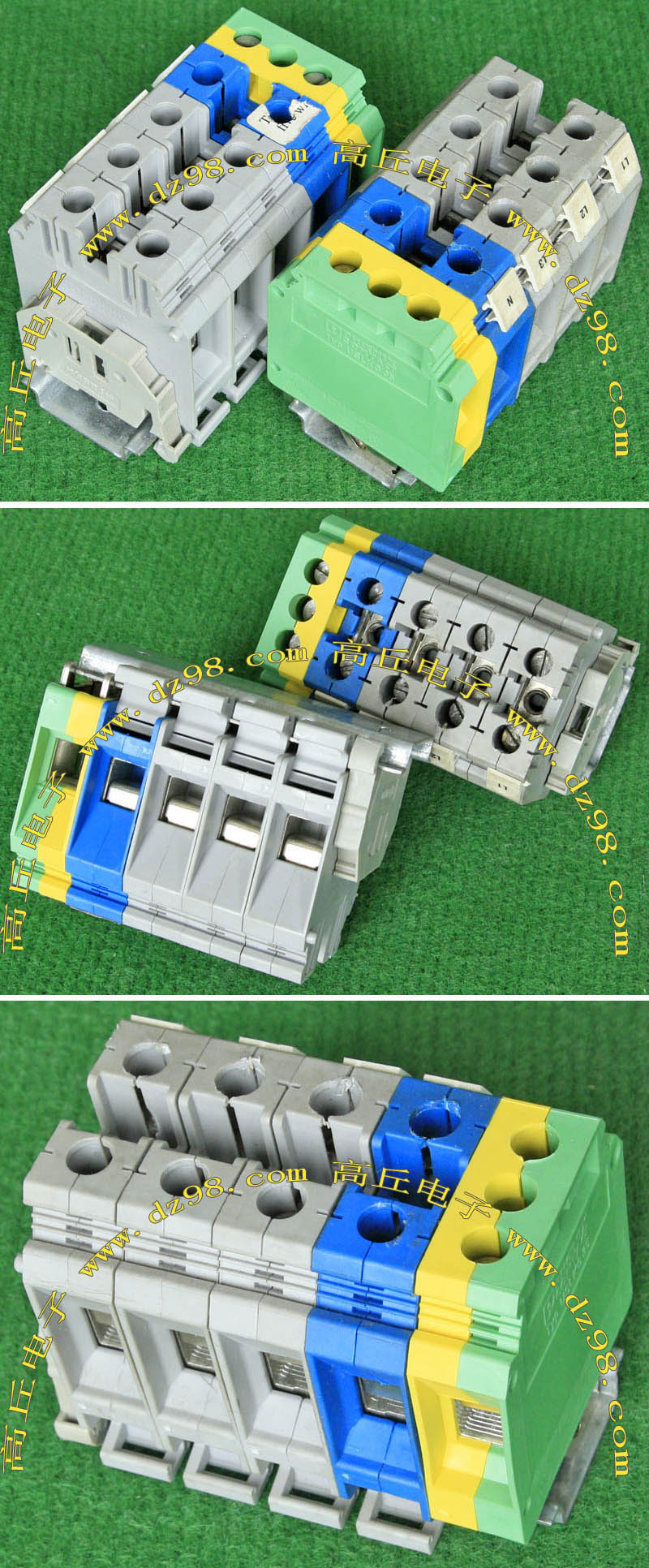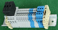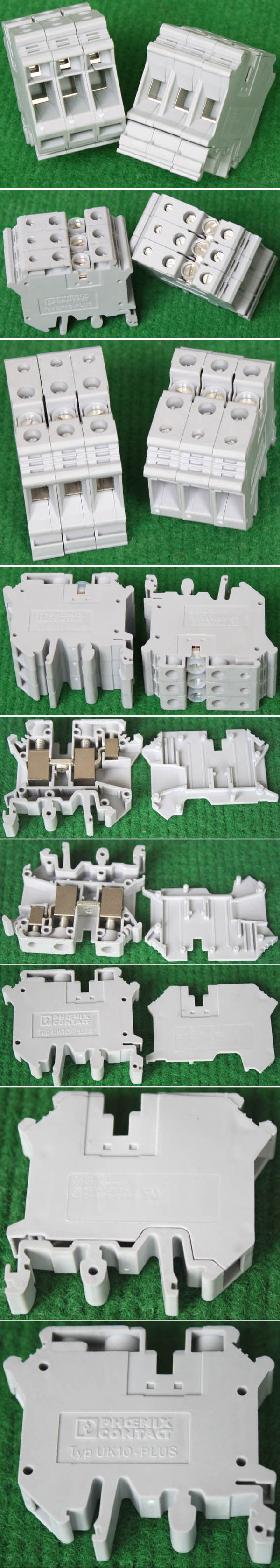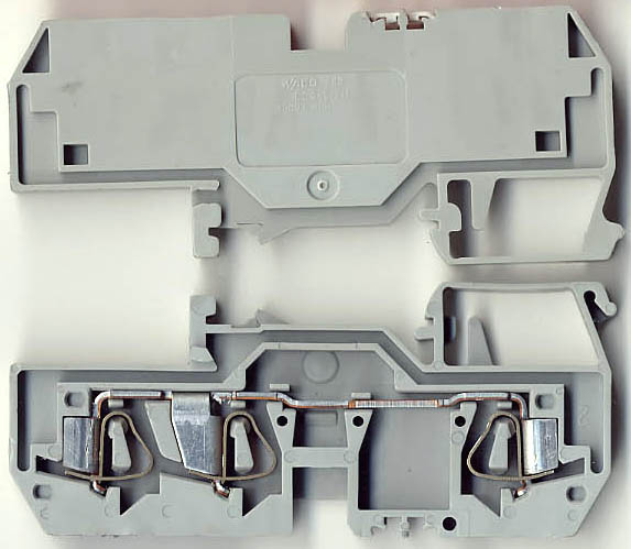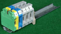 型号:typ UK 10N,电压600V,电流65A,导轨按装式,每组3只连在一起,拆掉中间的连接铜条可分为独立3个单元,重量约61克。 |