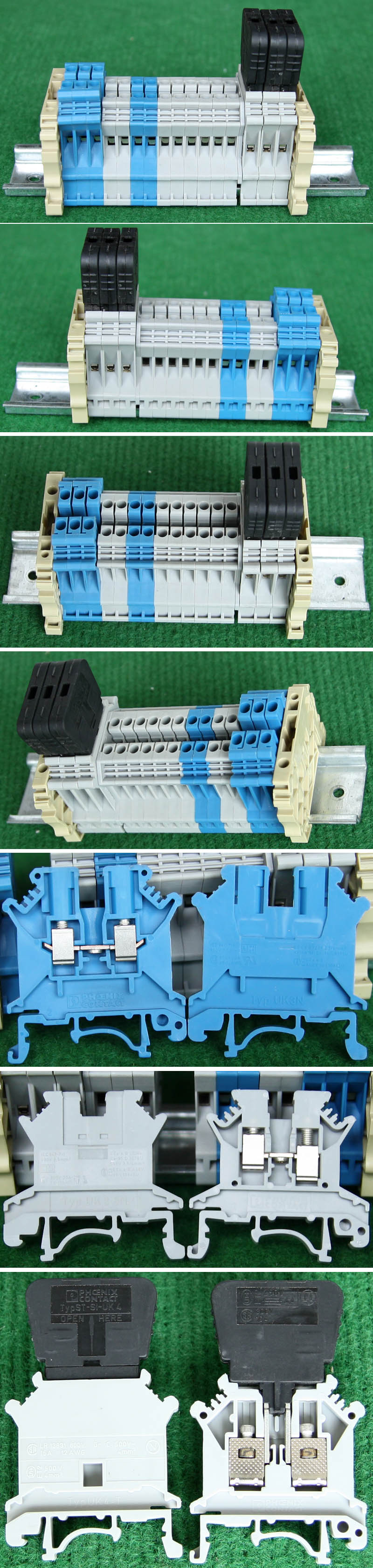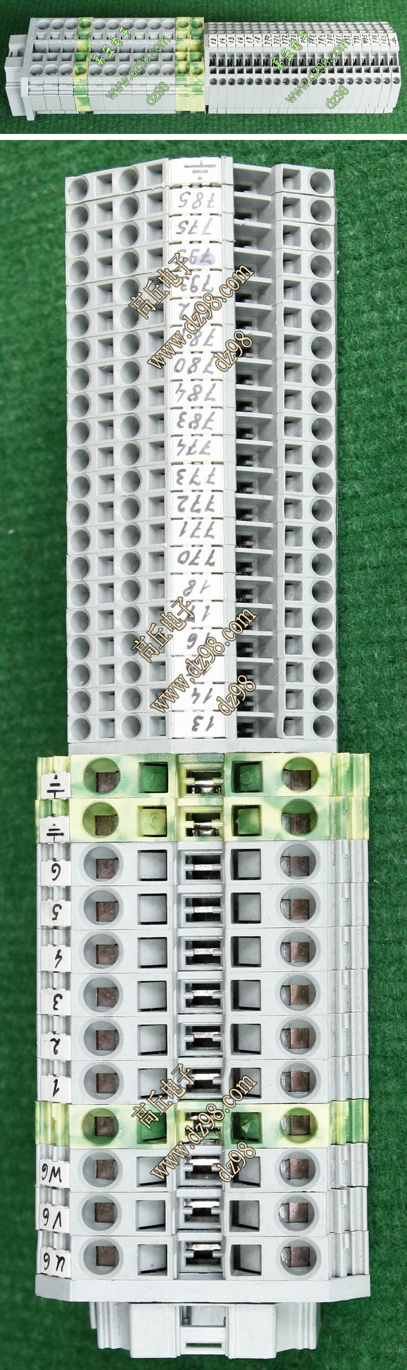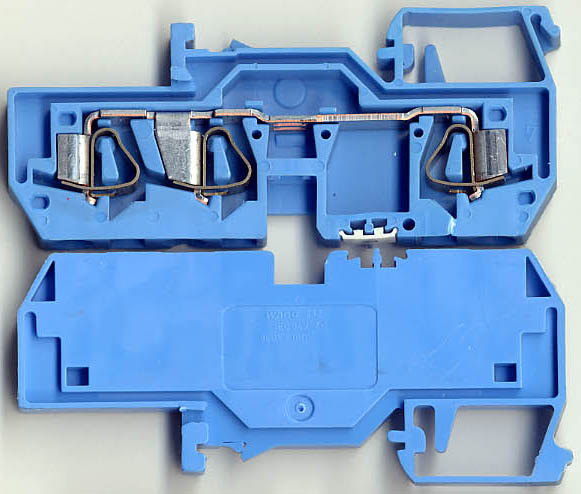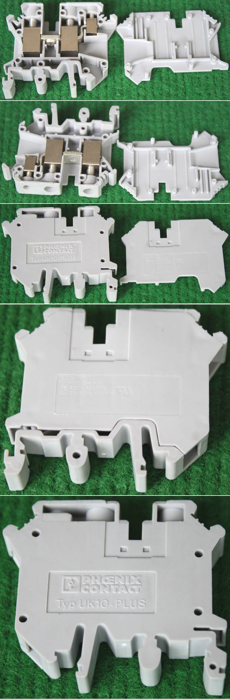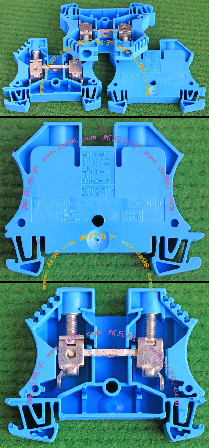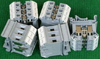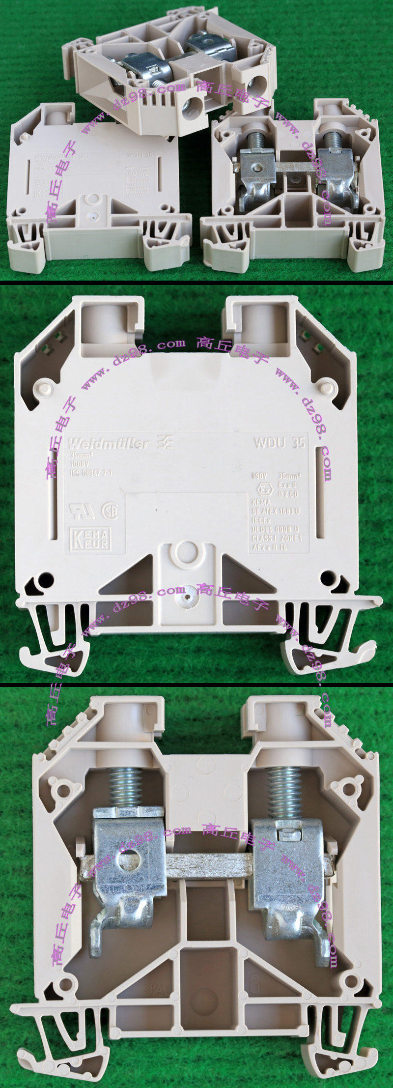 型号:typ UK 10N,电压600V,电流65A,导轨按装式,每组3只连在一起,拆掉中间的连接铜条可分为独立3个单元,重量约61克。 |