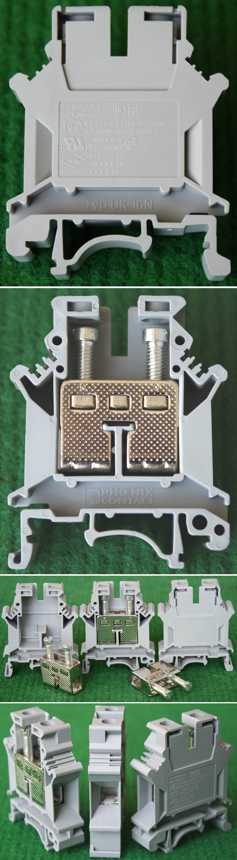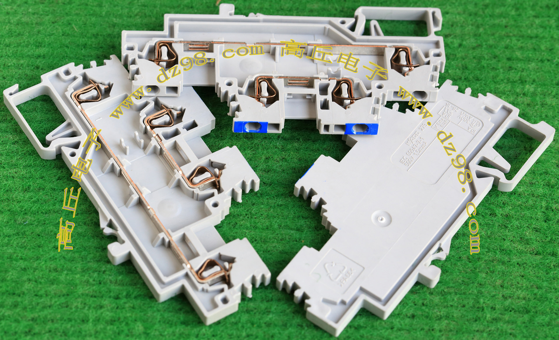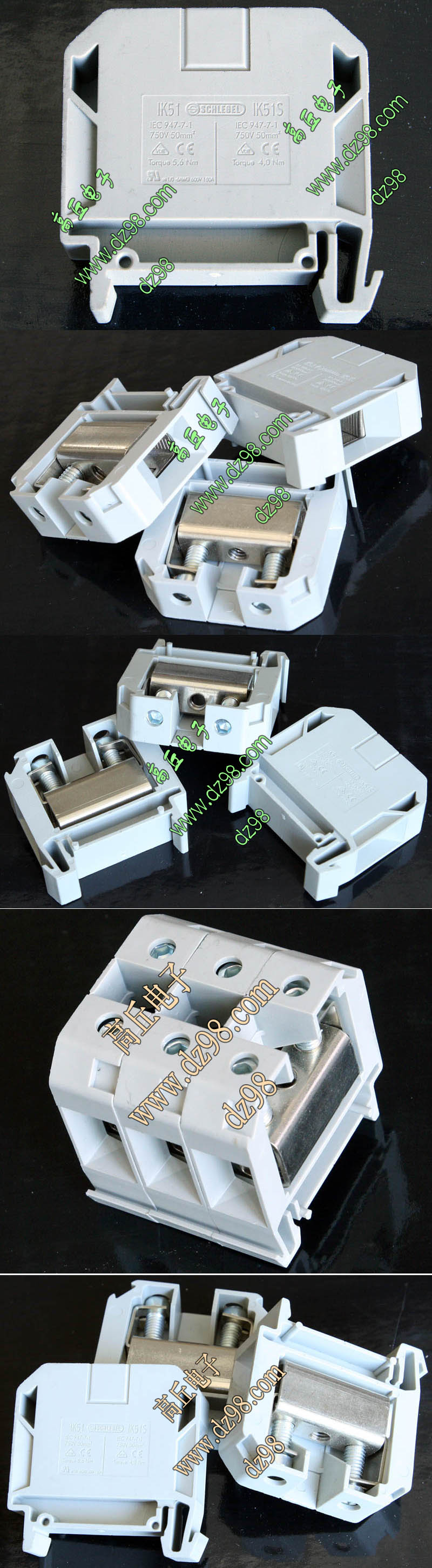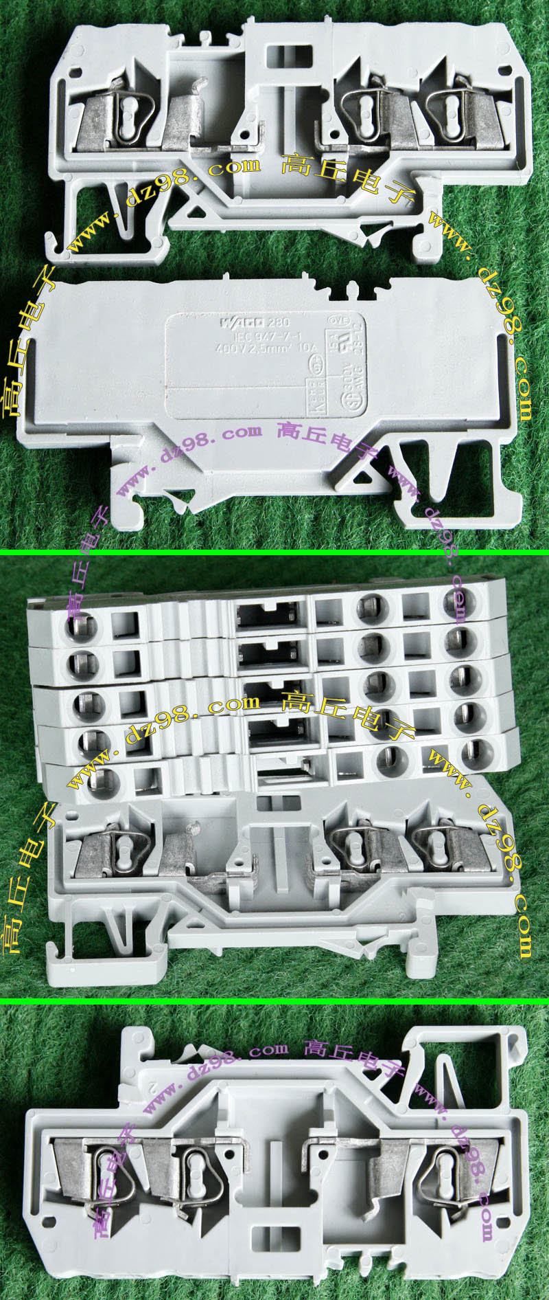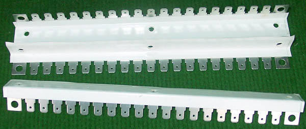 型号:typ UK 10N,电压600V,电流65A,导轨按装式,每组3只连在一起,拆掉中间的连接铜条可分为独立3个单元,重量约61克。 |