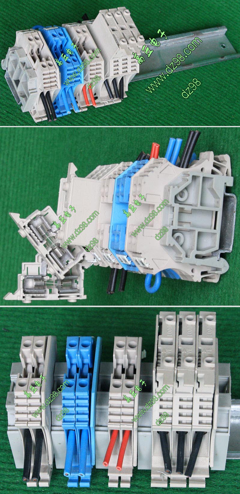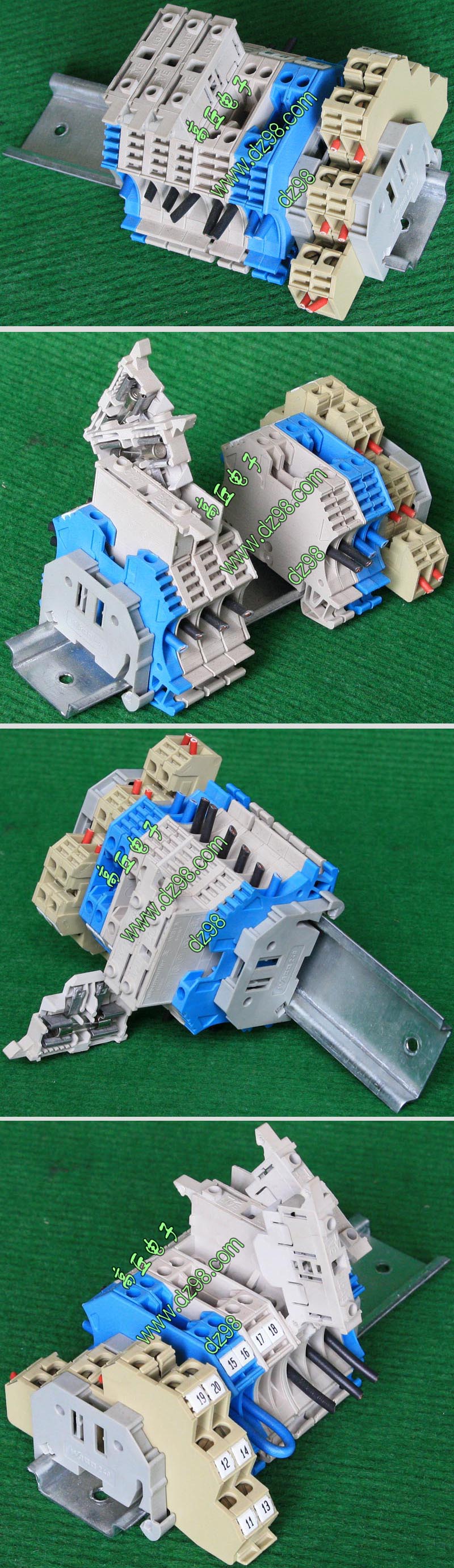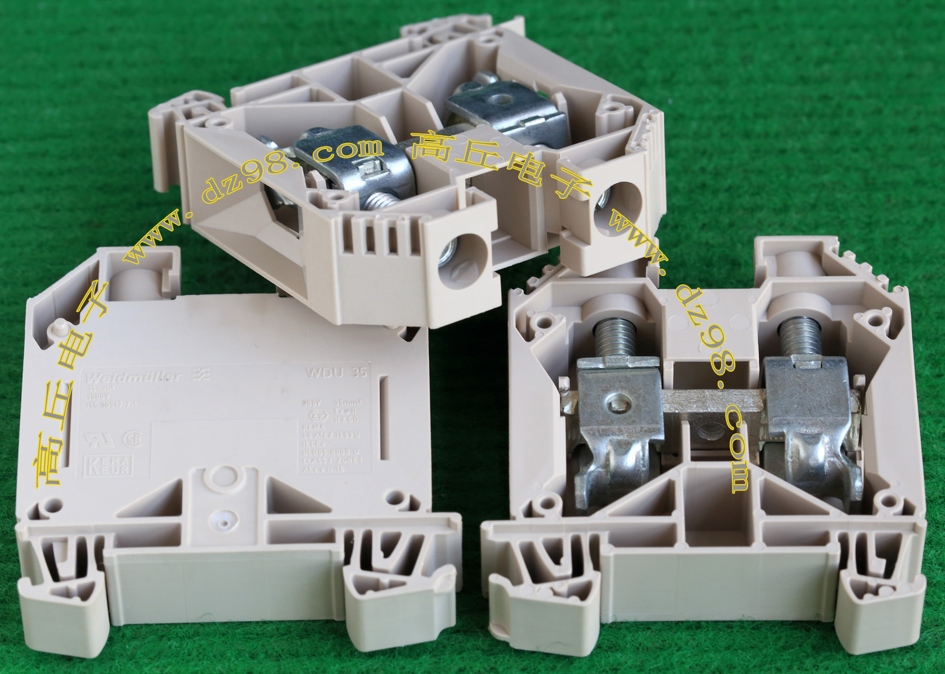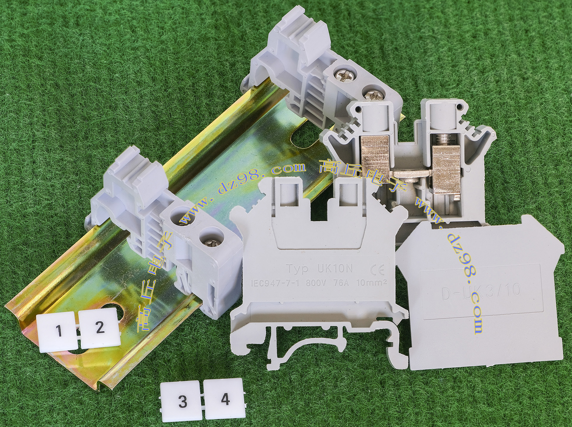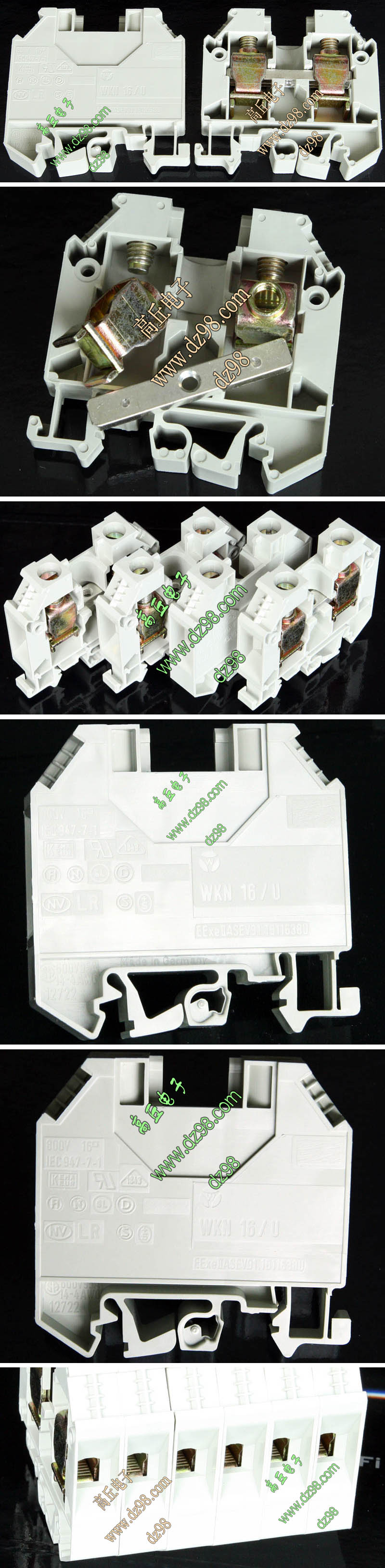 型号:typ UK 10N,电压600V,电流65A,导轨按装式,每组3只连在一起,拆掉中间的连接铜条可分为独立3个单元,重量约61克。 |