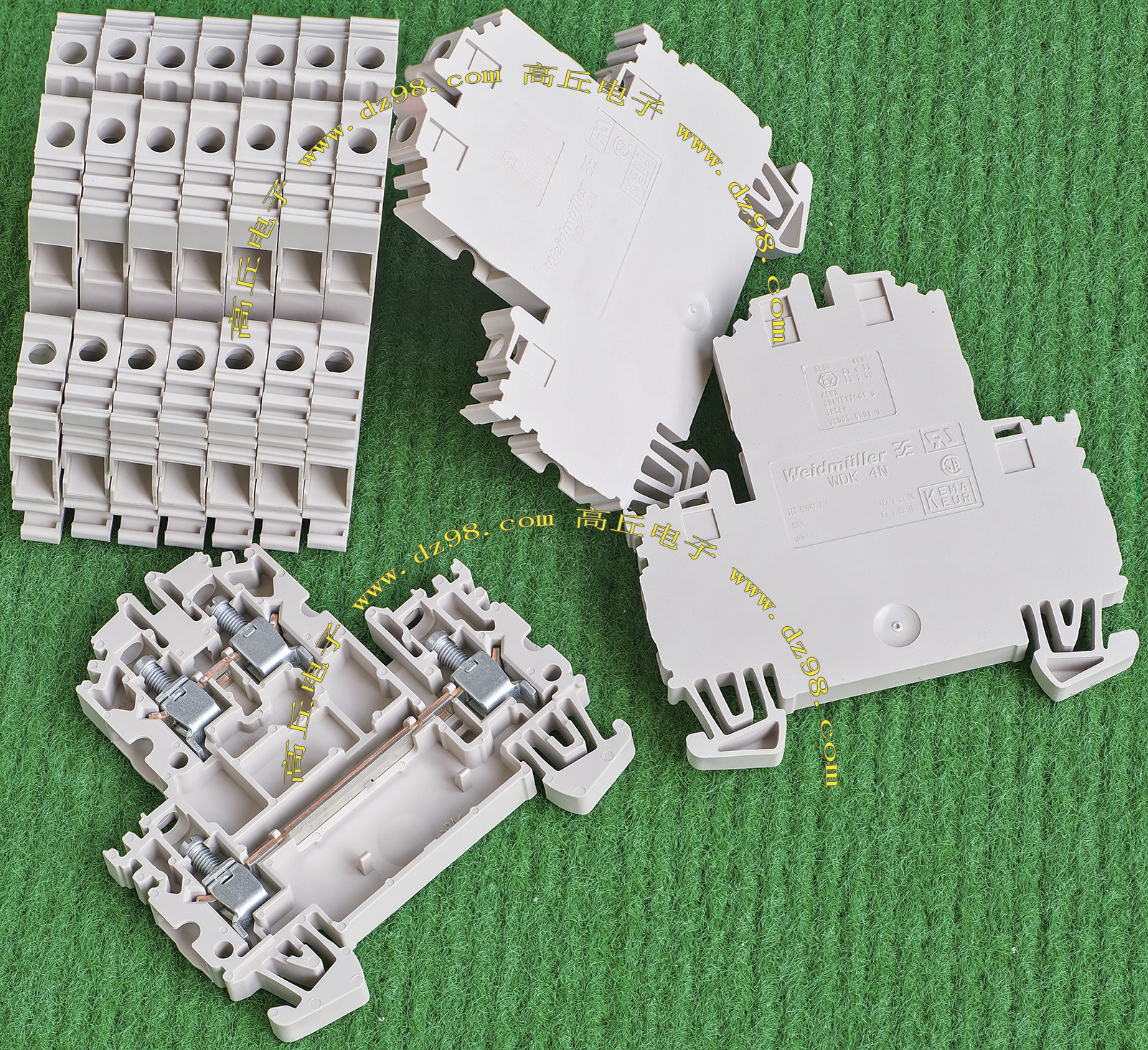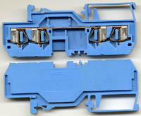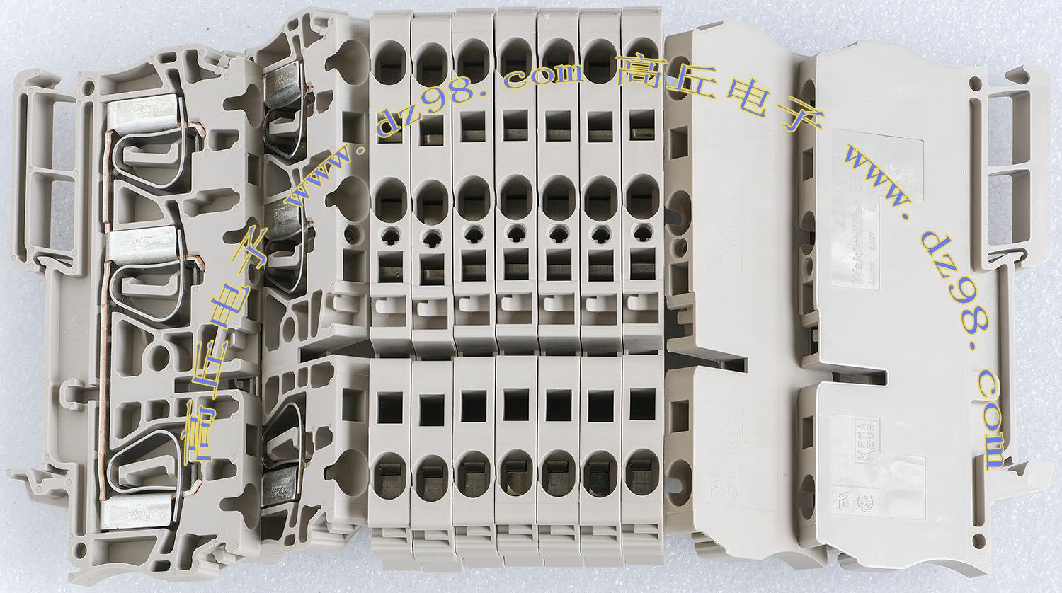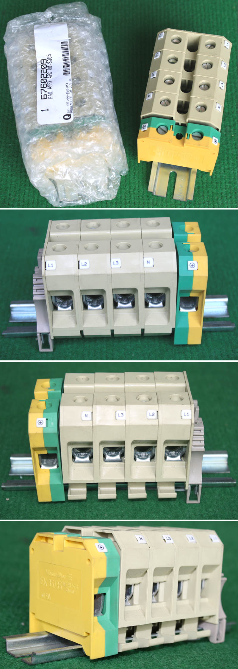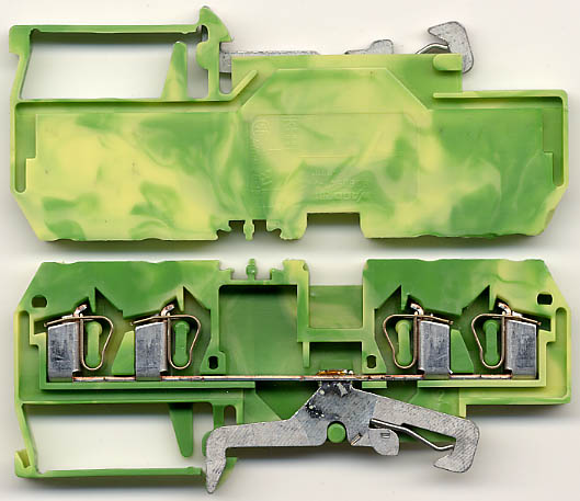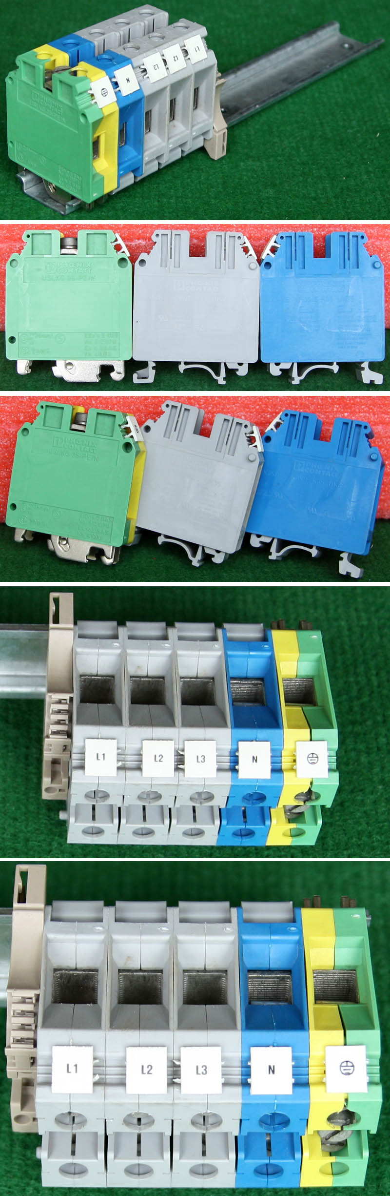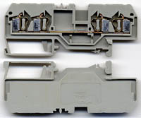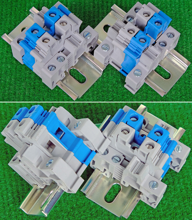 型号:typ UK 10N,电压600V,电流65A,导轨按装式,每组3只连在一起,拆掉中间的连接铜条可分为独立3个单元,重量约61克。 |