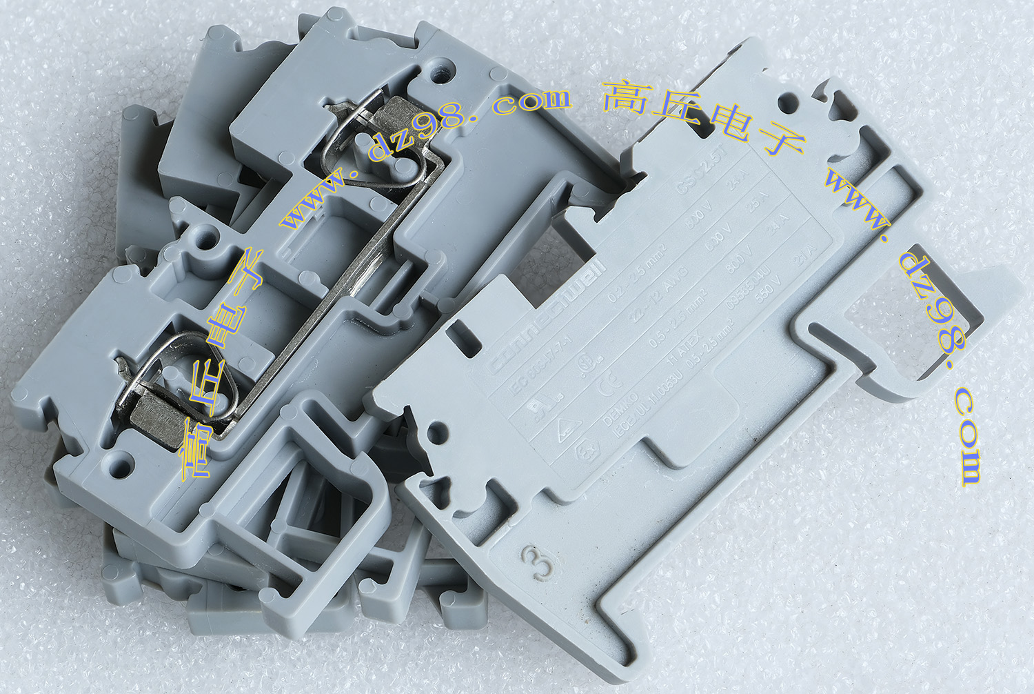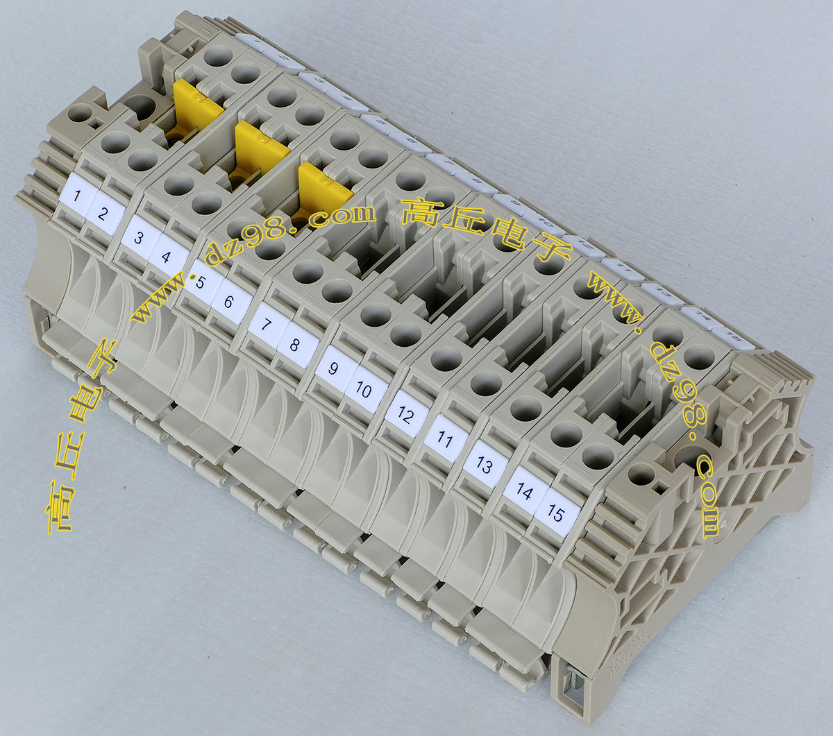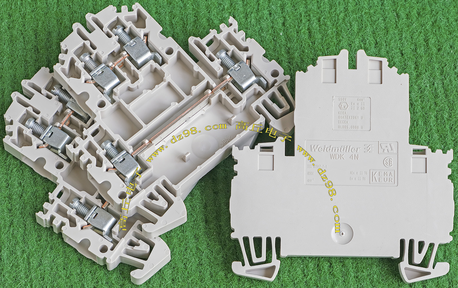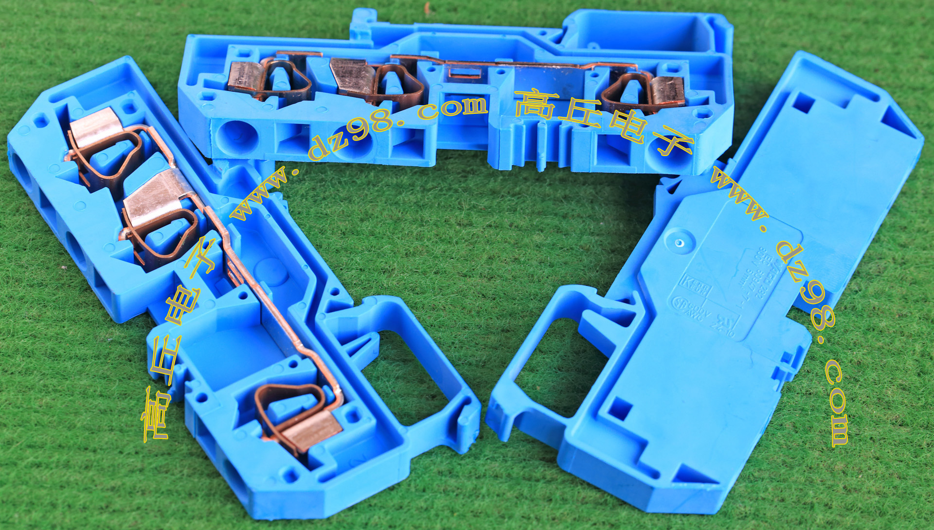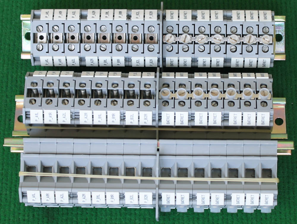 型号:typ UK 10N,电压600V,电流65A,导轨按装式,每组3只连在一起,拆掉中间的连接铜条可分为独立3个单元,重量约61克。 |