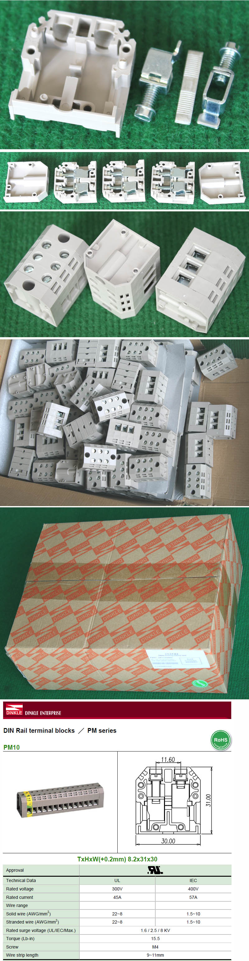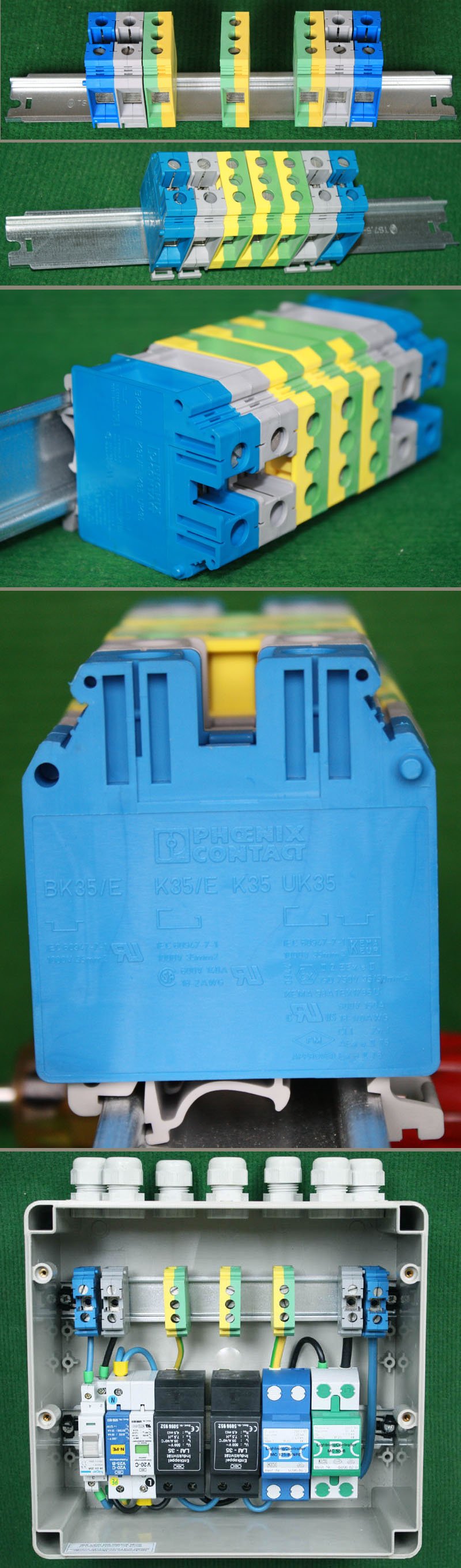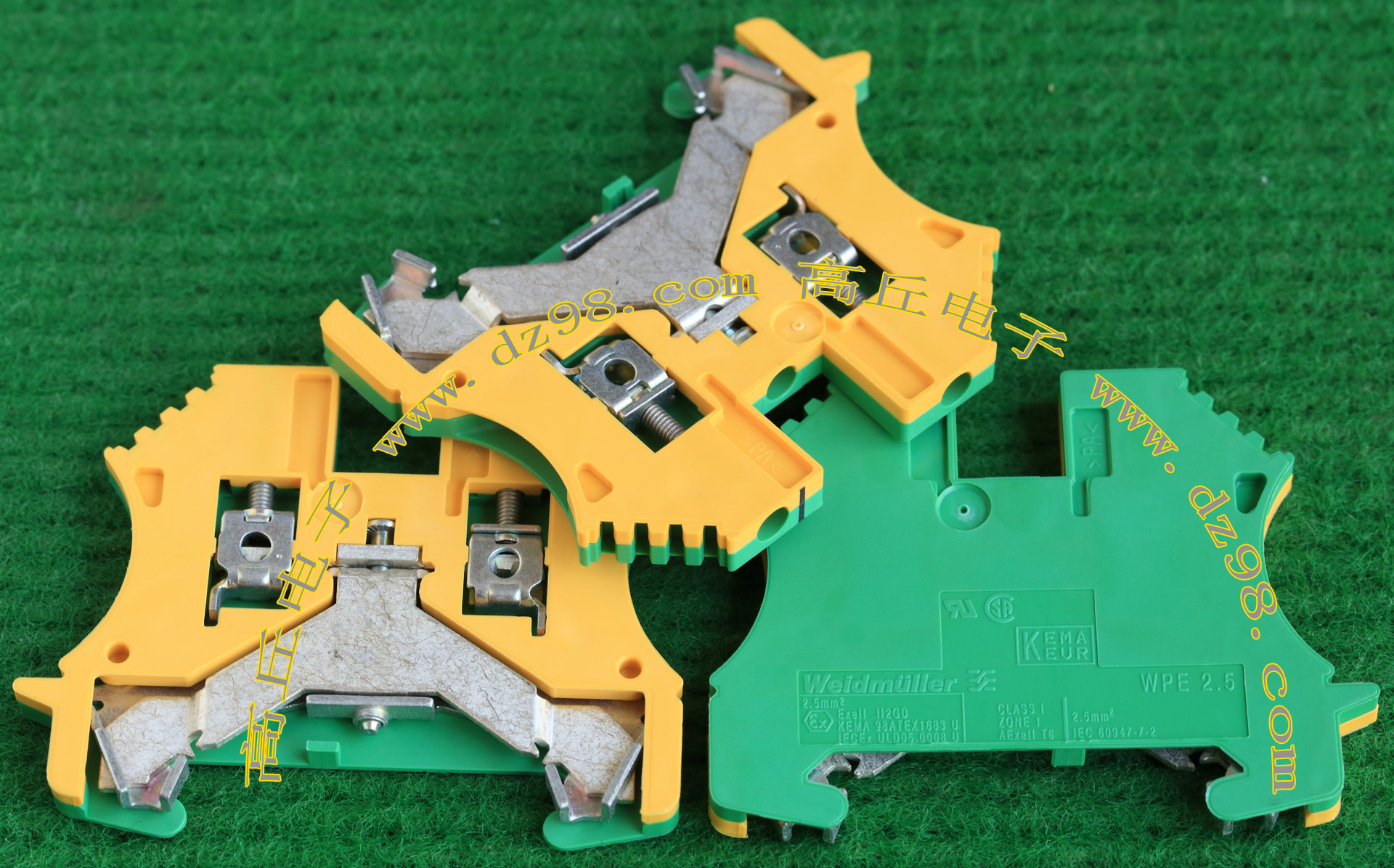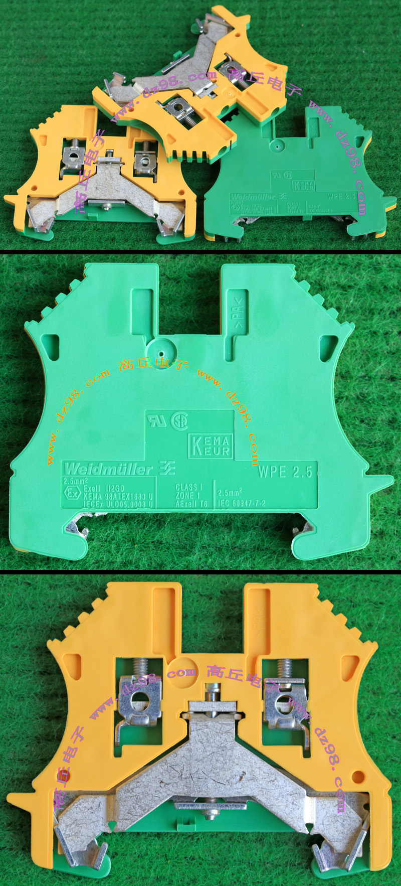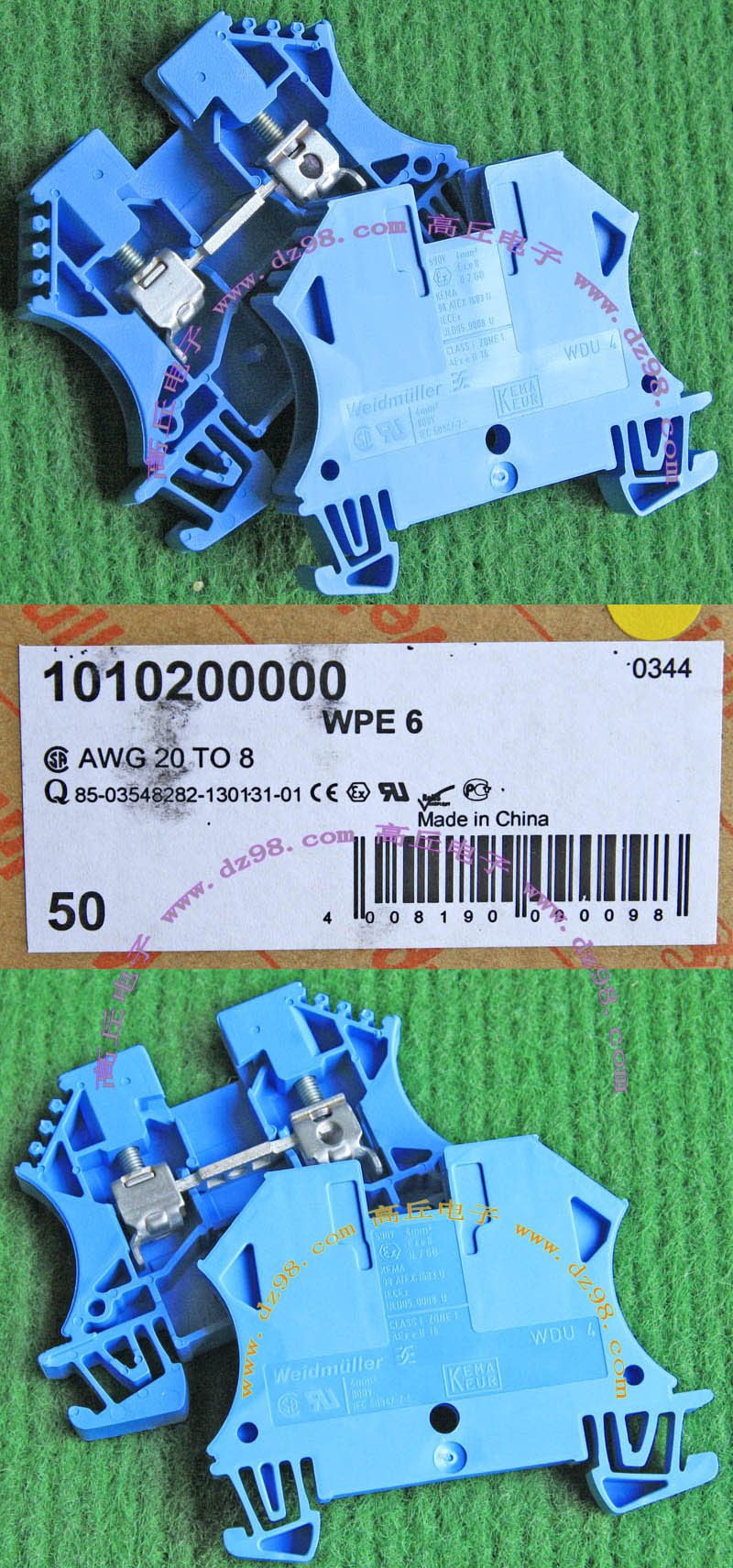 型号:typ UK 10N,电压600V,电流65A,导轨按装式,每组3只连在一起,拆掉中间的连接铜条可分为独立3个单元,重量约61克。 |