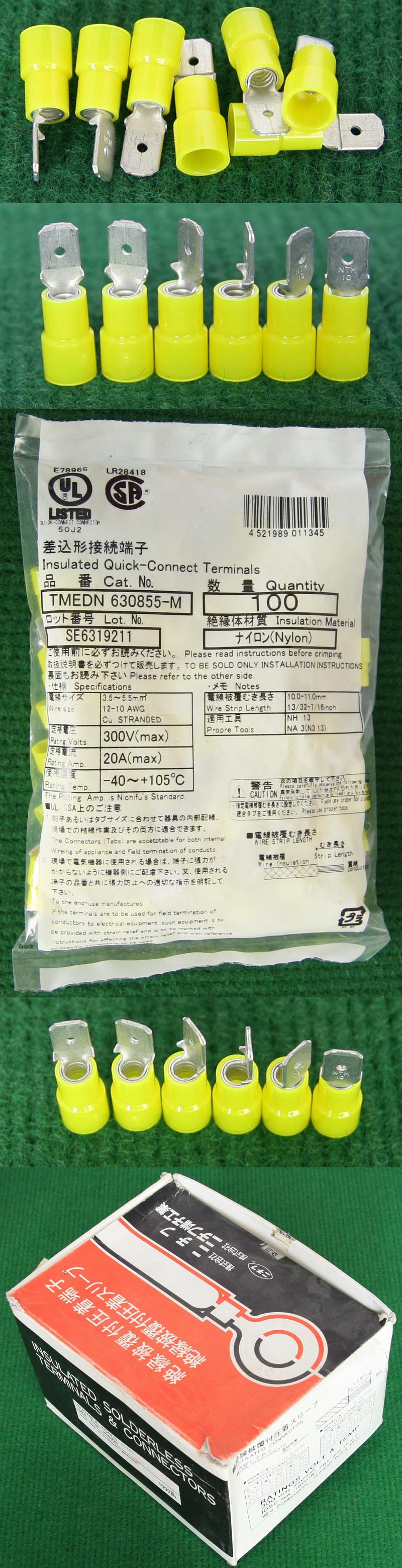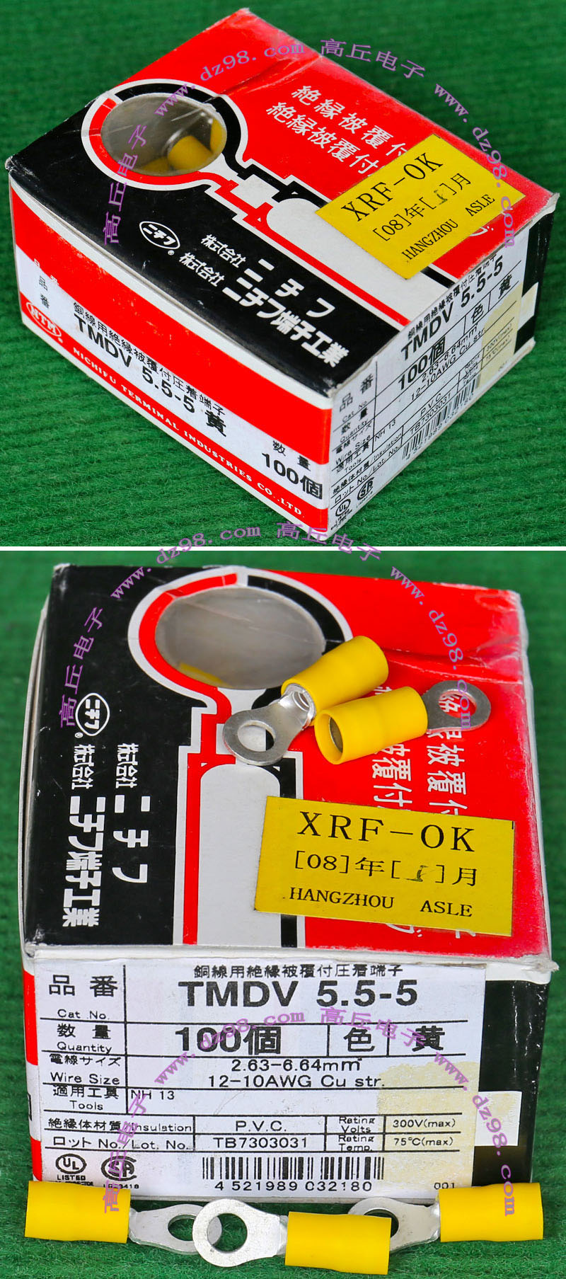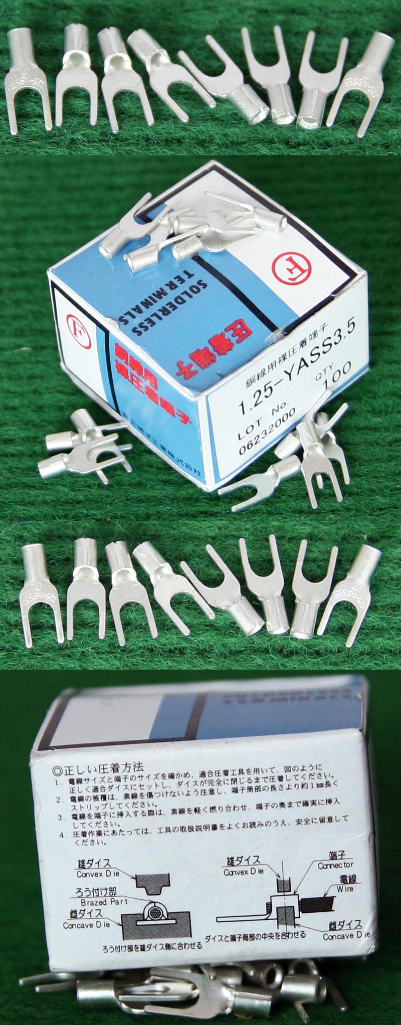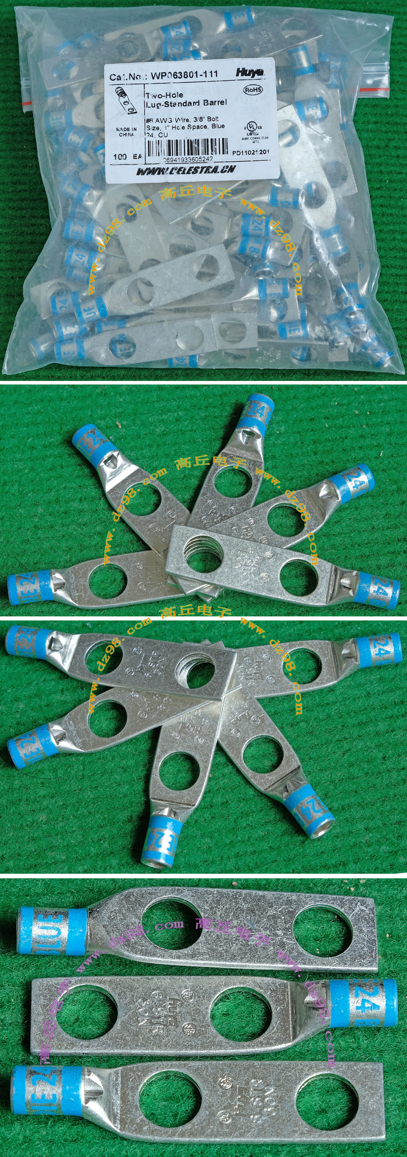 全新库存,外形尺寸:长度33.5mm、安装头孔直径6.4mm, 安装头宽度12mm,铜材厚度1.2mm,压线处内孔直径5.5mm,每只重量约7.2克。 |