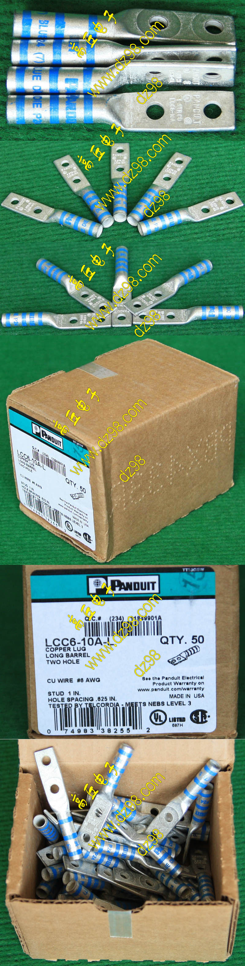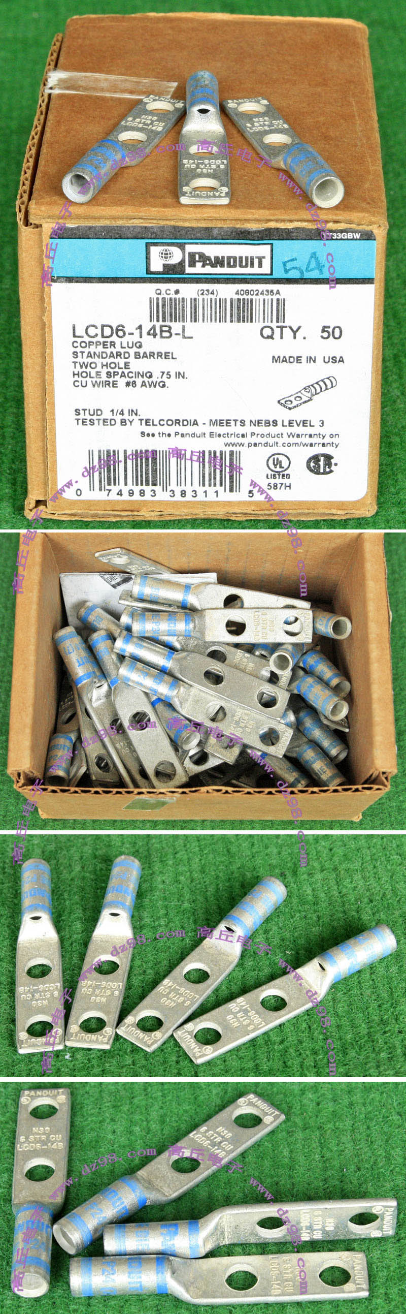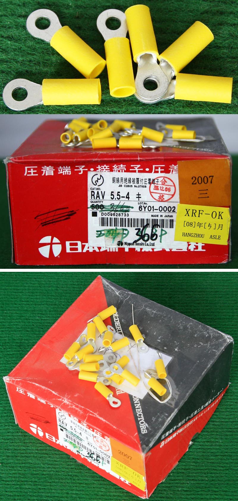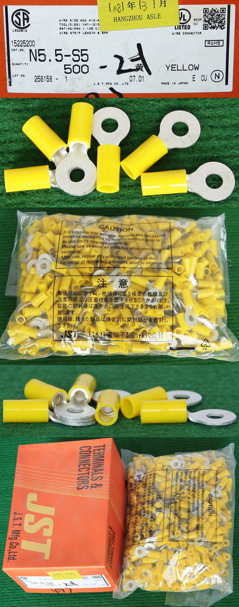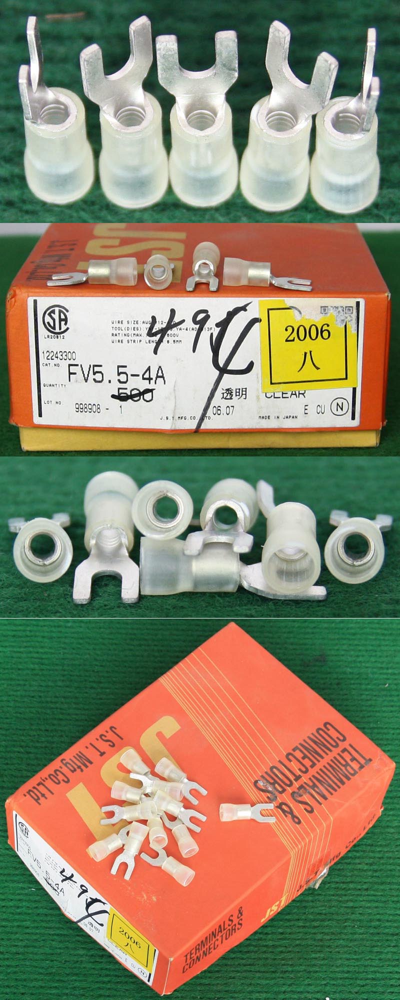 全新库存,外形尺寸:长度33.5mm、安装头孔直径6.4mm, 安装头宽度12mm,铜材厚度1.2mm,压线处内孔直径5.5mm,每只重量约7.2克。 |