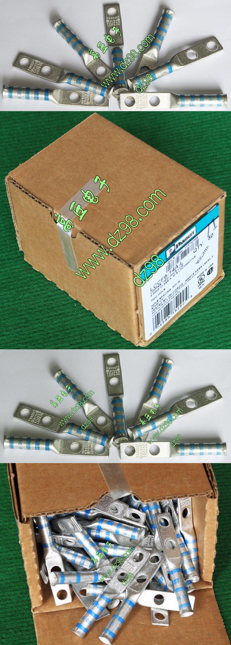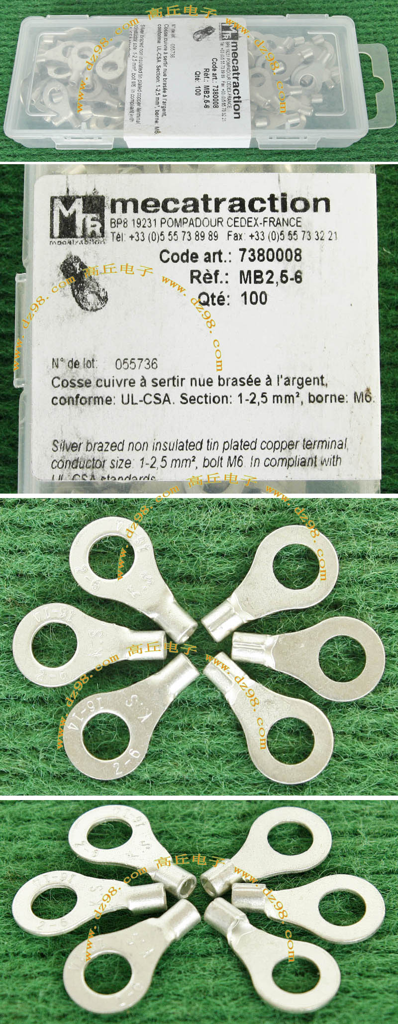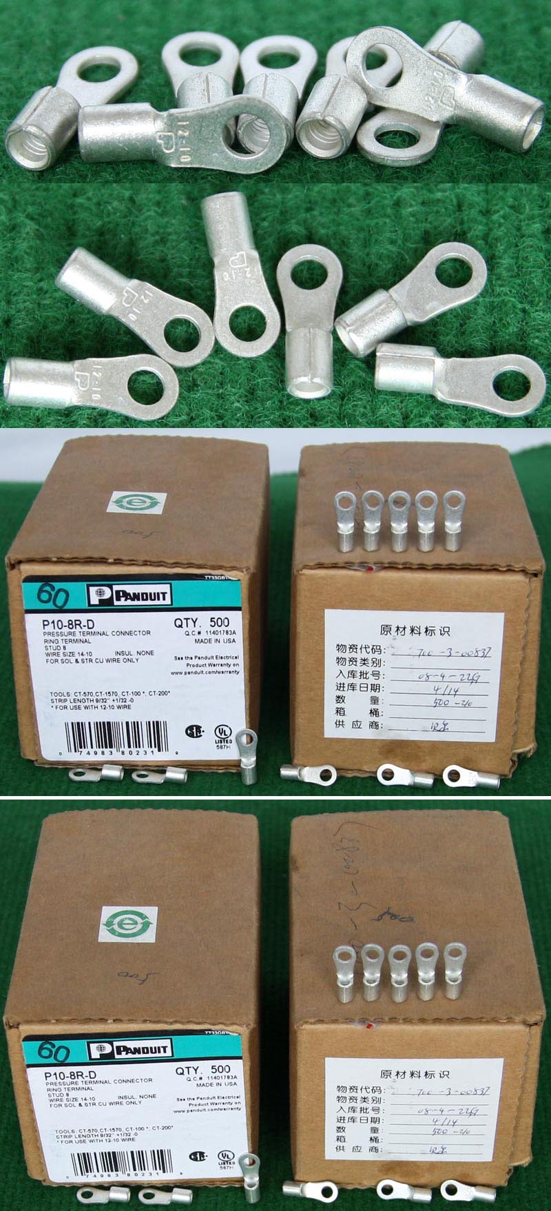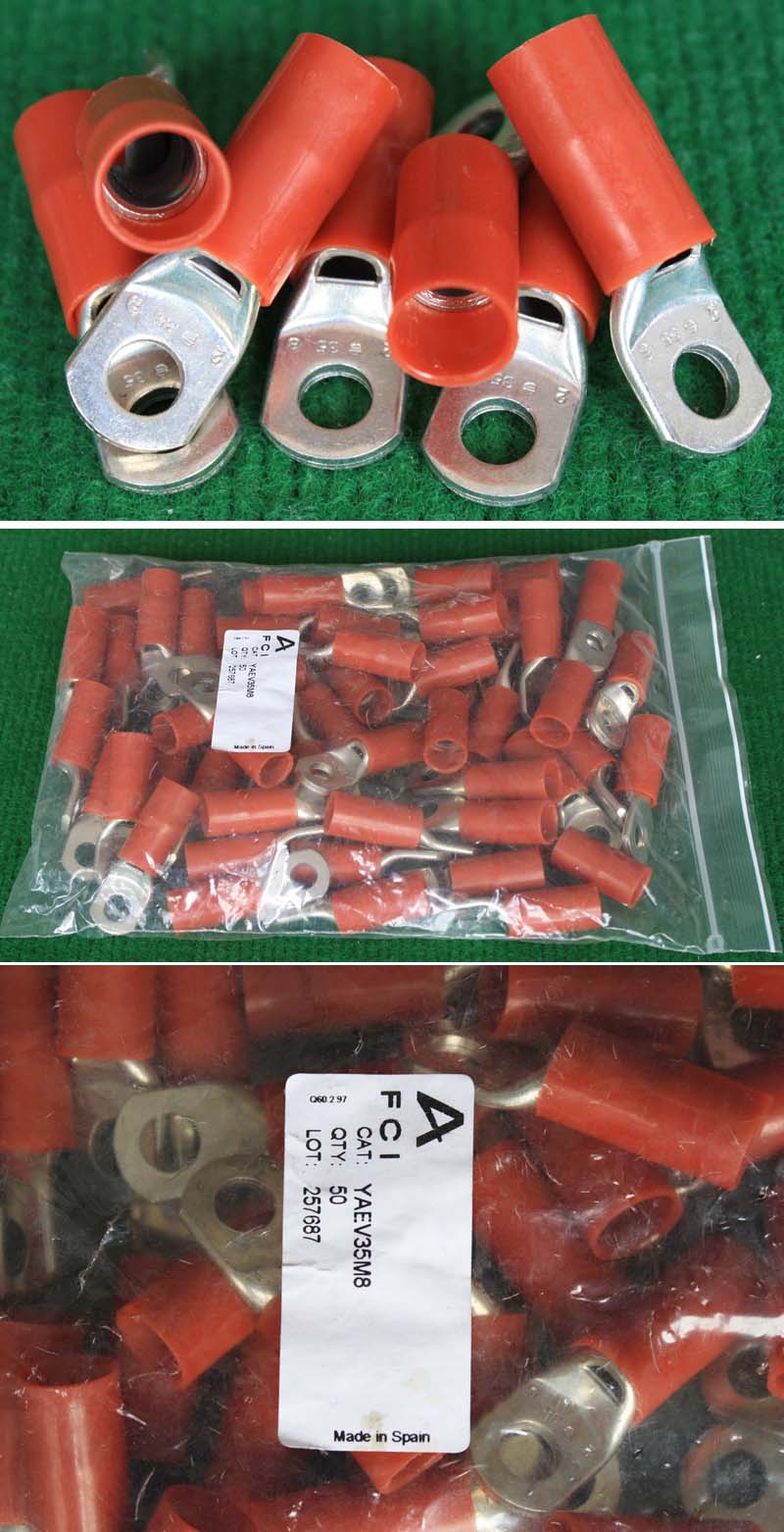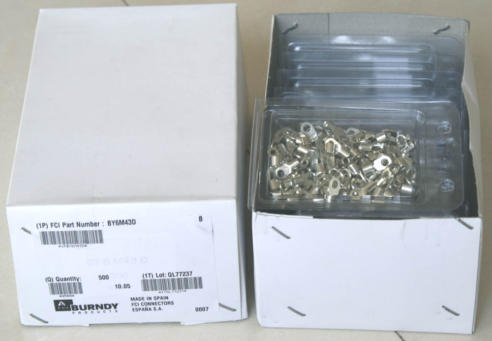 全新库存,产地:SPAIN,品牌:FCI-BURNDY,外形尺寸:长度17.8mm、圆头内孔直径4.3mm,圆头内孔外径7.8mm,铜材厚度1mm,压线处内孔直径3.5mm,每100只带小塑料包装盒重量约148克。 |
