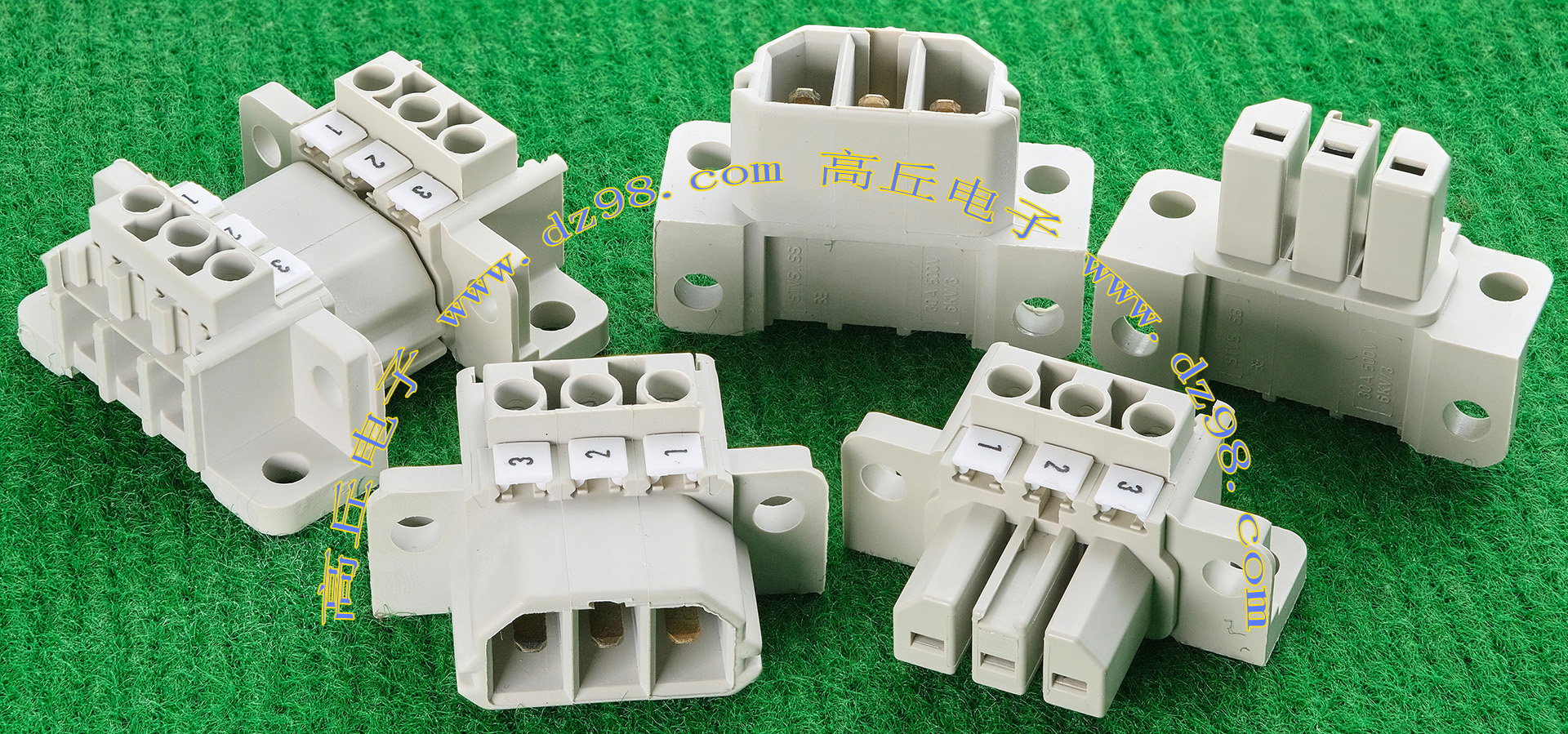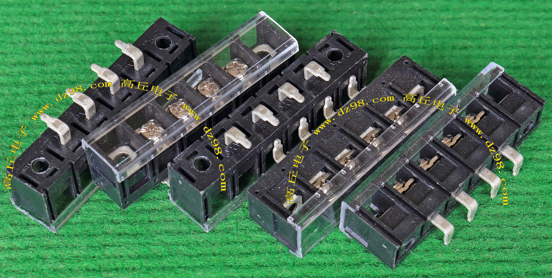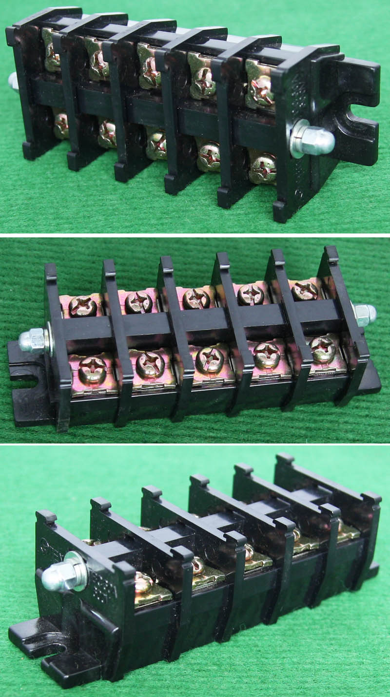 全新5档焊板式接线端子,长度57.4mm,宽度22.7mm,高度17.5mm,脚距11.11mm,通过电流30A。 |