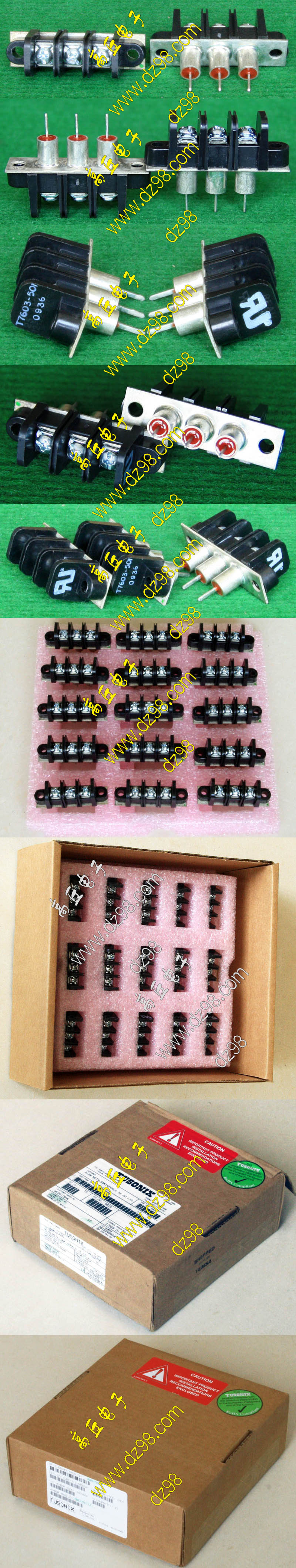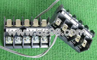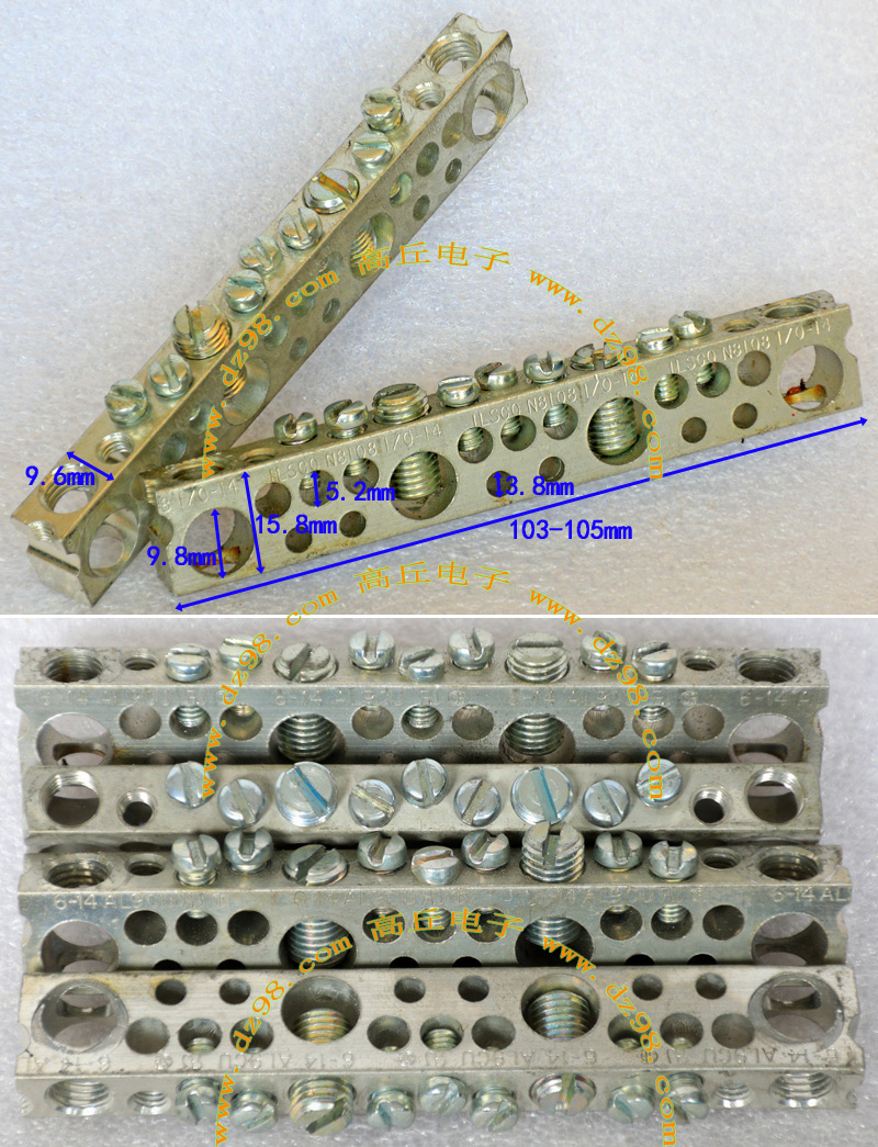 全新6档焊板式接线端子,长度68.5mm,宽度18mm,高度15mm,脚距9.5mm。 |