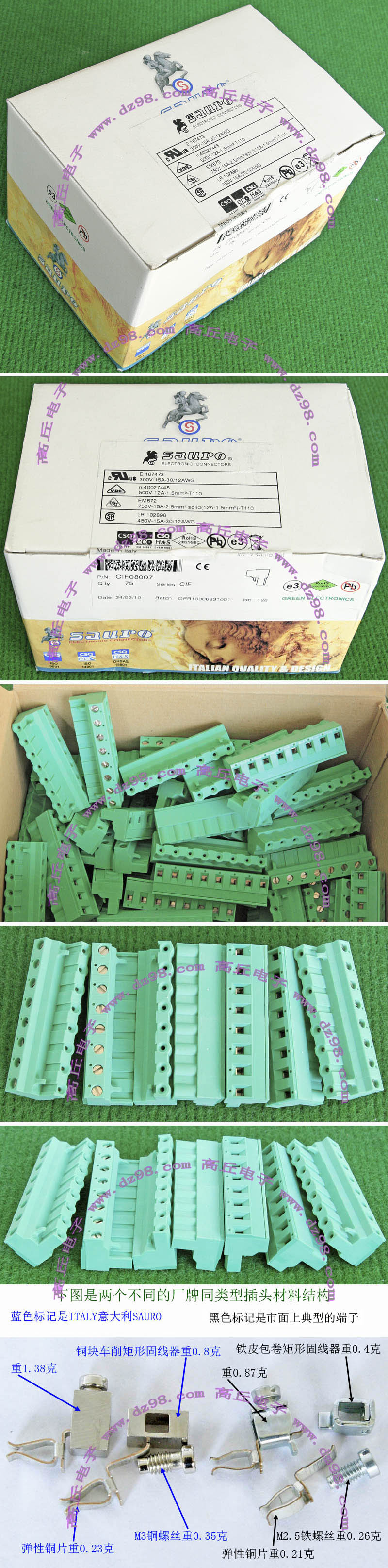 全新5档焊板式接线端子,长度49.3mm,宽度18mm,高度15mm,脚距9.5mm。 |
