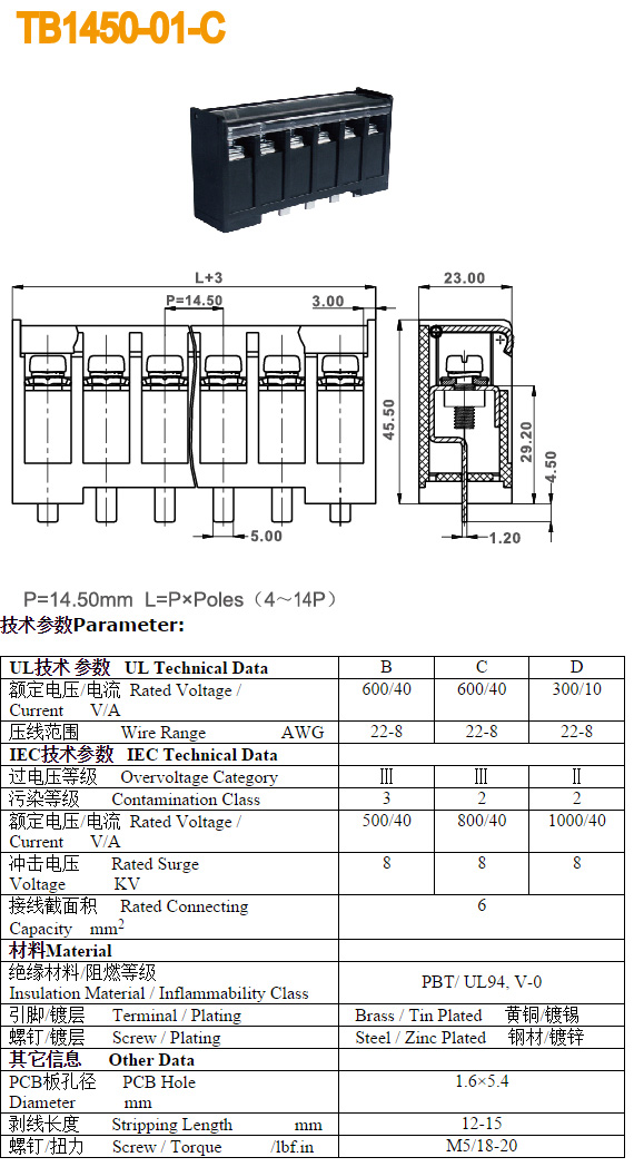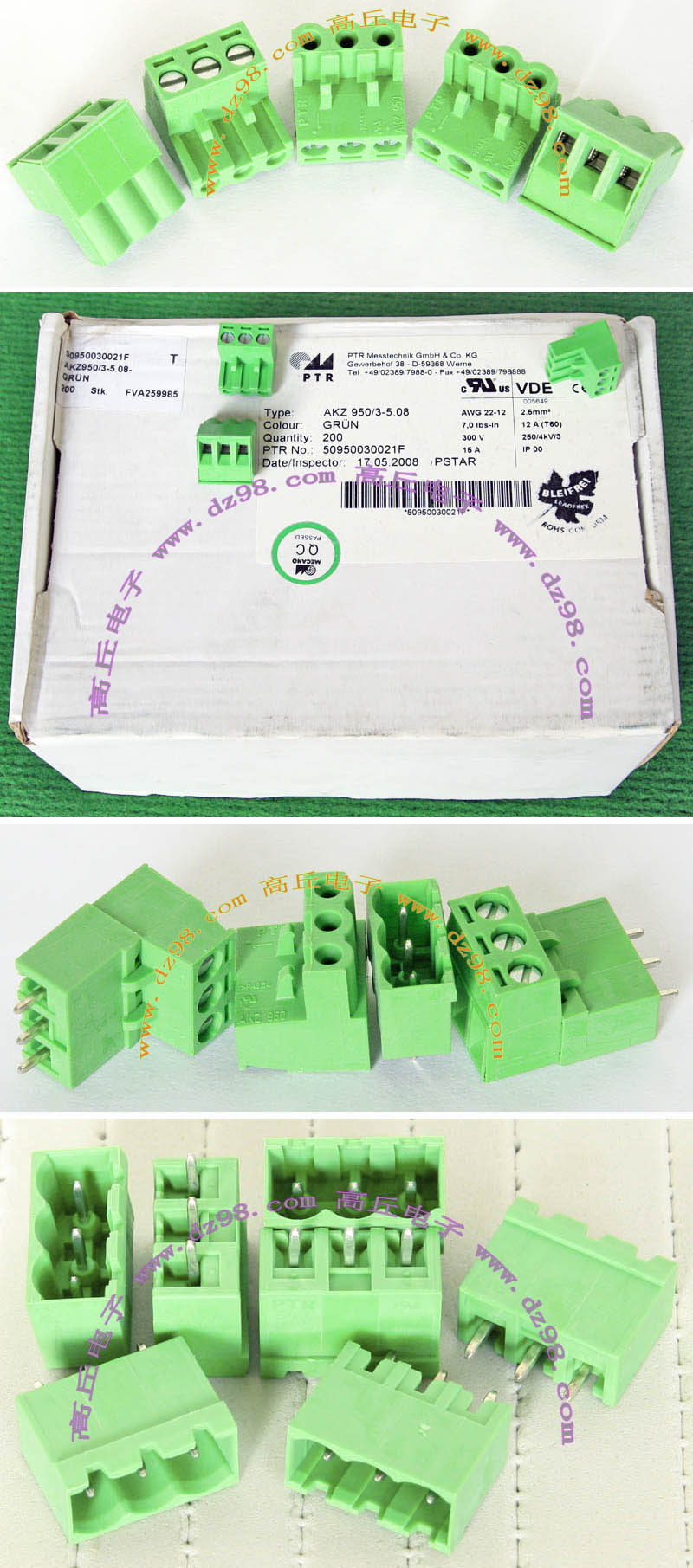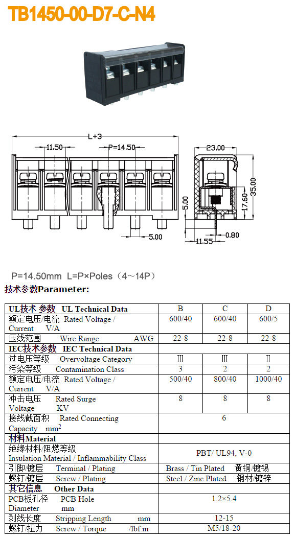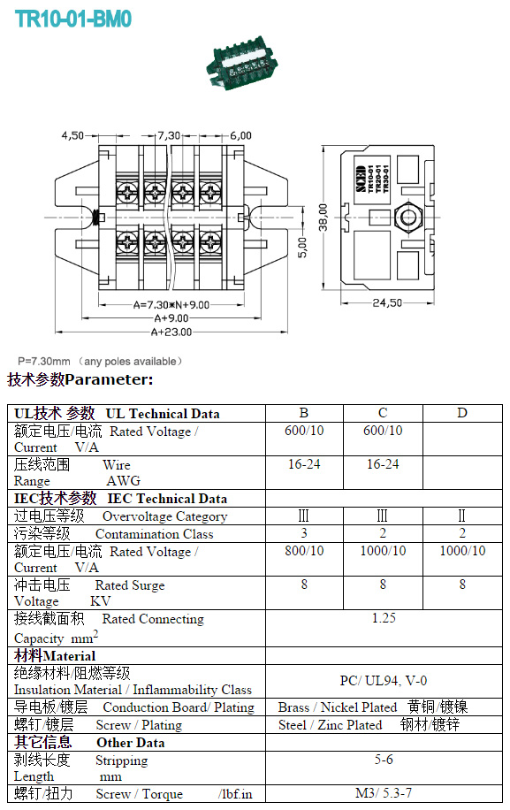 | ANYTEK ET7.62 4PGN VC7.62 4PGN 8-24WAG 300V 32A 4档接线端子BQD567 | 全新原装,实物看图片,插座采用电路板焊接安装,插头采用螺丝固定导线,使用导线规格;8-24AWG。对插重量约28.03克。 |