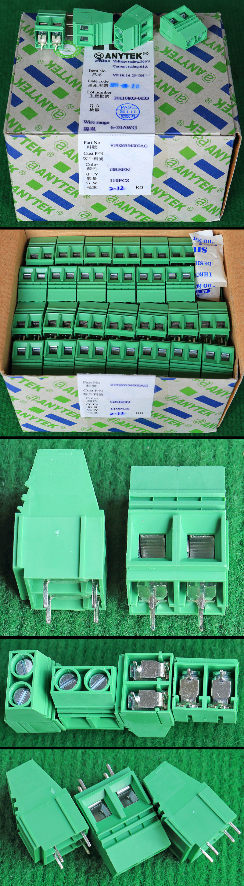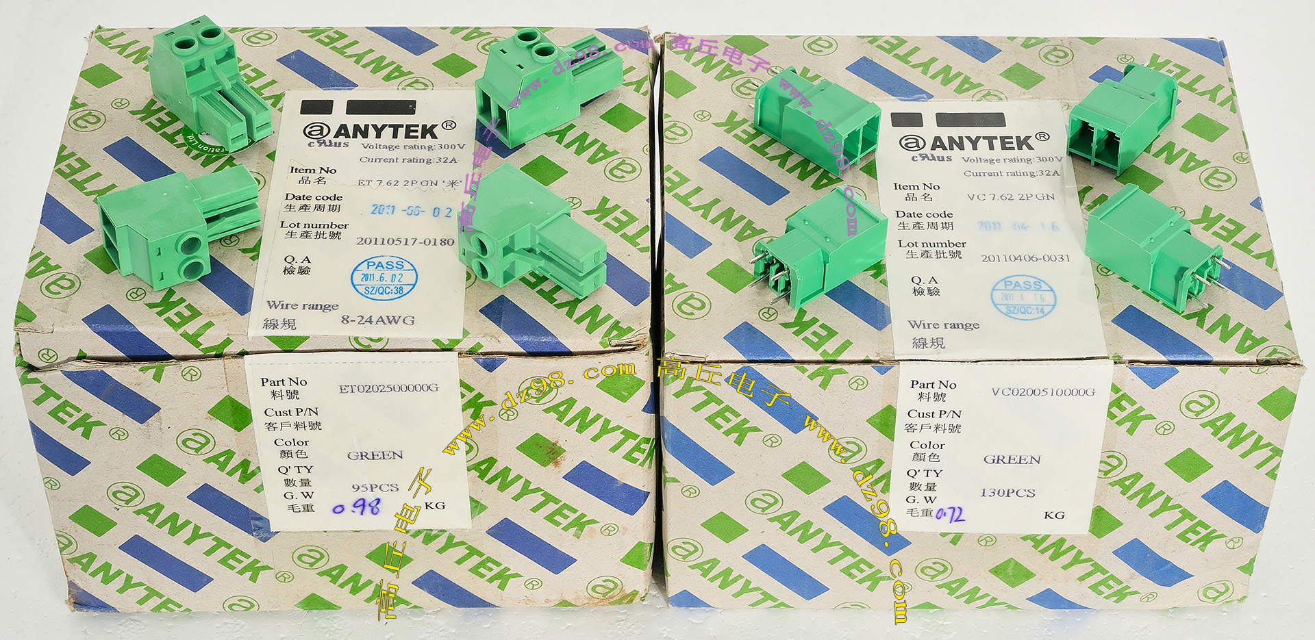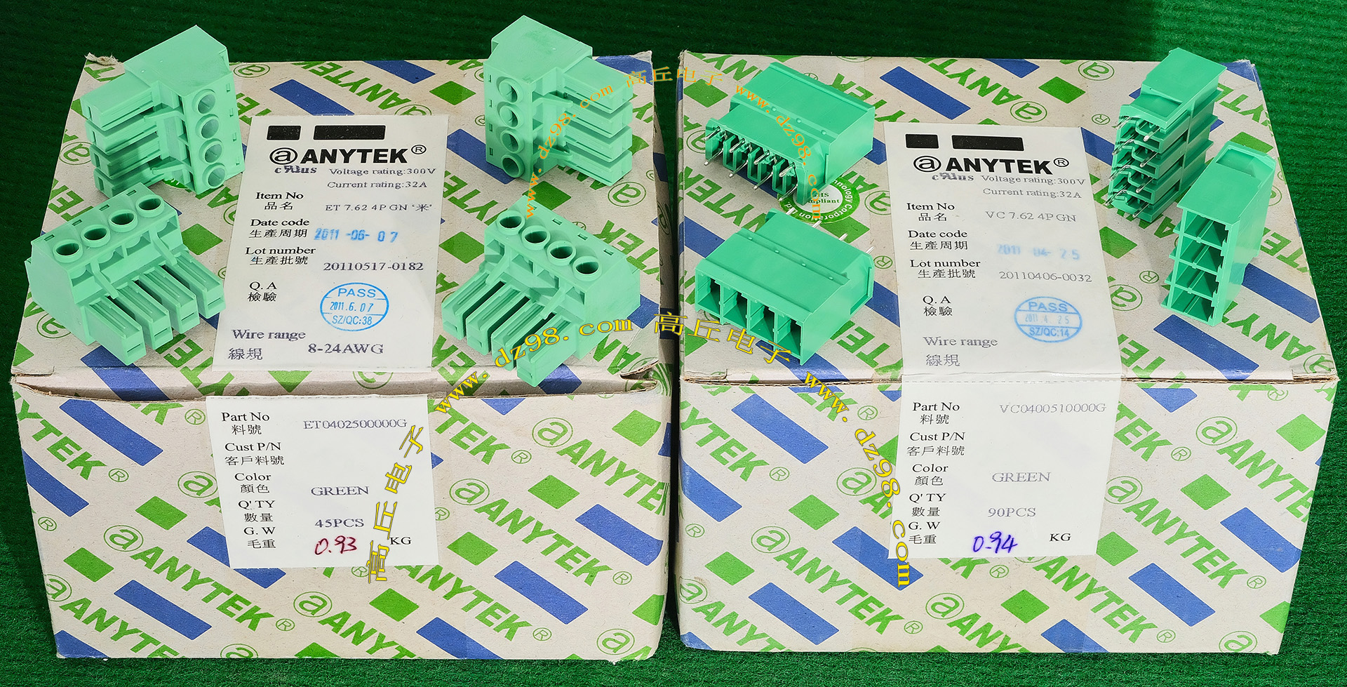 | ANYTEK ET7.62 2PGN VC7.62 2PGN 8-24WAG 300V 32A 2档接线端子BQD568 | 全新原装,实物看图片,插座采用电路板焊接安装,插头采用螺丝固定导线,使用导线规格;8-24AWG。对插重量约14.32克。 |