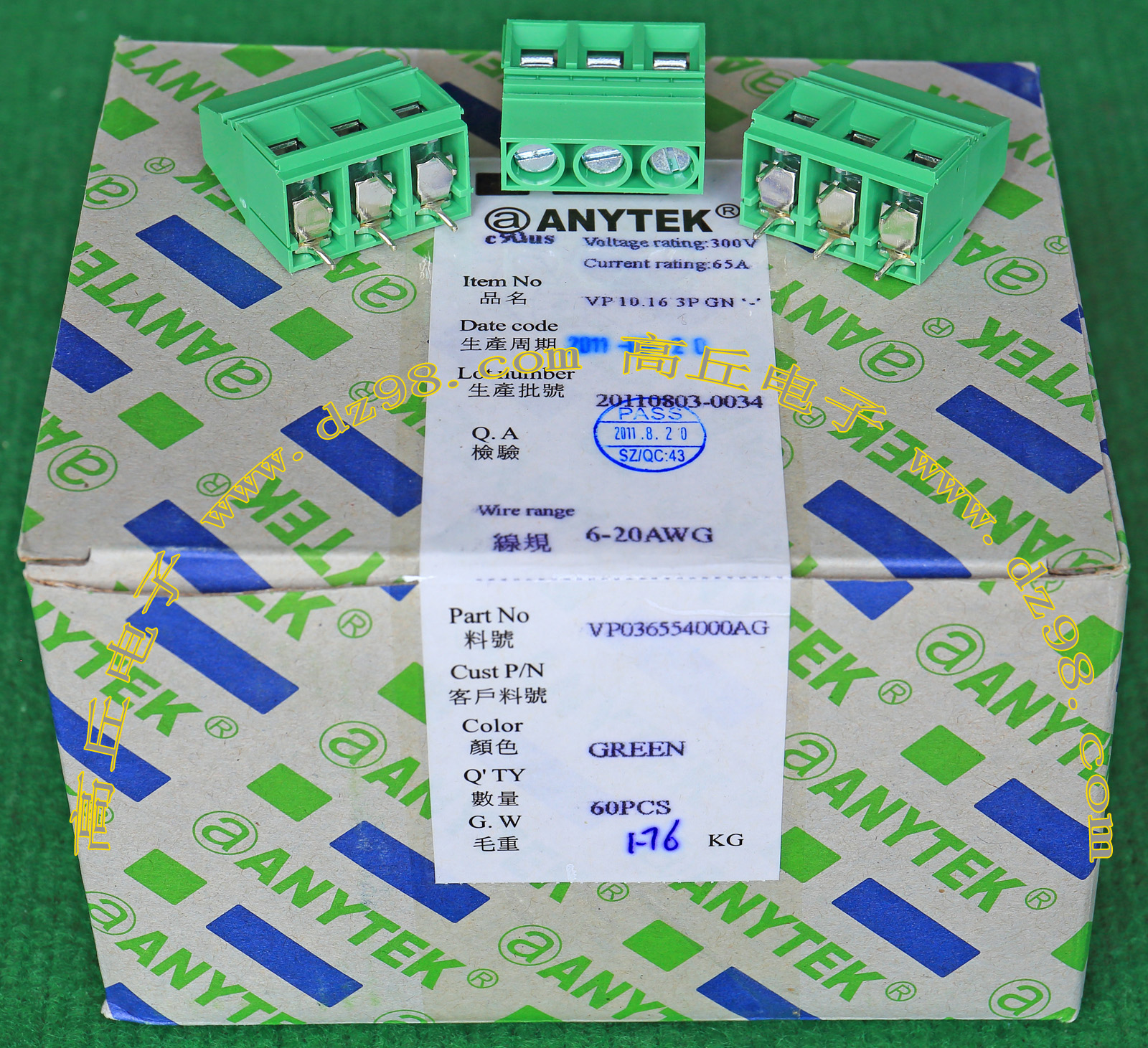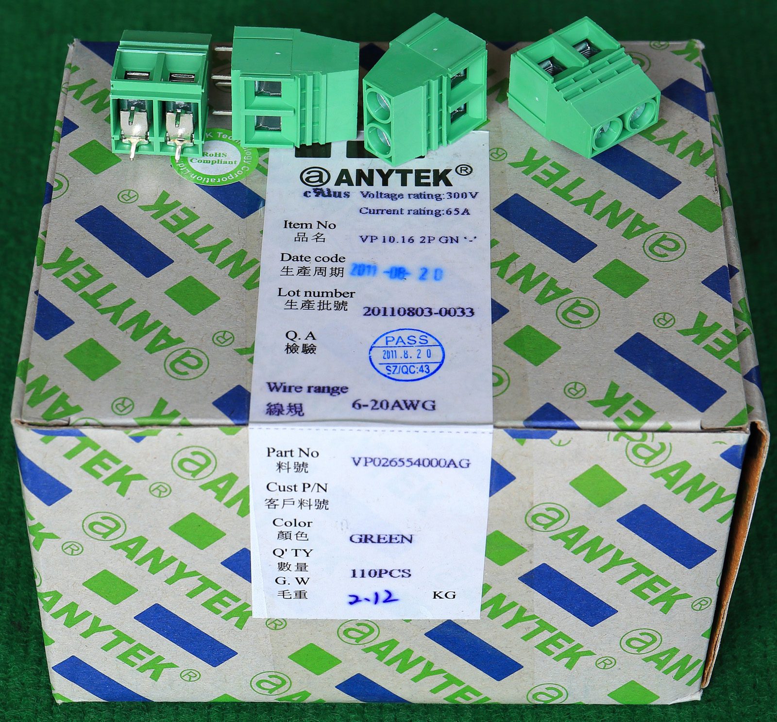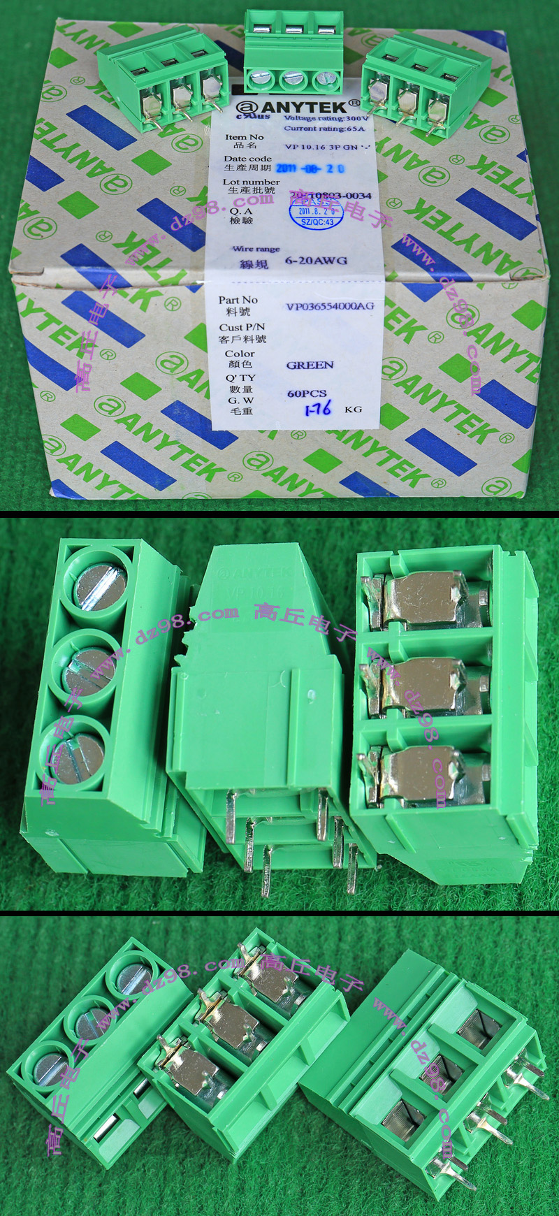 | ANYTEK ET7.62 2PGN VC7.62 2PGN 8-24WAG 300V 32A 2档接线端子BQD568 | 全新原装,实物看图片,插座采用电路板焊接安装,插头采用螺丝固定导线,使用导线规格;8-24AWG。对插重量约14.32克。 |