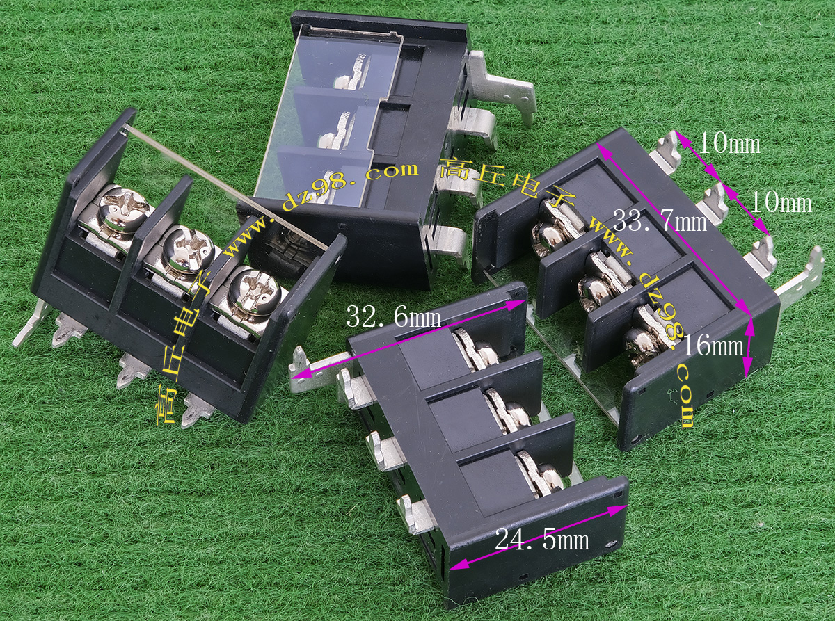 全新5档焊板式接线端子,长度42.8mm,宽度15.4mm,高度12.9mm,脚距8.25mm,通过电流20A。 |